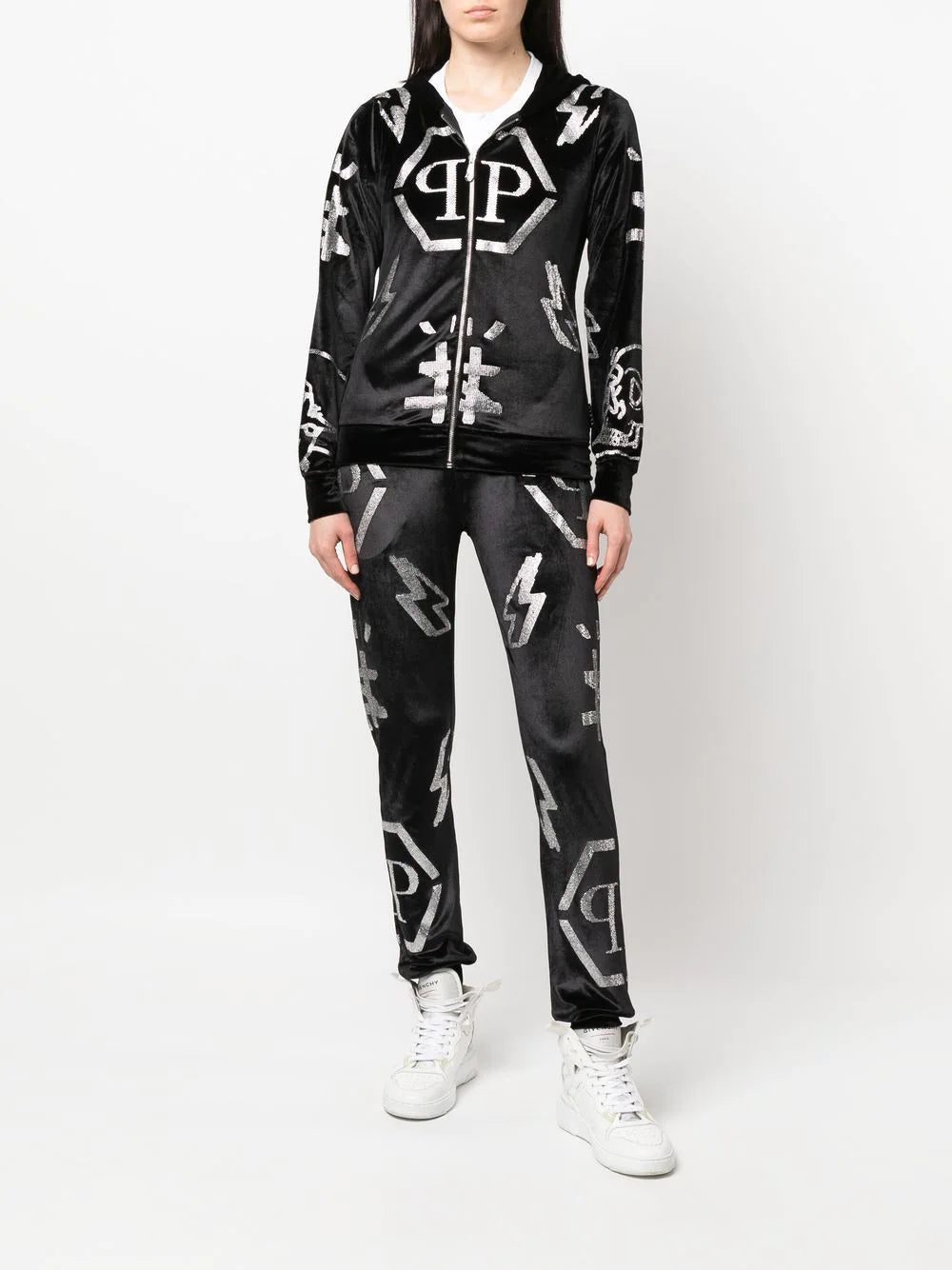 logo-studded hoodie tracksuit from PHILIPP PLEIN featuring jet black, cotton, velvet finish, silver-tone stud embellishment, classic hood, front zip fastening, long sleeves, straight hem, drawstring waist and elasticated ankles.