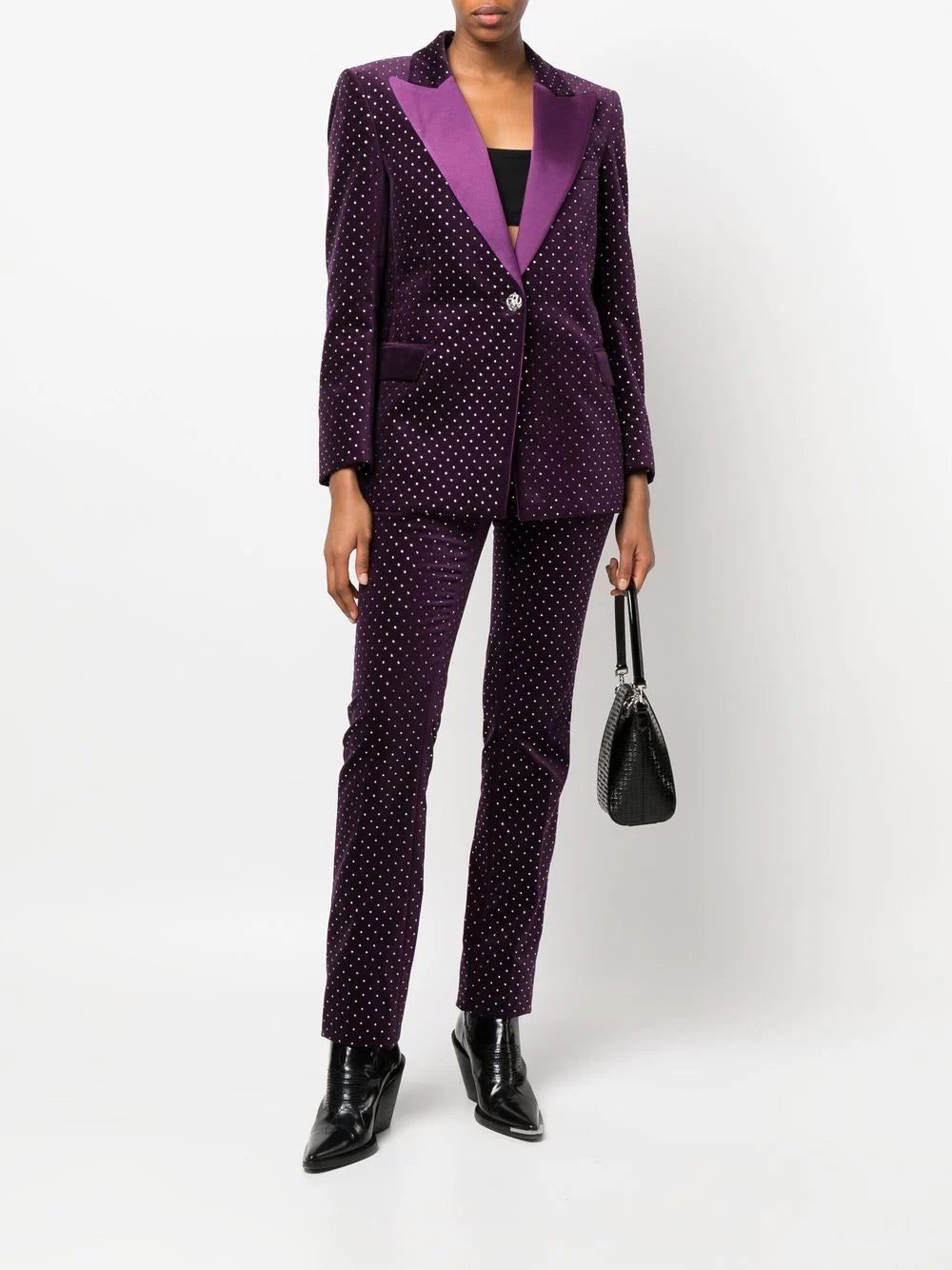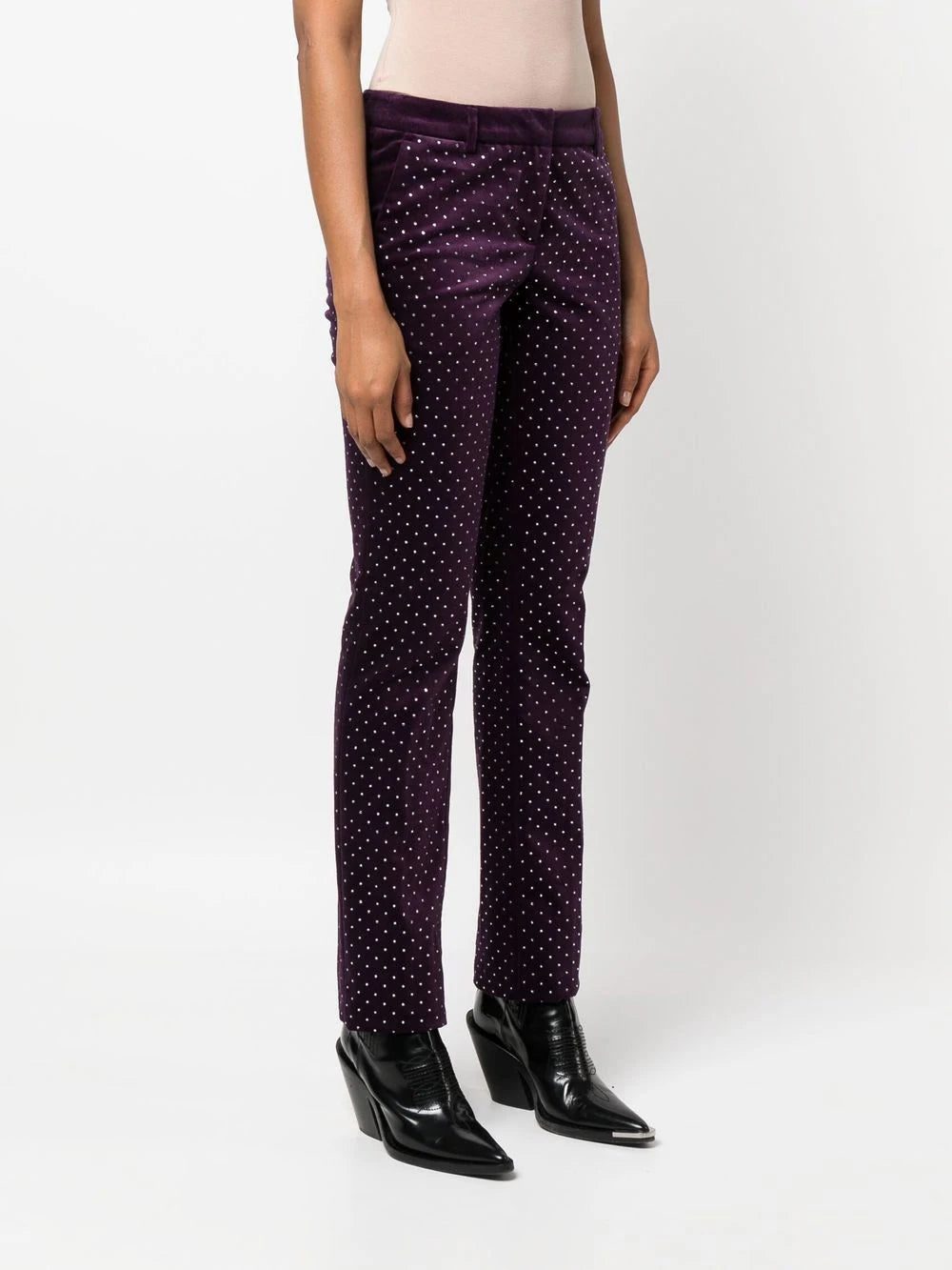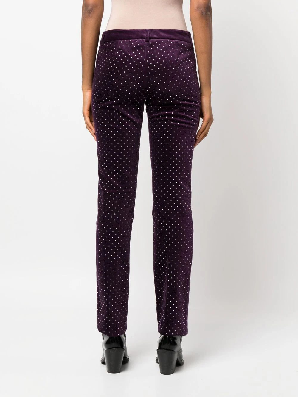 Office crystal-embellished trousers from PHILIPP PLEIN featuring purple, cotton, velvet finish, crystal embellishment, straight leg, concealed front fastening and belt loops.