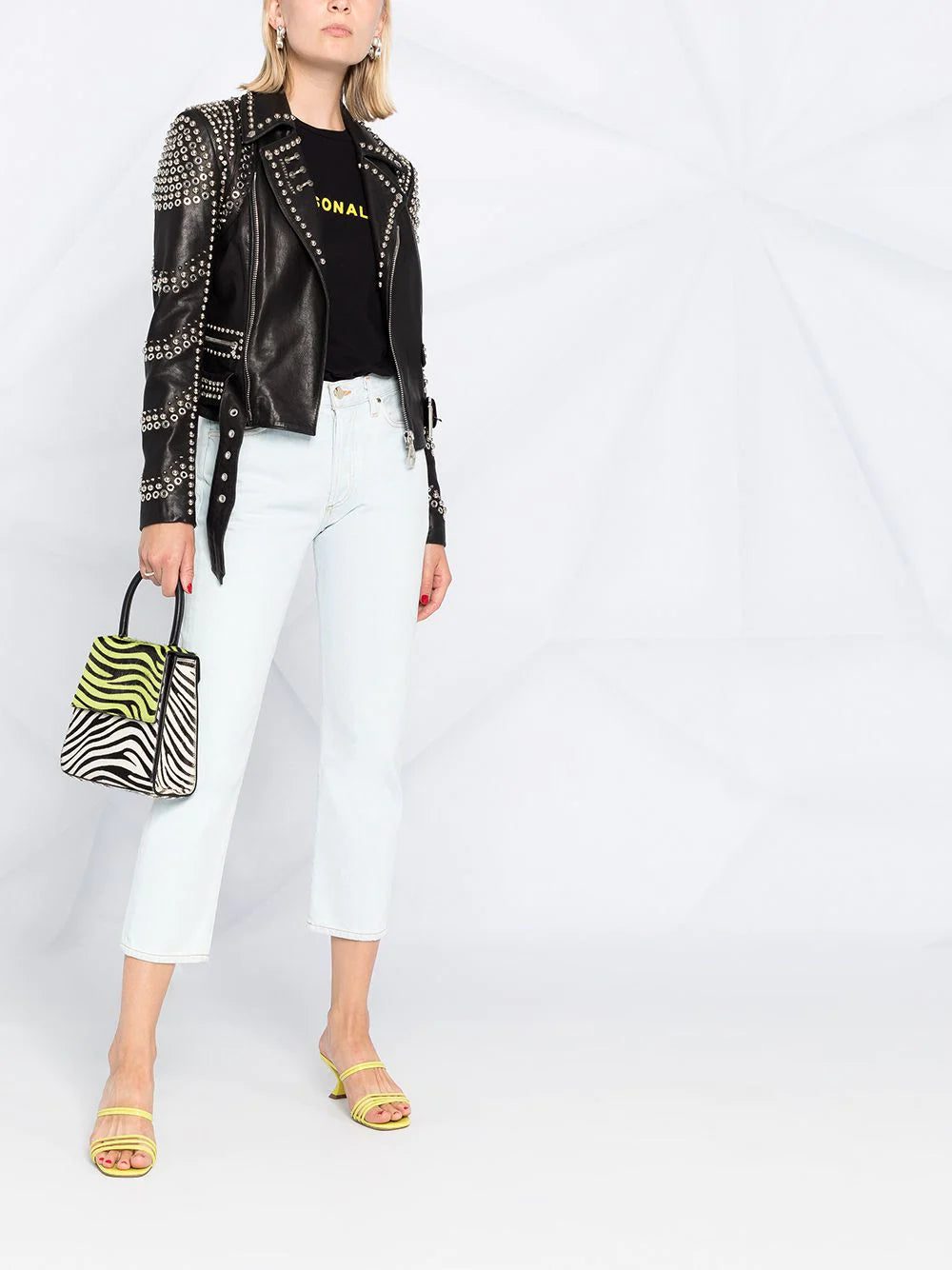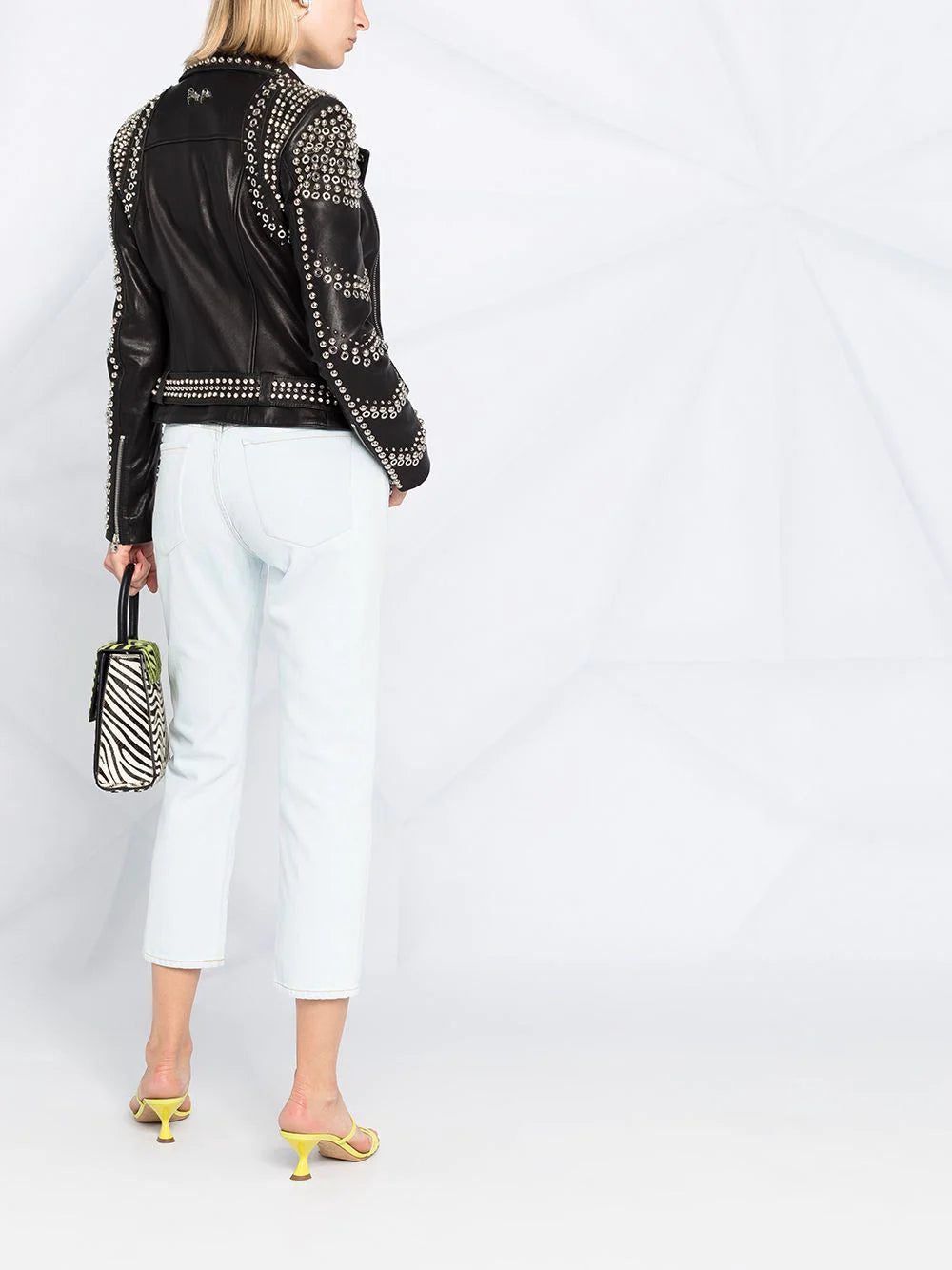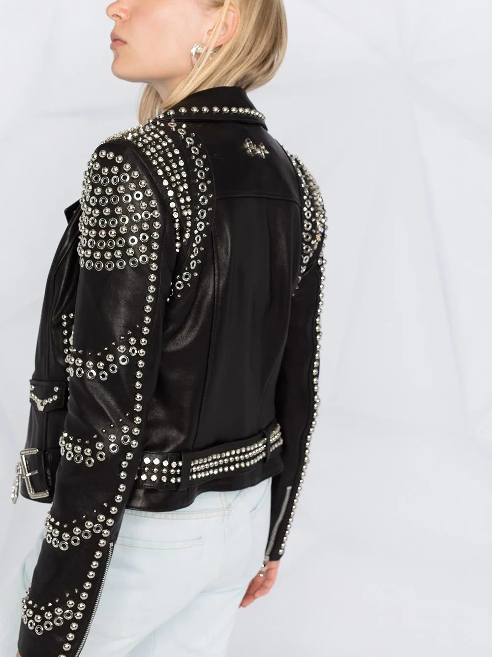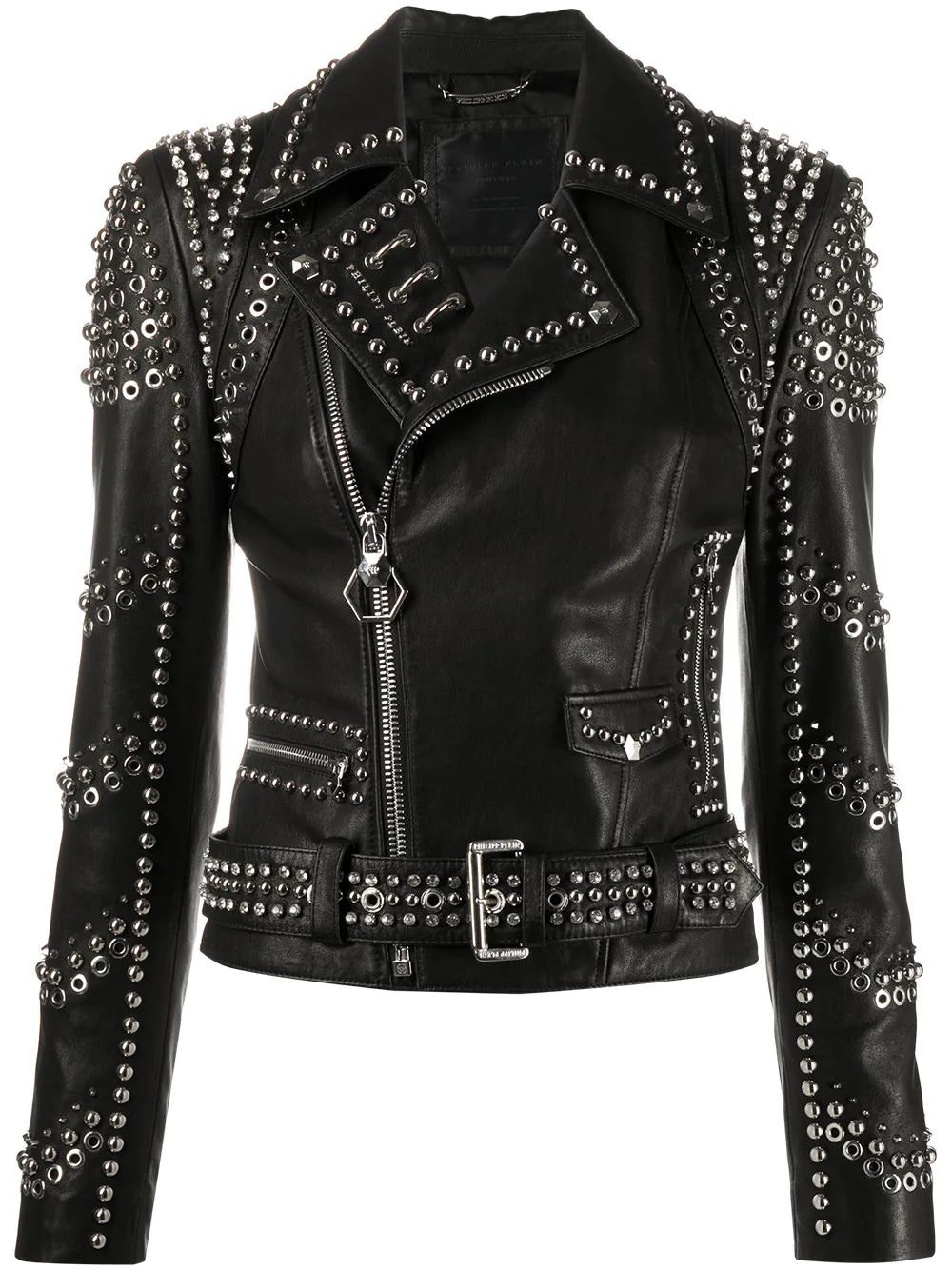 Black lambskin pierced biker jacket from Philipp Plein featuring silver-tone stud detailing, eyelets, a front zip pocket, a coin pocket, notched lapels, long sleeves, a belted waist and an off-centre front zip fastening.