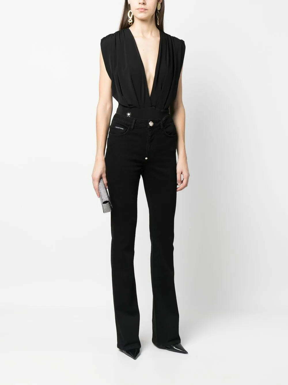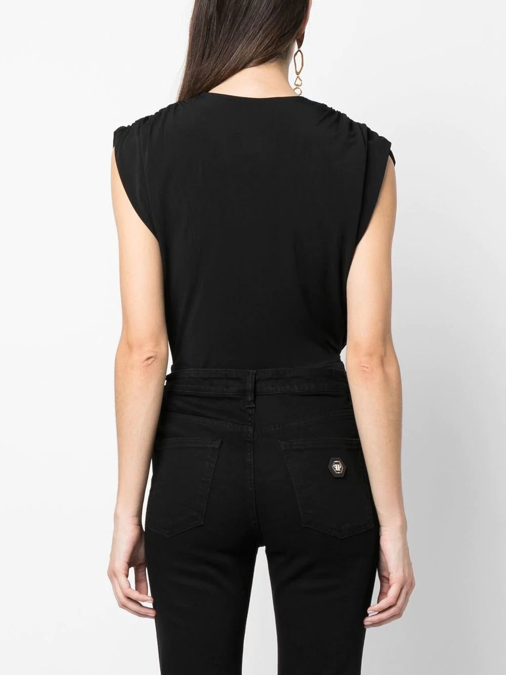 plunging v-neck bodysuit from PHILIPP PLEIN featuring jet black, stretch-design, plunging V-neck, gathered detailing, sleeveless and button fastening.