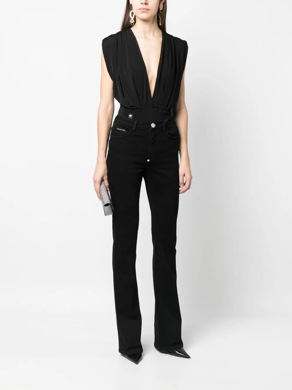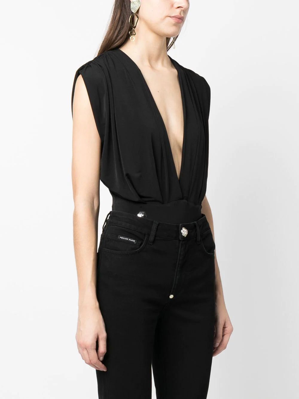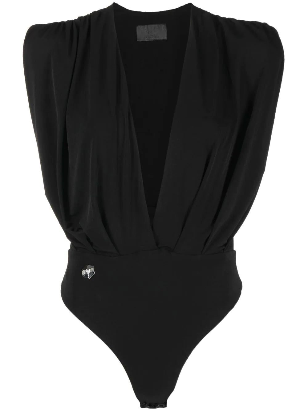 plunging v-neck bodysuit from PHILIPP PLEIN featuring jet black, stretch-design, plunging V-neck, gathered detailing, sleeveless and button fastening.