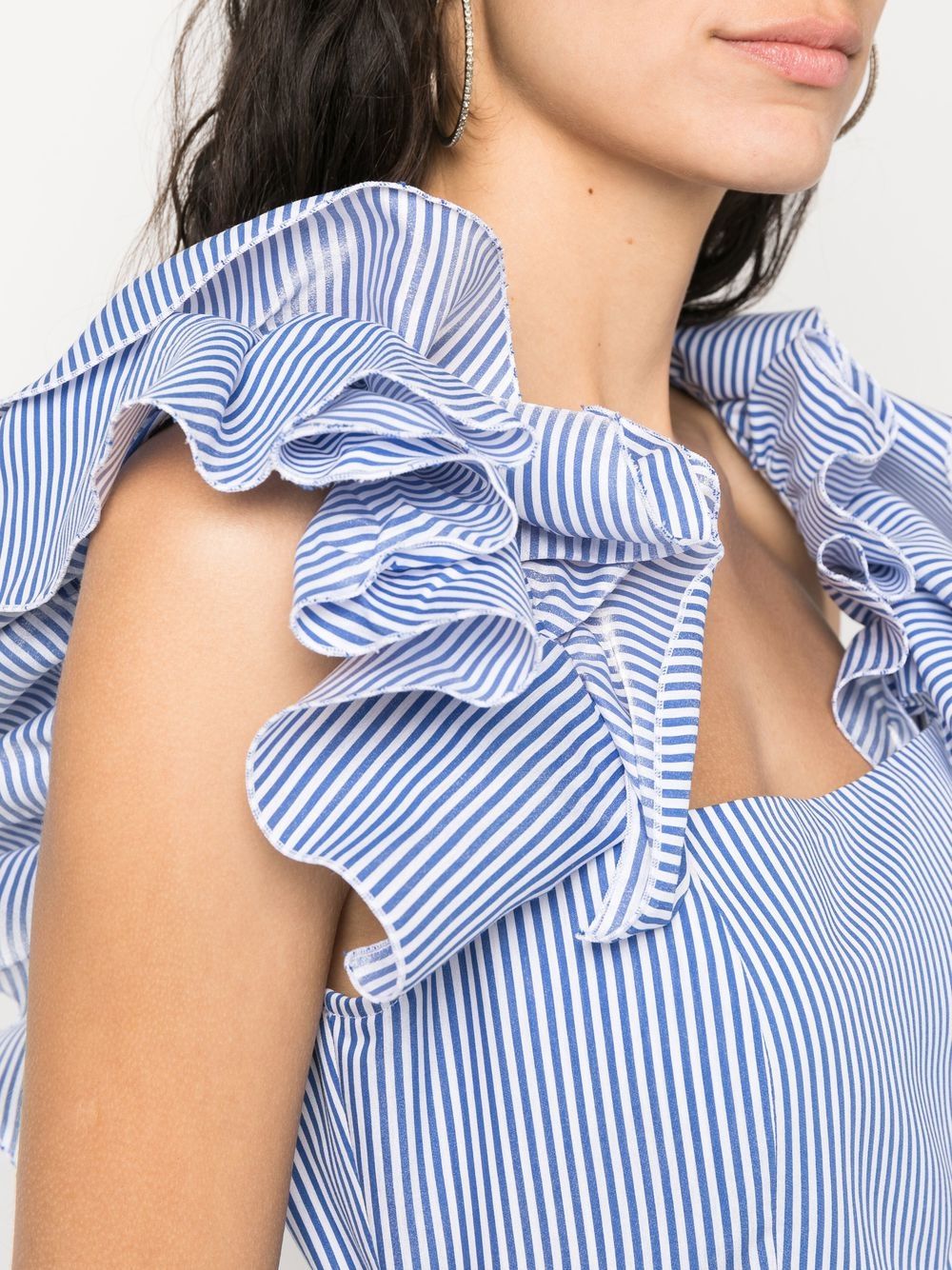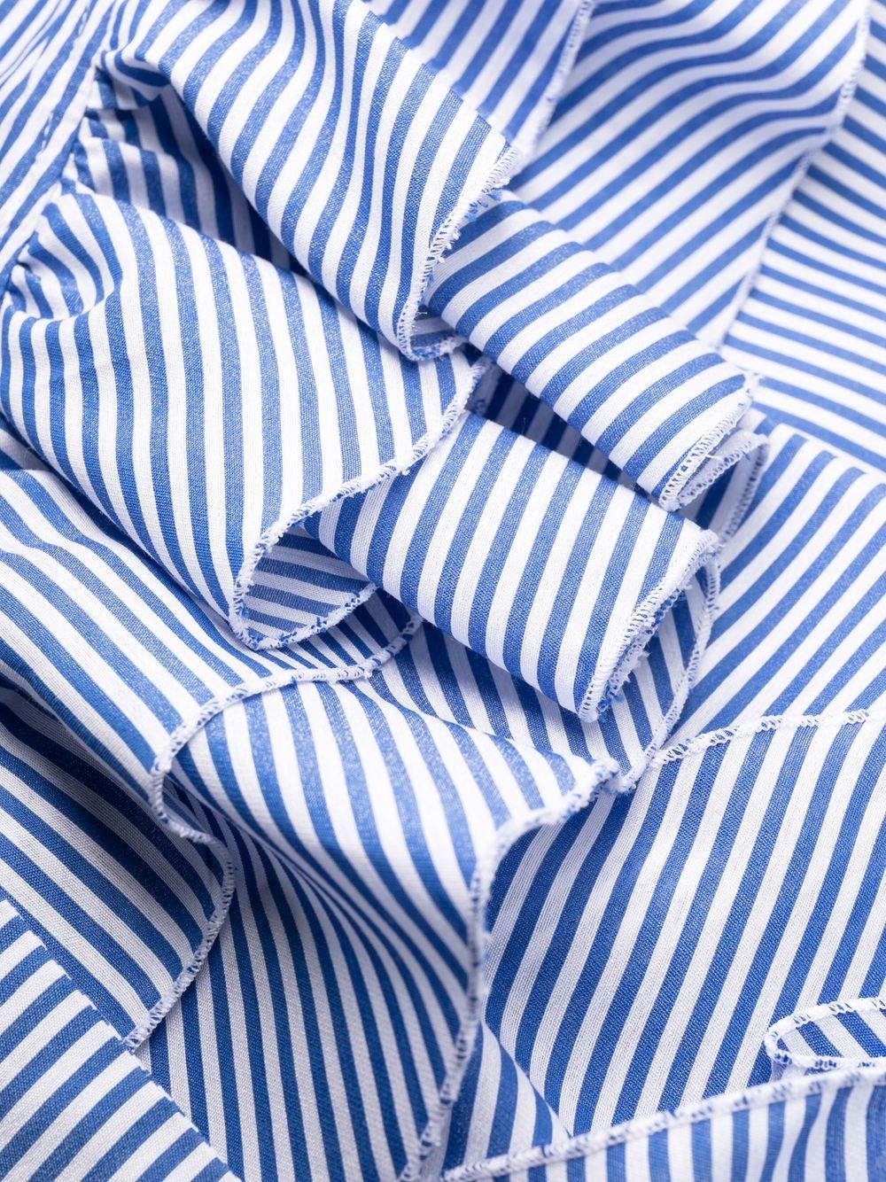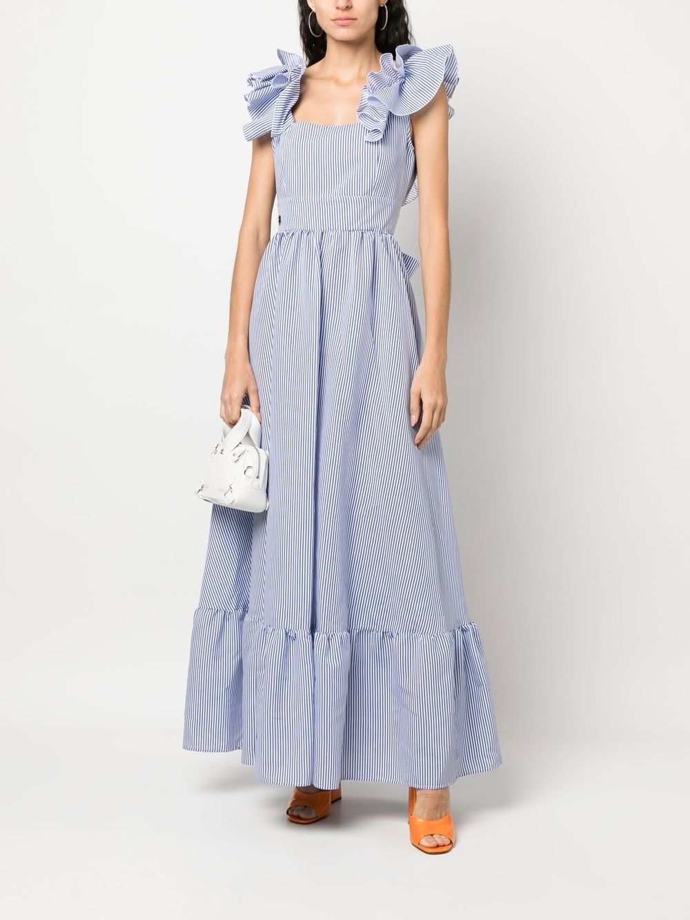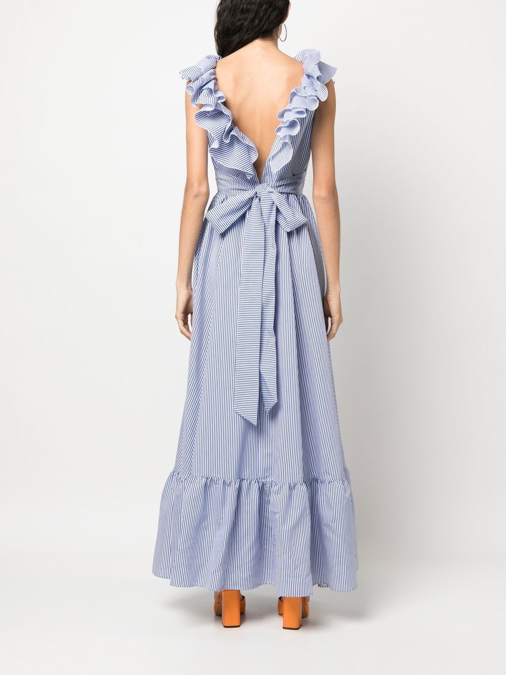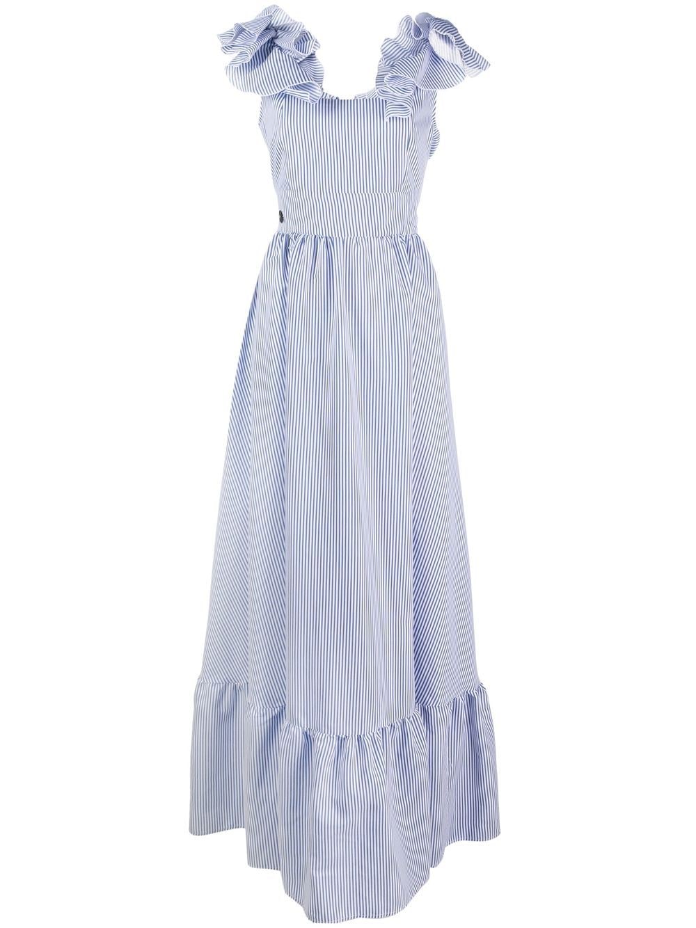 blue/white cotton vertical stripe pattern ruffle collar rear tie fastening V-back ruffle hem maxi