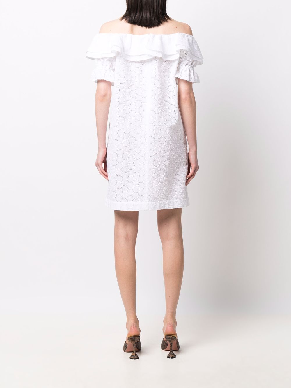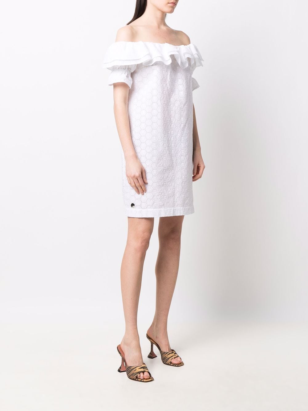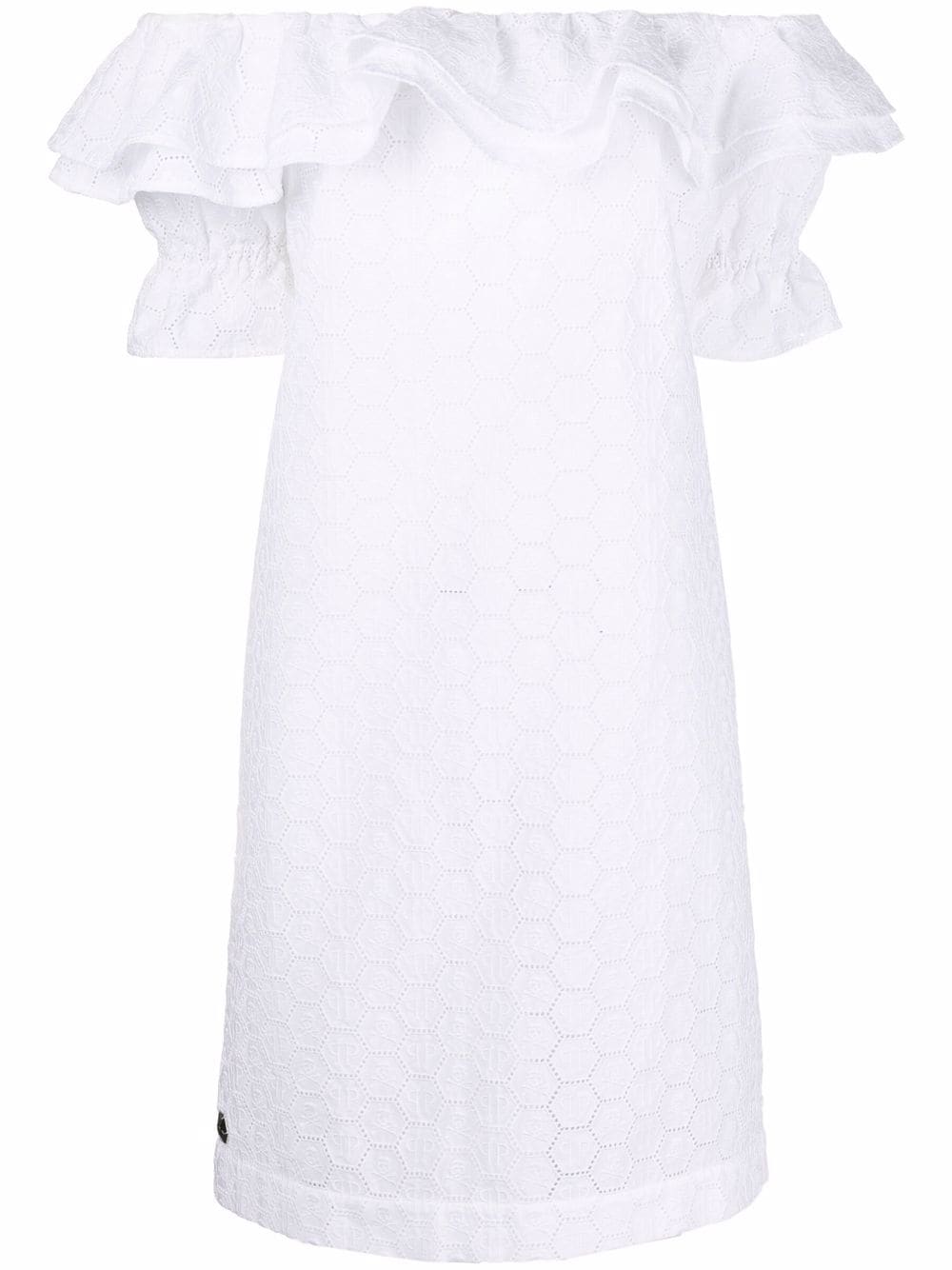 white floral-lace detailing ruffled detailing logo plaque off-shoulder short sleeves