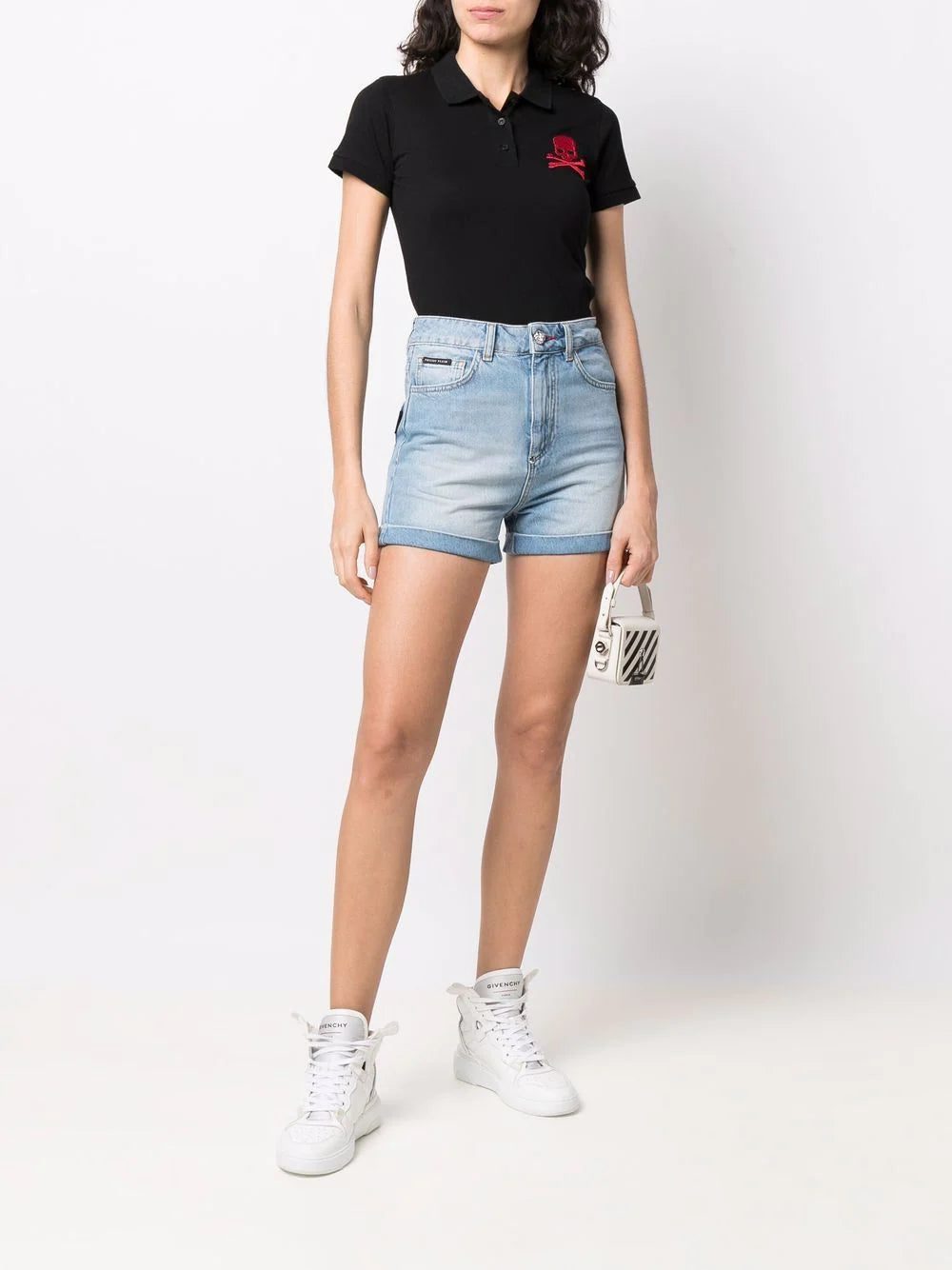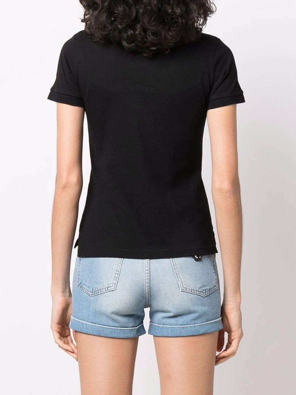 Black cotton skull-patch polo shirt from PHILIPP PLEIN featuring skull patch detail, polo collar, short front button fastening, short sleeves and straight hem.