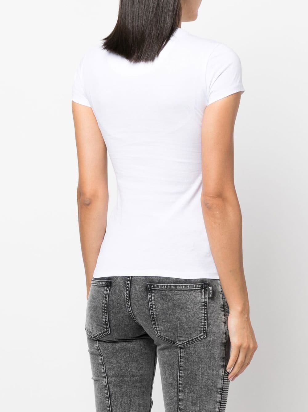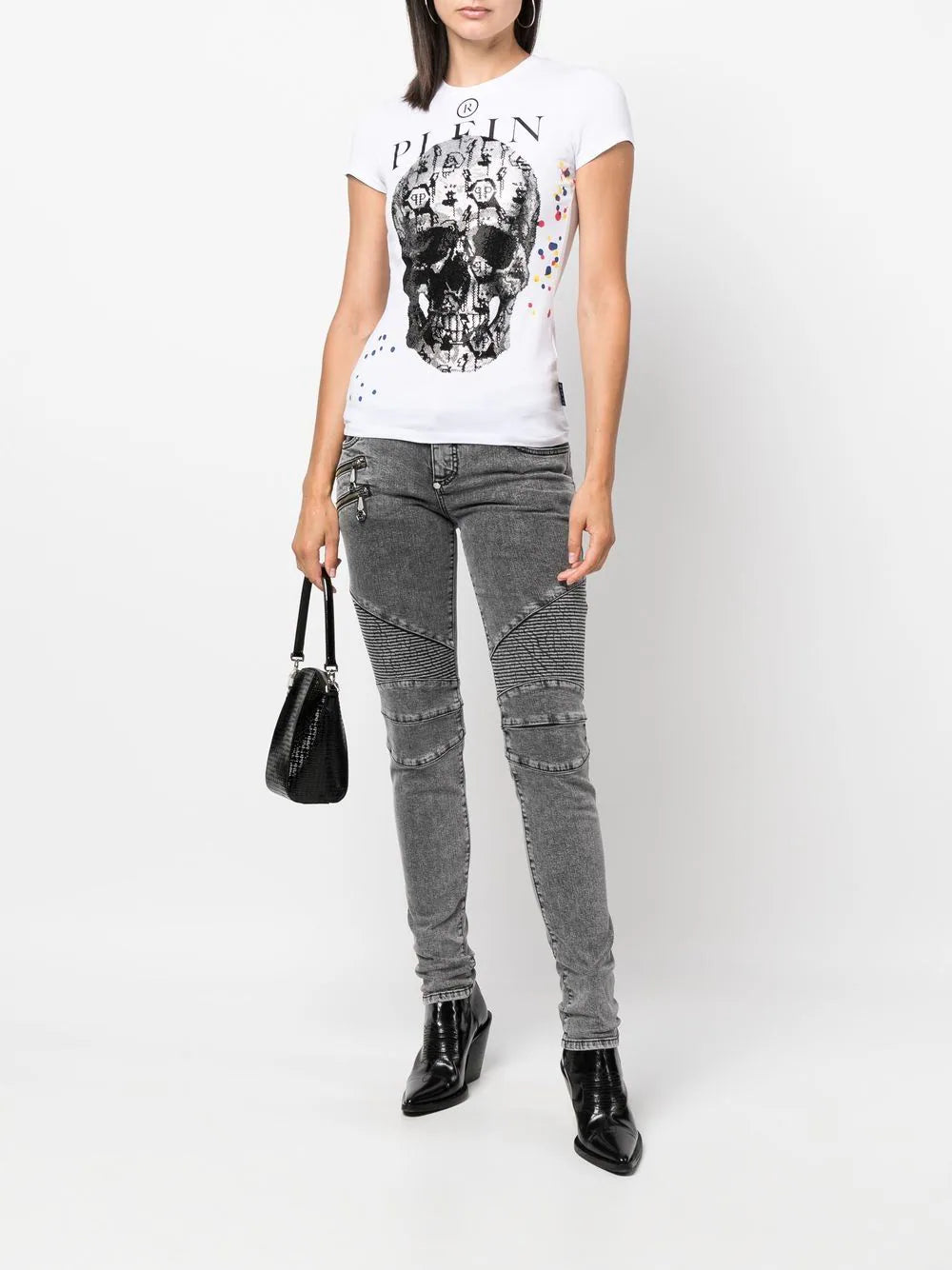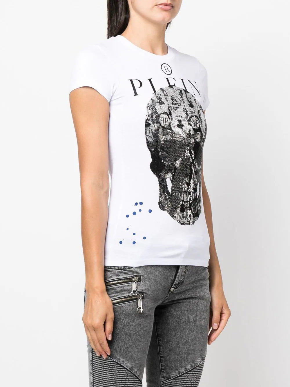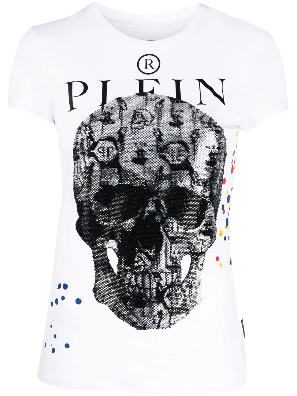 skull-print cotton T-shirt from PHILIPP PLEIN featuring white/black, cotton, crystal embellishment, logo print to the front, skull print, crew neck, short sleeves and straight hem.