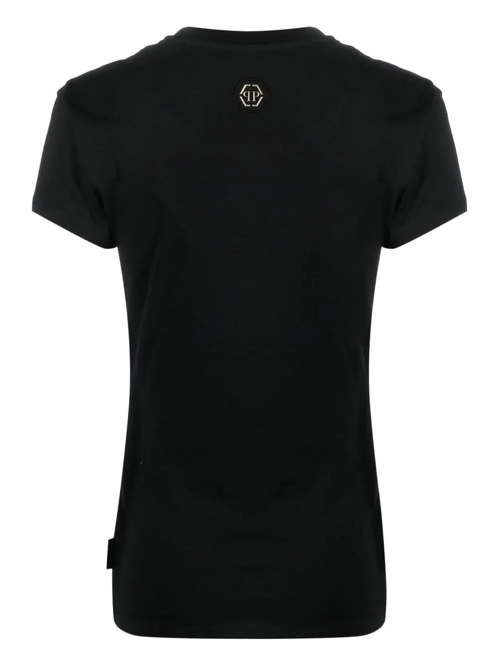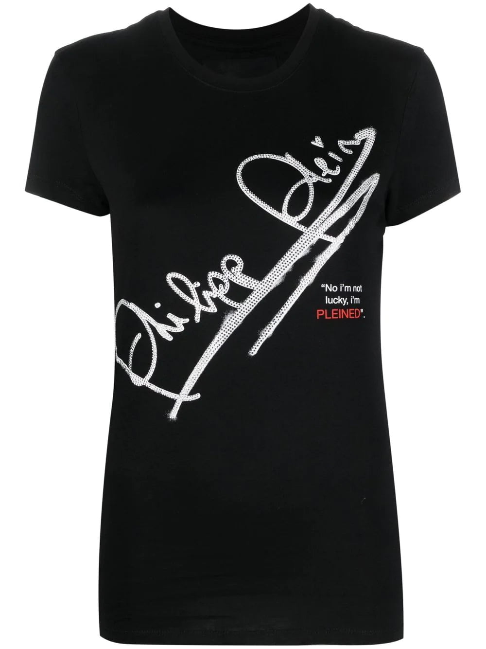 SS Signature cotton T-shirt from PHILIPP PLEIN featuring black, cotton, glass crystal embellishment, logo print to the front, crew neck, short sleeves and straight hem.