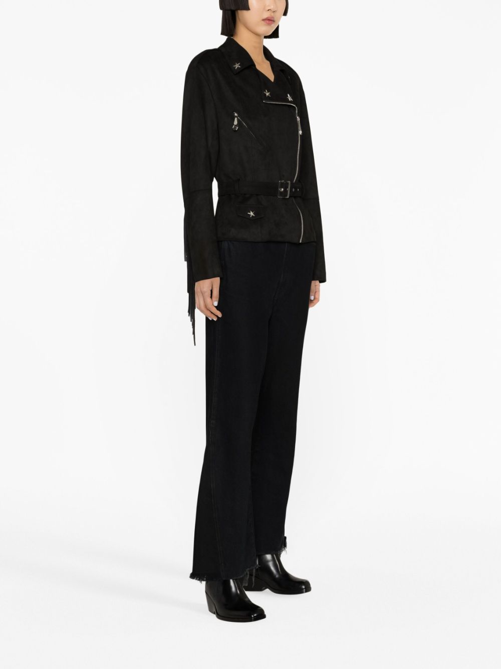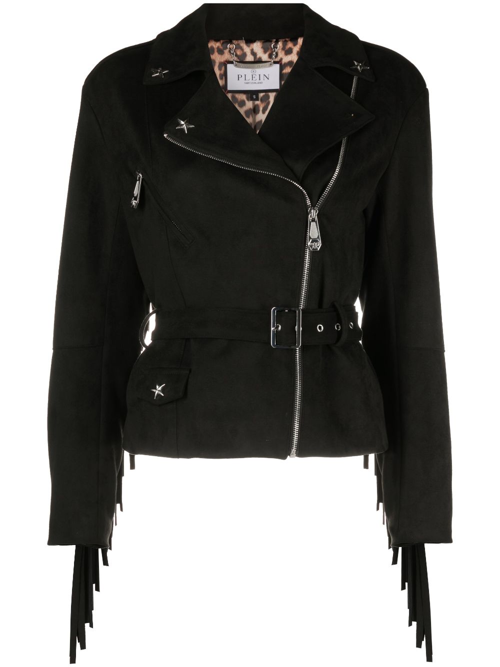 Always favouring bold designs and rock ‘n’ roll finishes, Philip Plein introduces this biker jacket. Framed with fringed trims, it is decorated with star studs.
