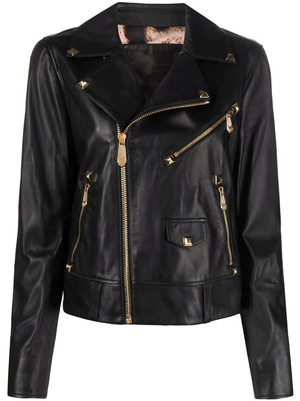 Philipp Plein presents this black lamb skin biker jacket for SS22. Detailed with edgy gold-tone studs that reflect the designer's rebellious spirit.