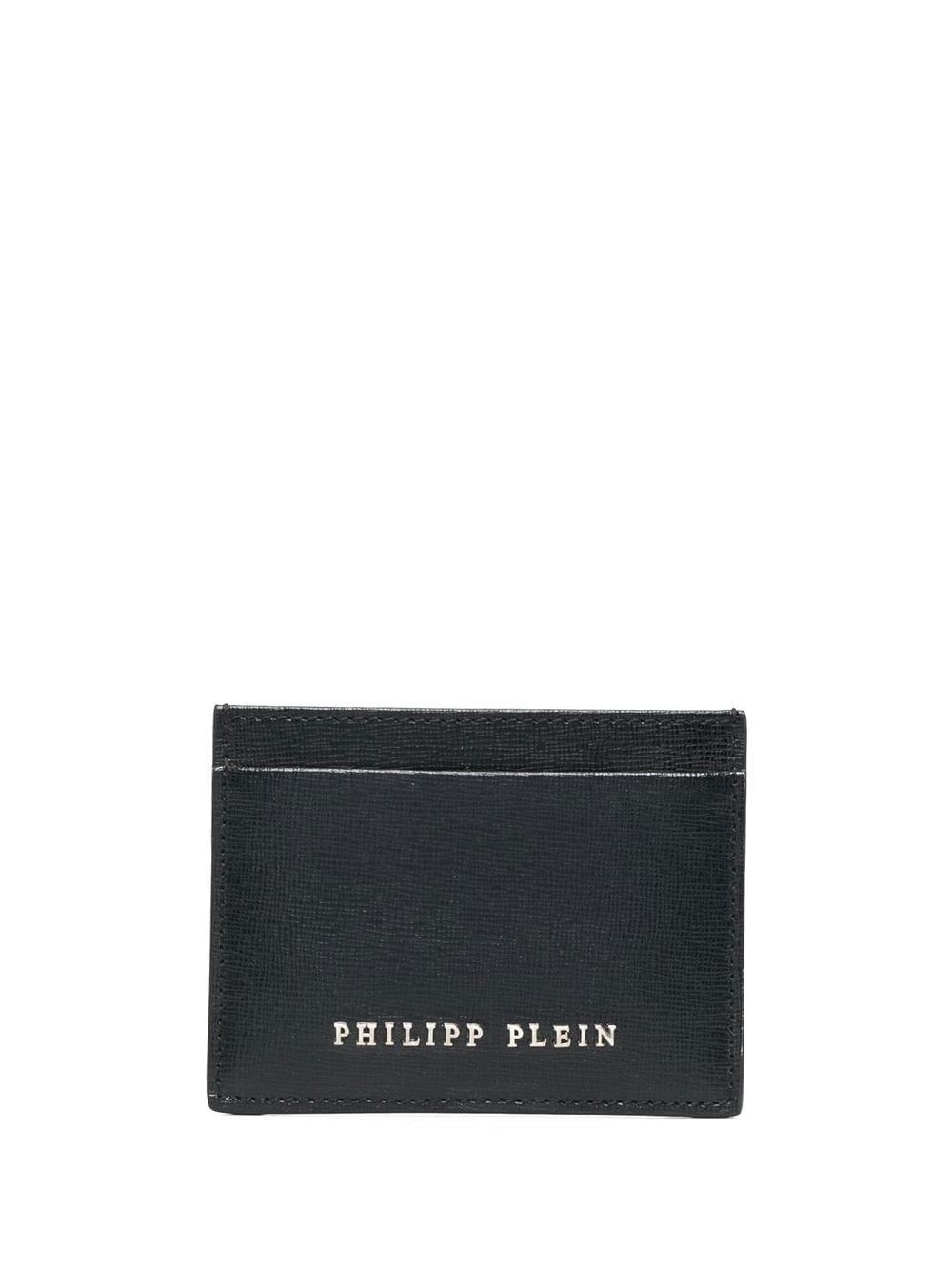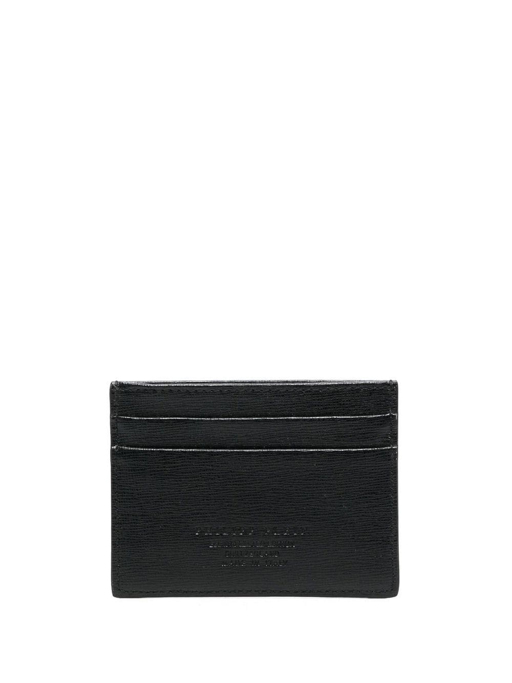 black leather grained texture silver-tone logo lettering card slots