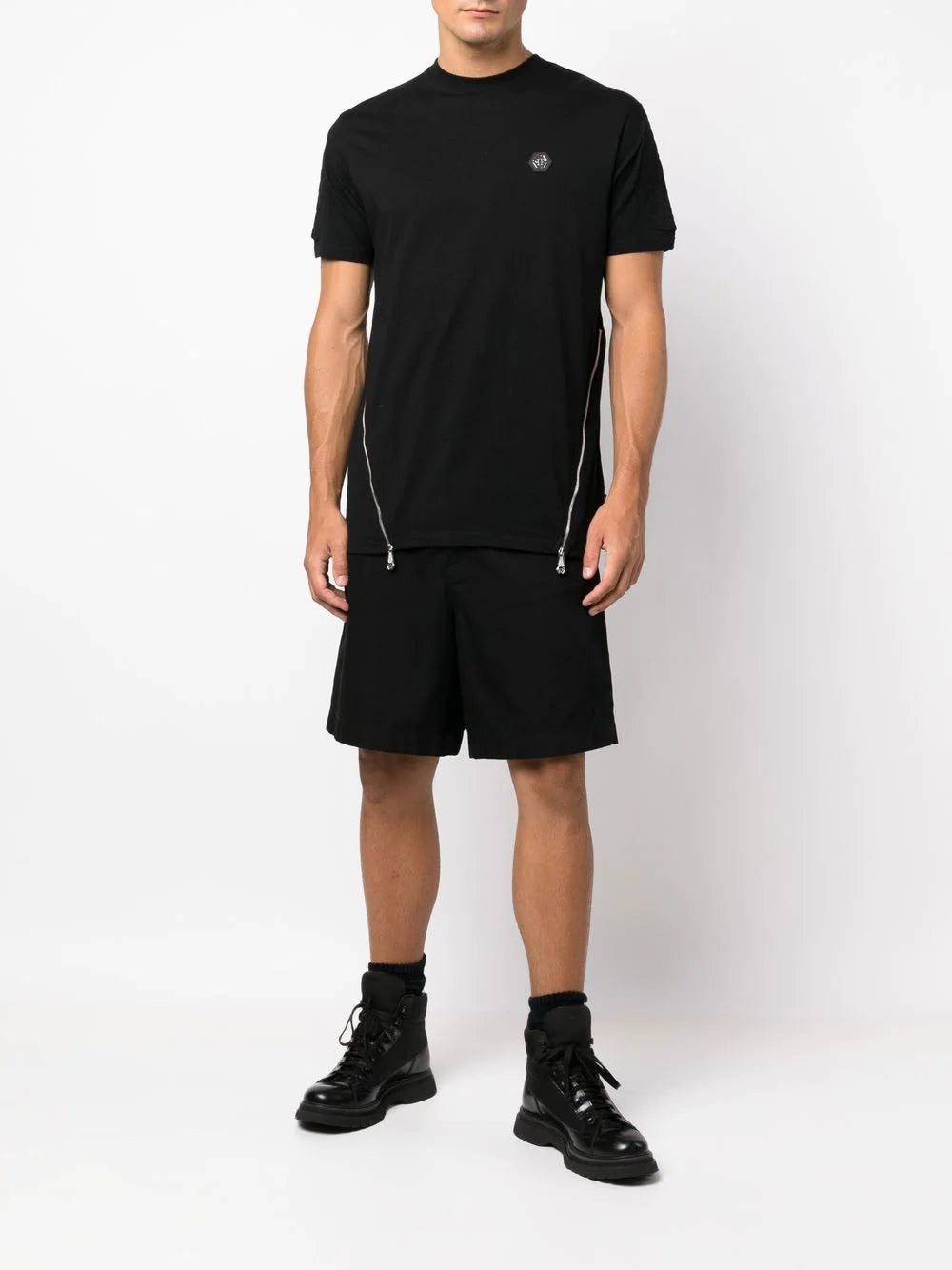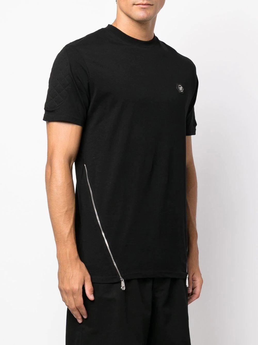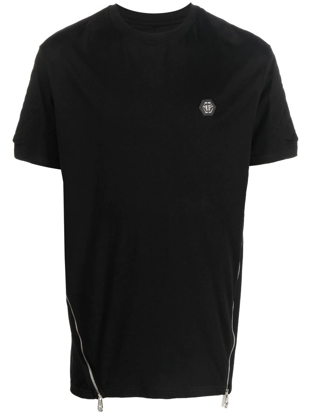 zippered logo-patch T-shirt from PHILIPP PLEIN featuring black, cotton, jersey knit, logo patch at the chest, zip details, crew neck, short sleeves and straight hem.
