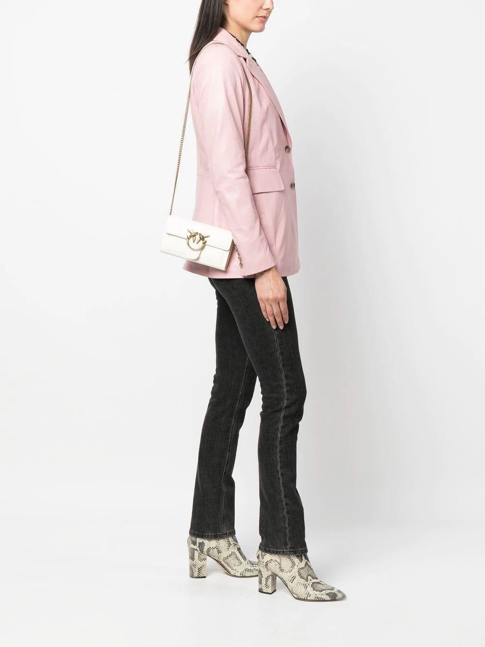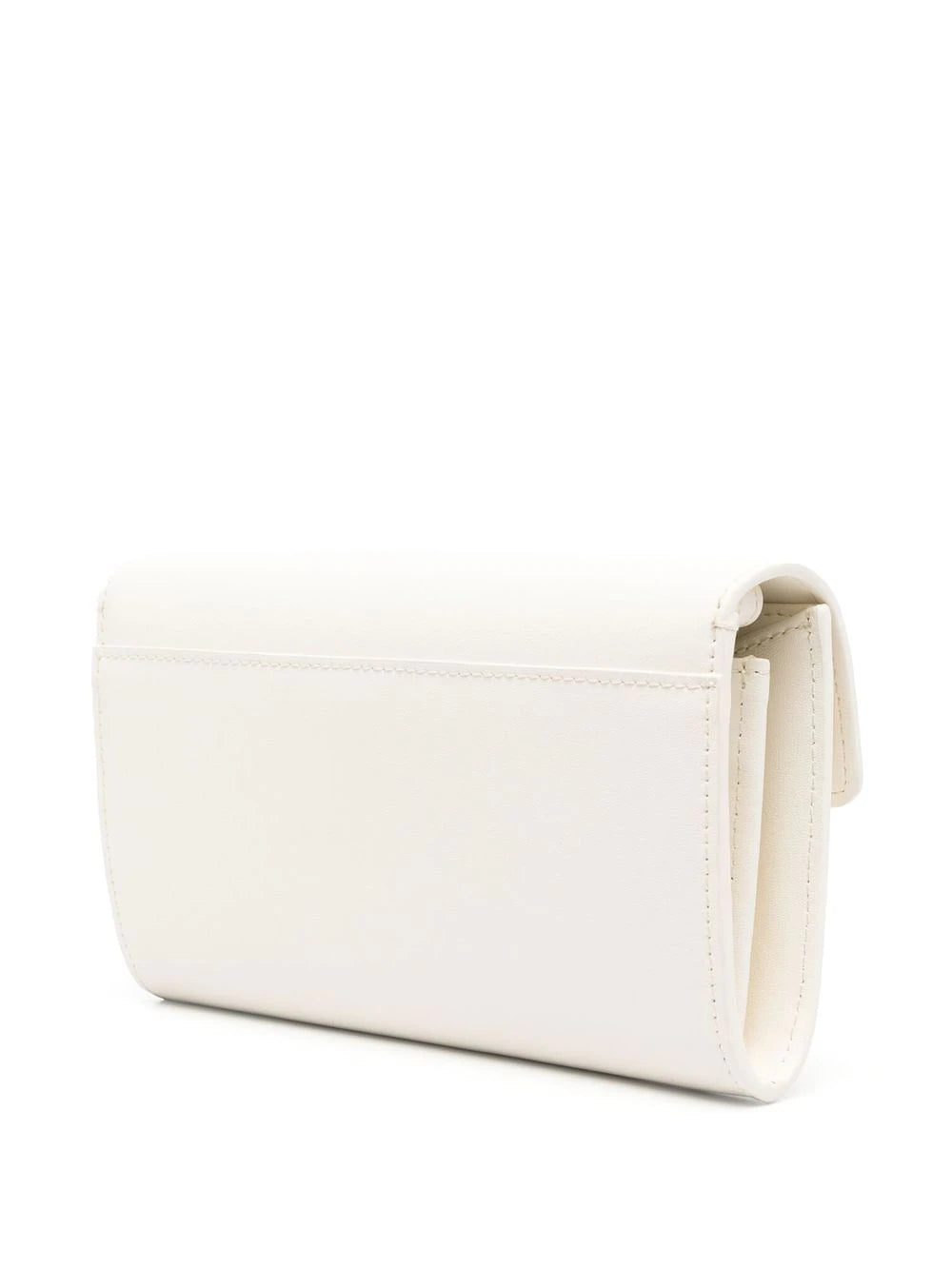 Love One leather crossbody bag from PINKO featuring cloud white, calf leather, gold-tone hardware, detachable chain-link shoulder strap, foldover top with magnetic fastening, partitioned compartment, internal card slots and internal zip-fastening pocket.