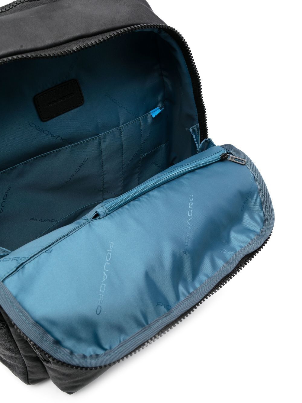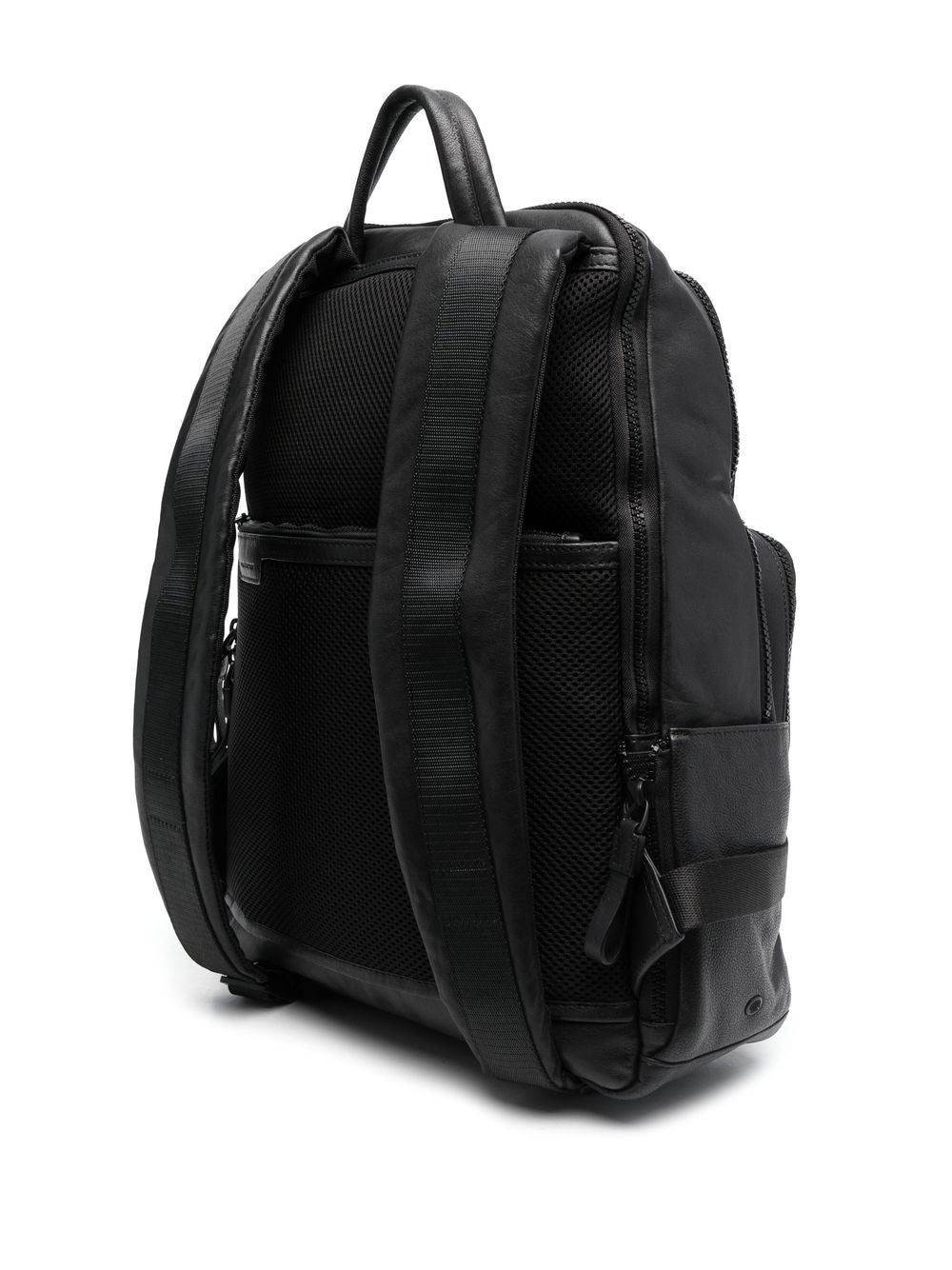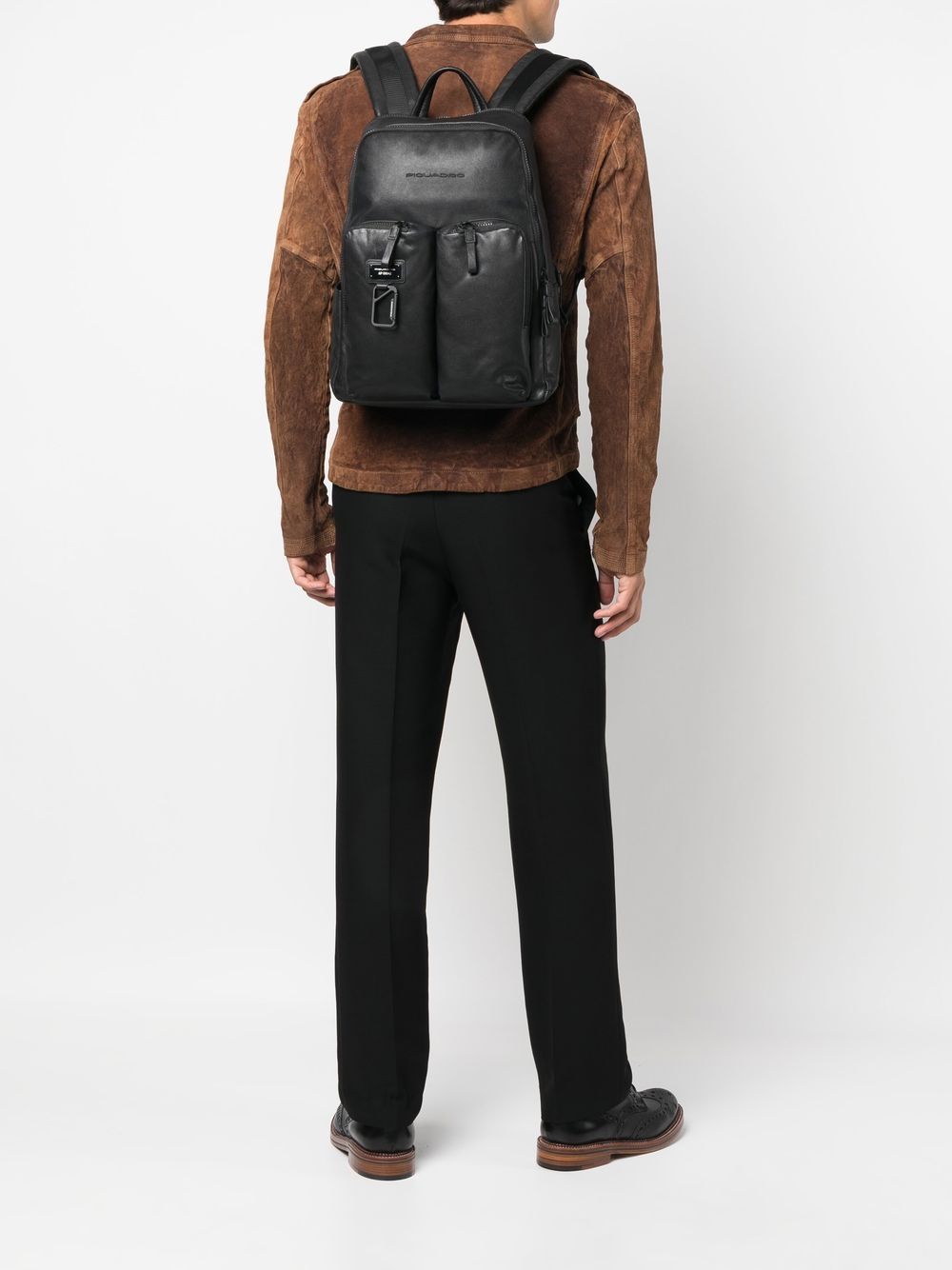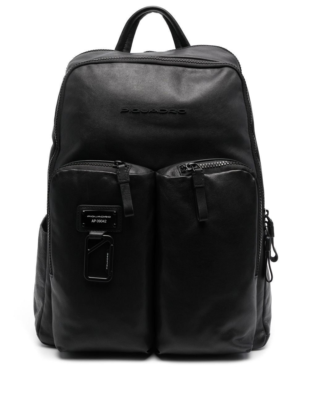 jet black calf leather debossed logo to the front logo plaque single flat top handle all-around zip fastening front zip fastening pockets side patch pockets adjustable shoulder straps