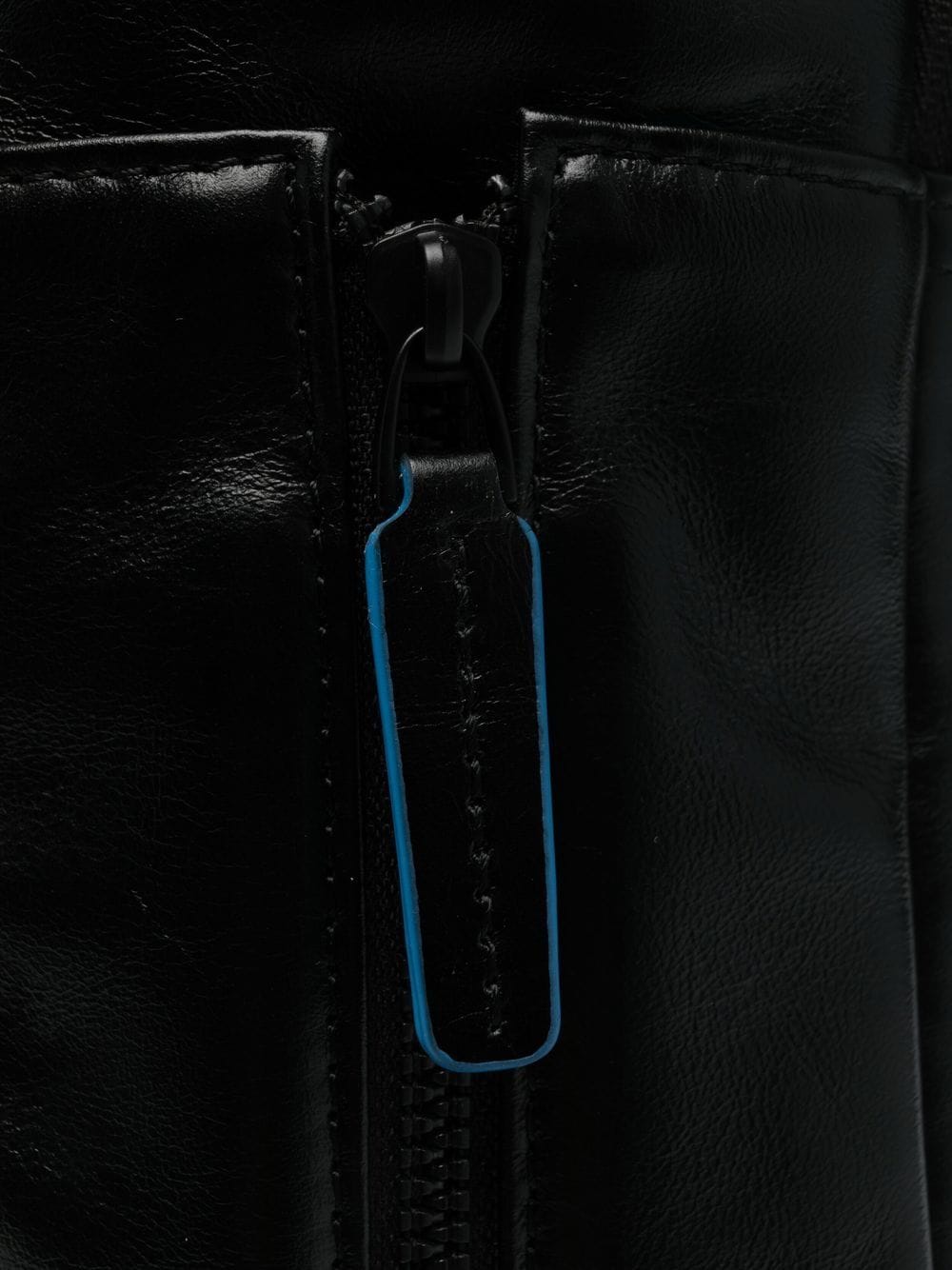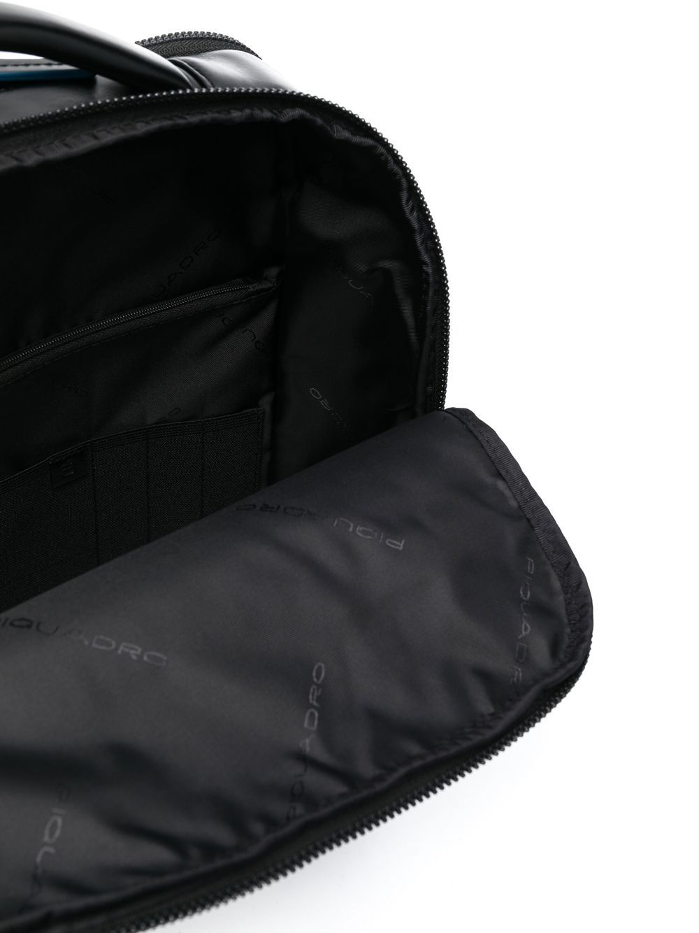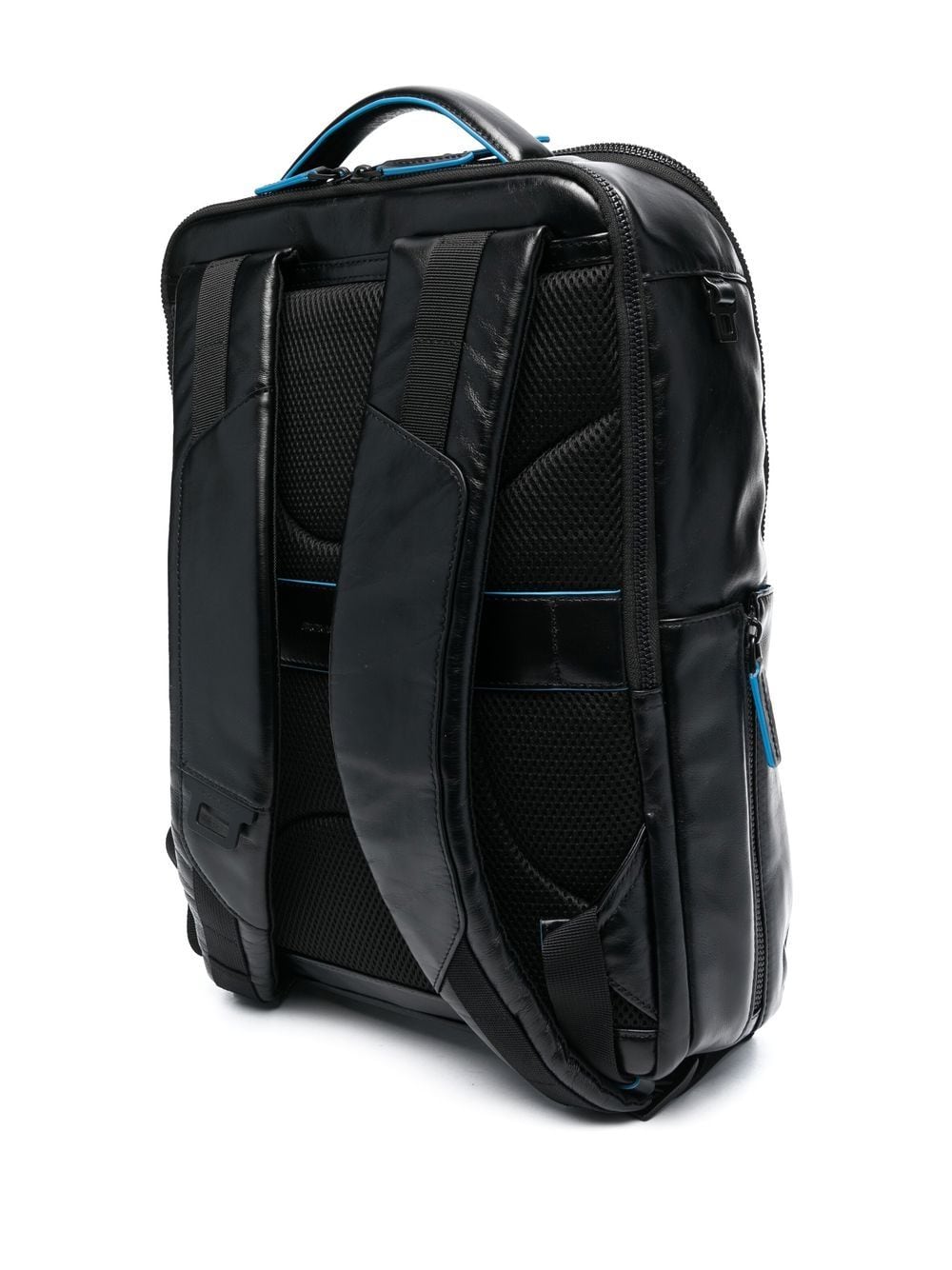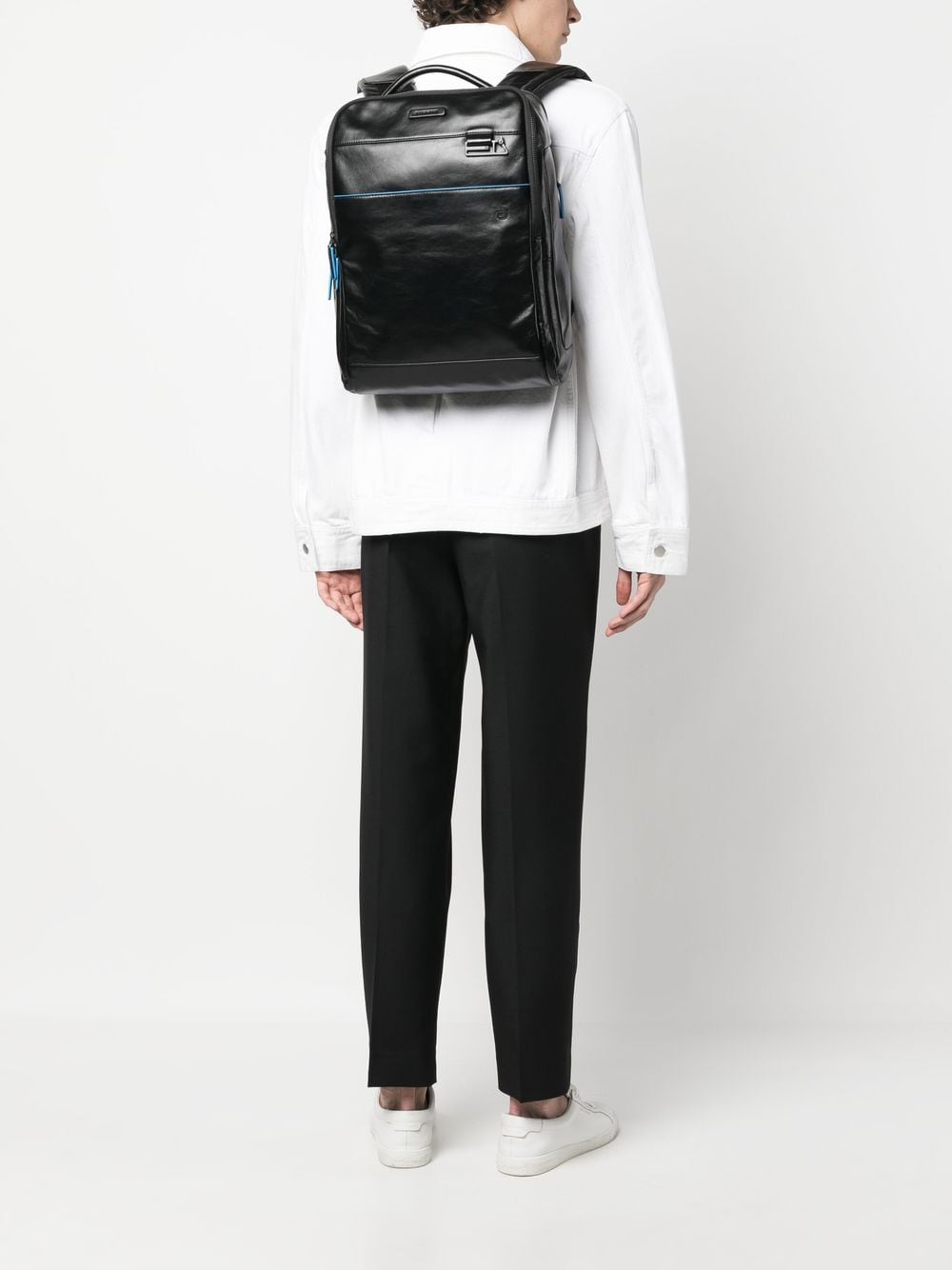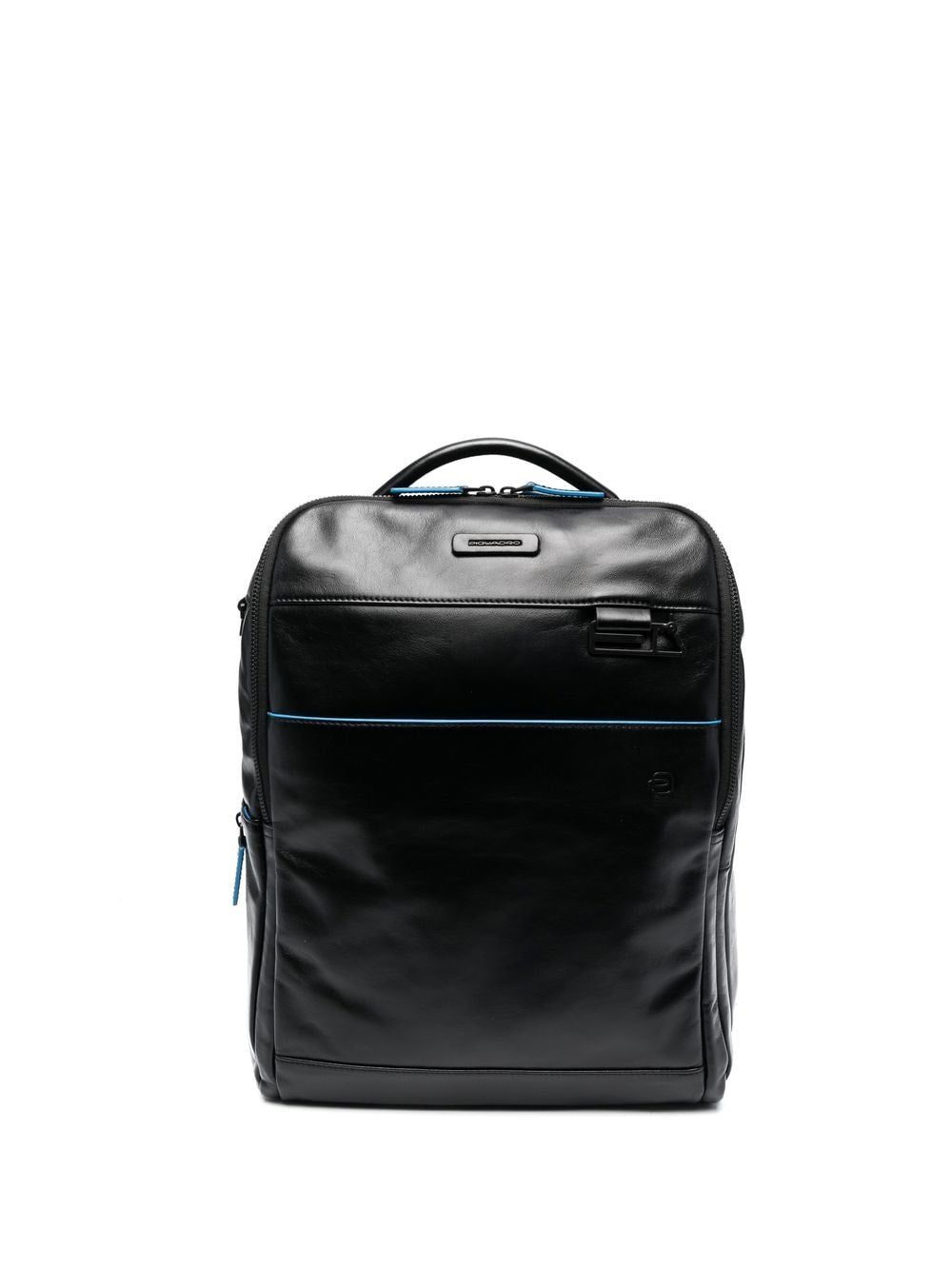 black calf leather logo plaque two-way zip fastening two padded adjustable shoulder straps single flat top handle