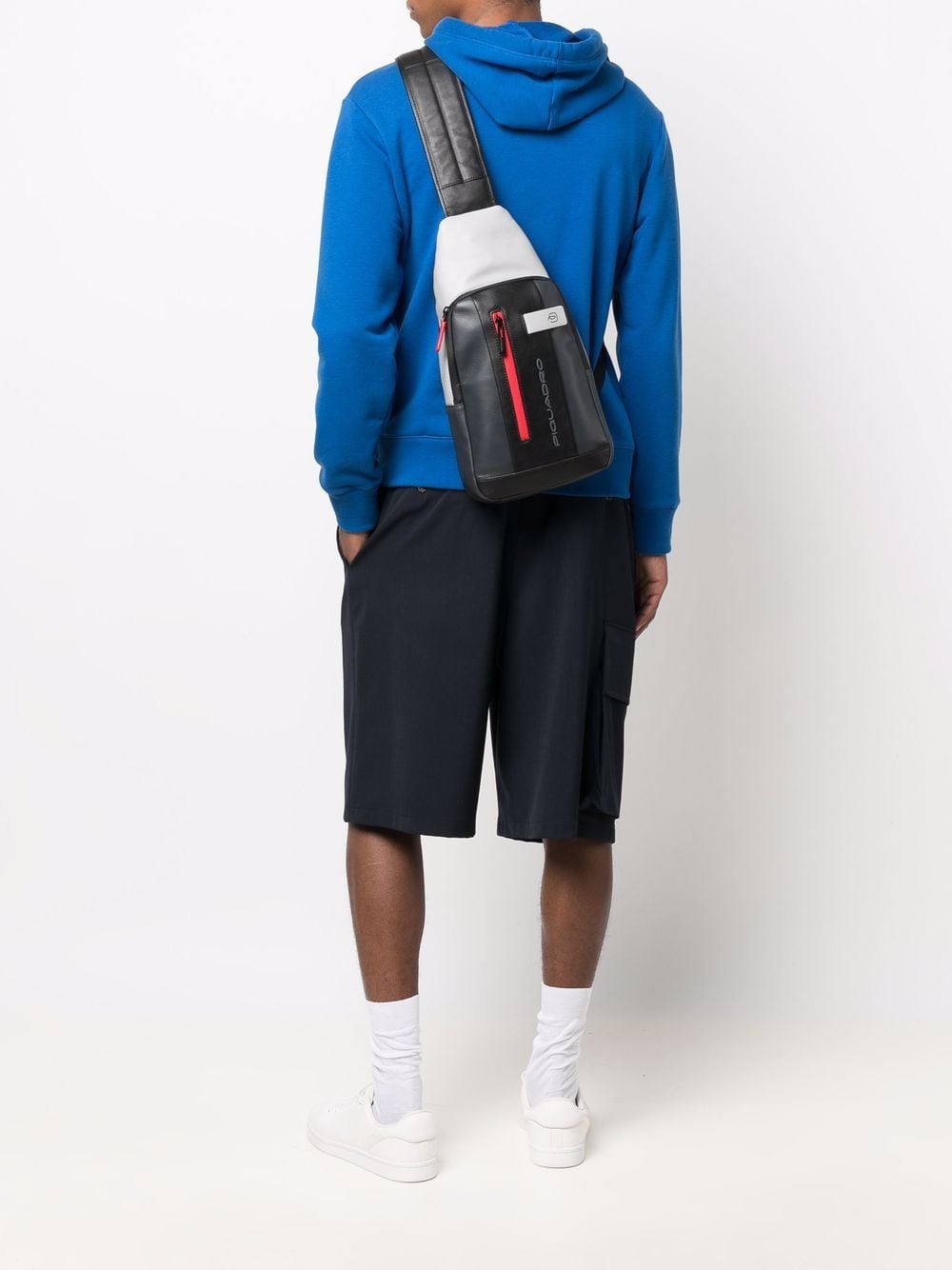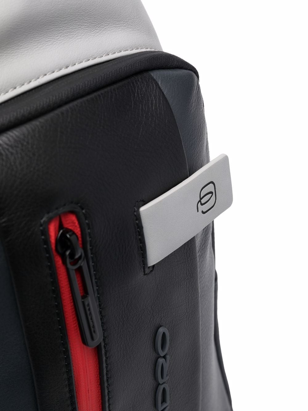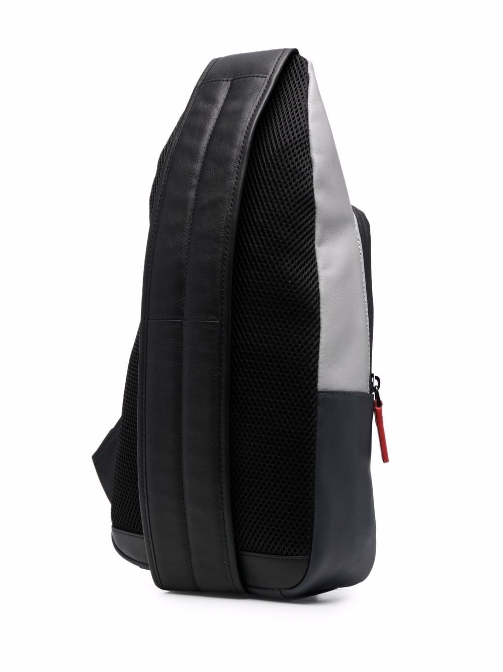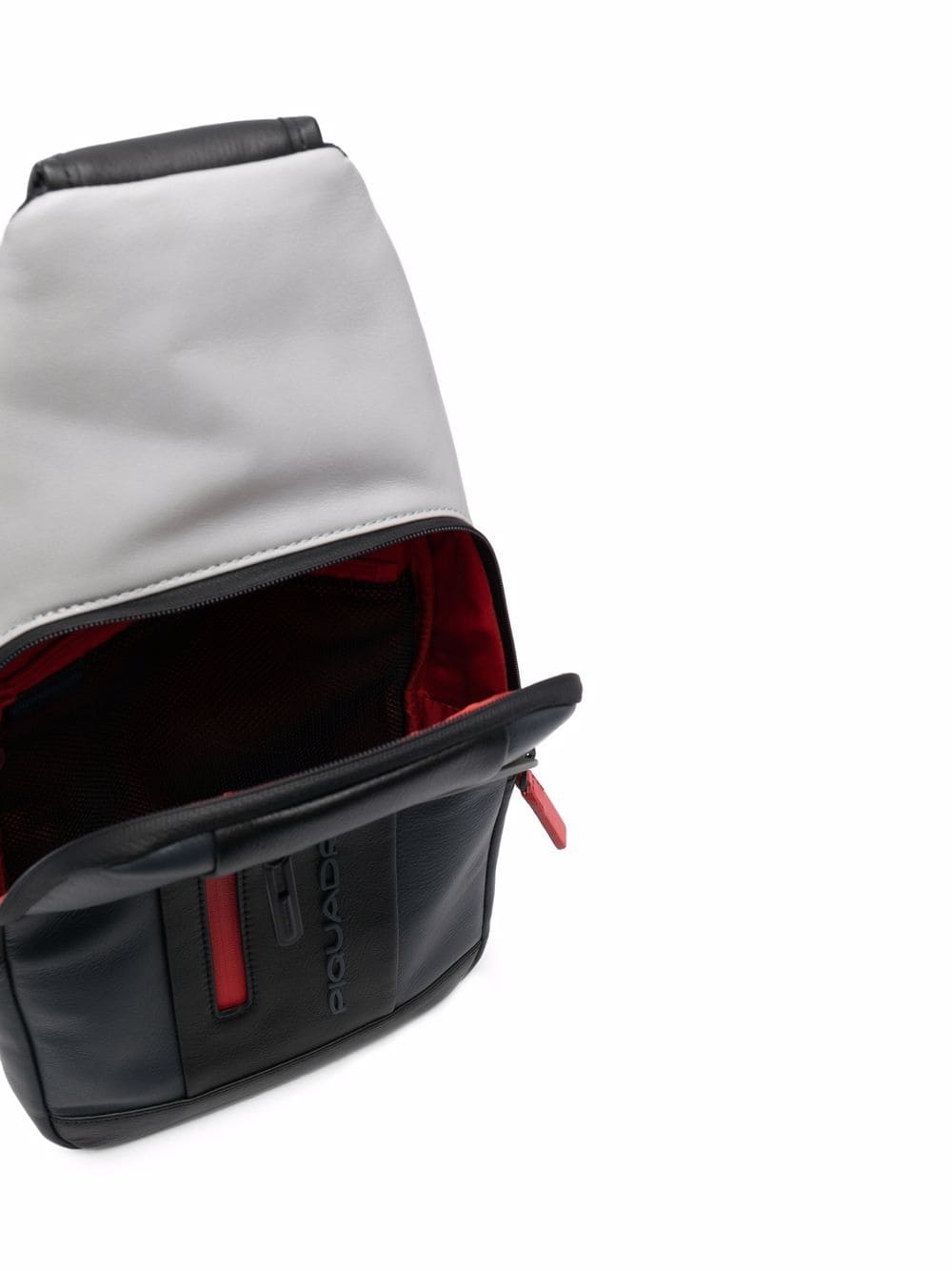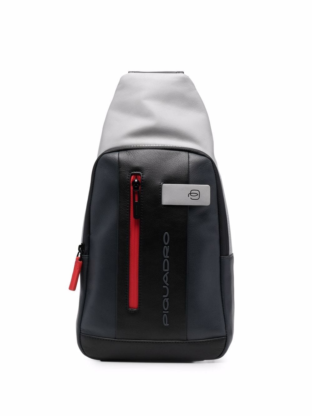 black/red/grey leather panelled design embossed logo to the front tonal logo plaque front zip-fastening pocket all-around zip fastening adjustable shoulder strap main compartment
