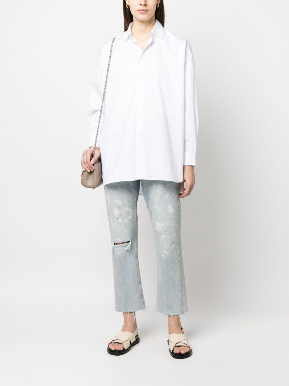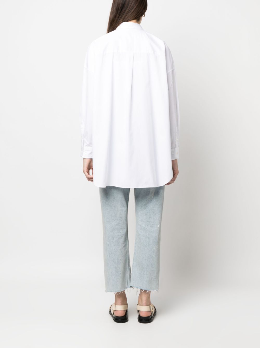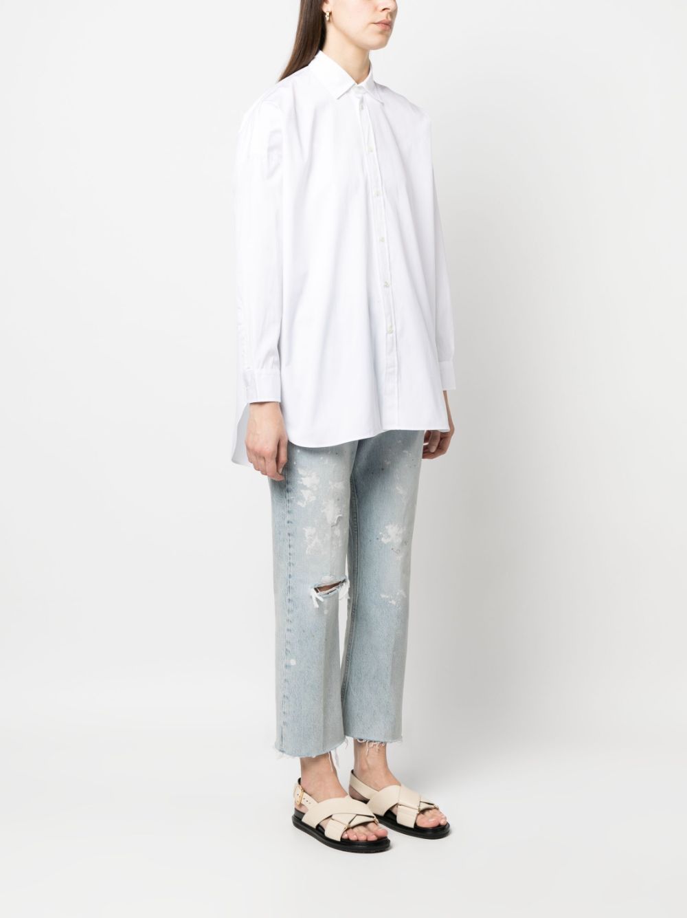 optical white cotton pointed flat collar front button fastening long sleeves buttoned-cuff sleeves rear curved hem