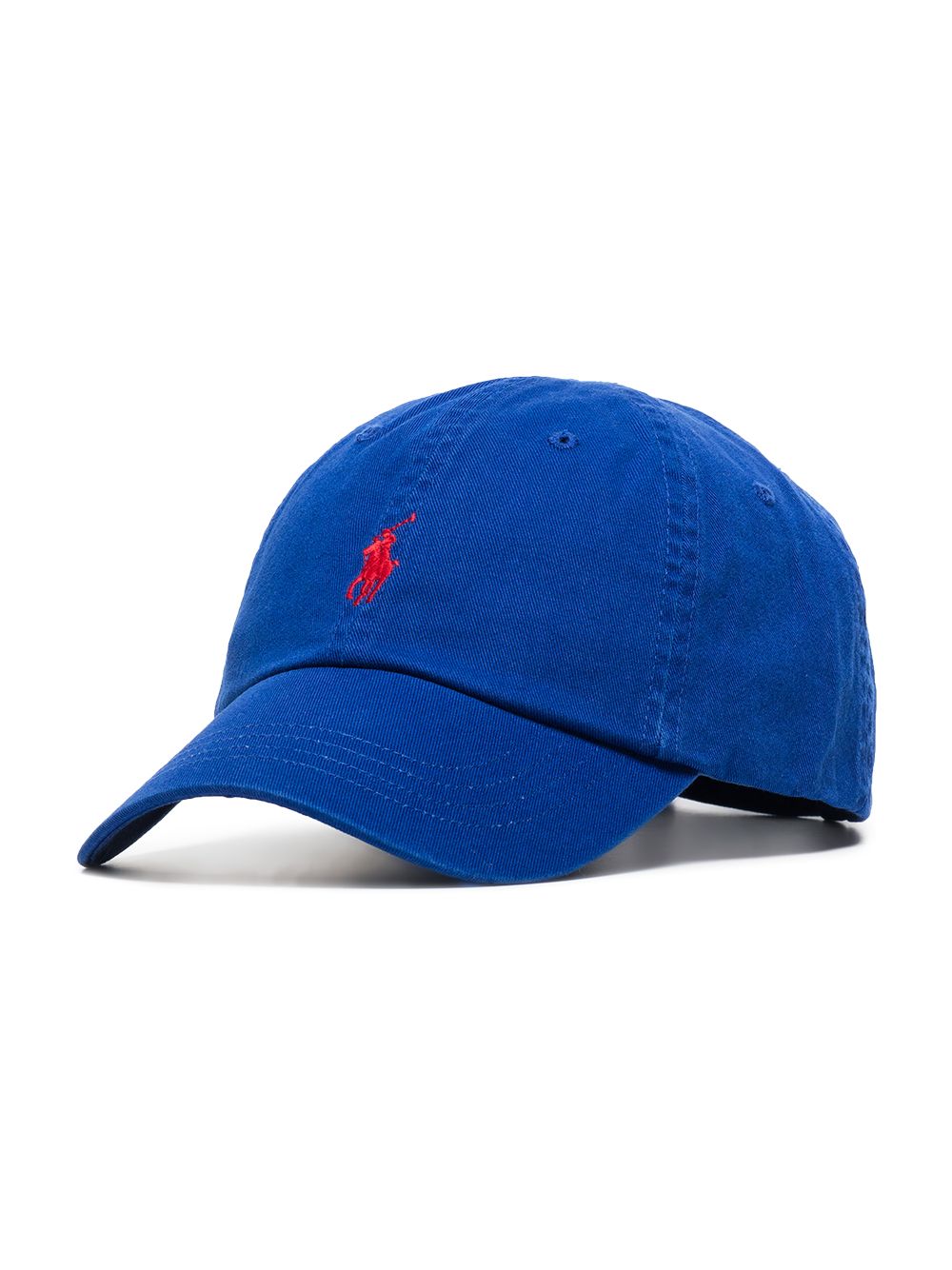 Polo Ralph Lauren's cap is embroidered with the brand's iconic logo at the front. The contrasting red thread makes it stand out all the more against the blue background.