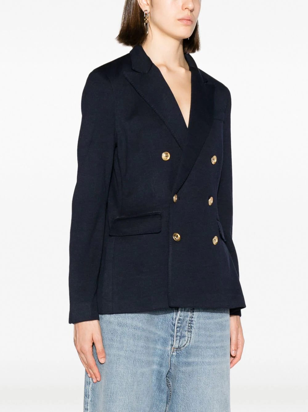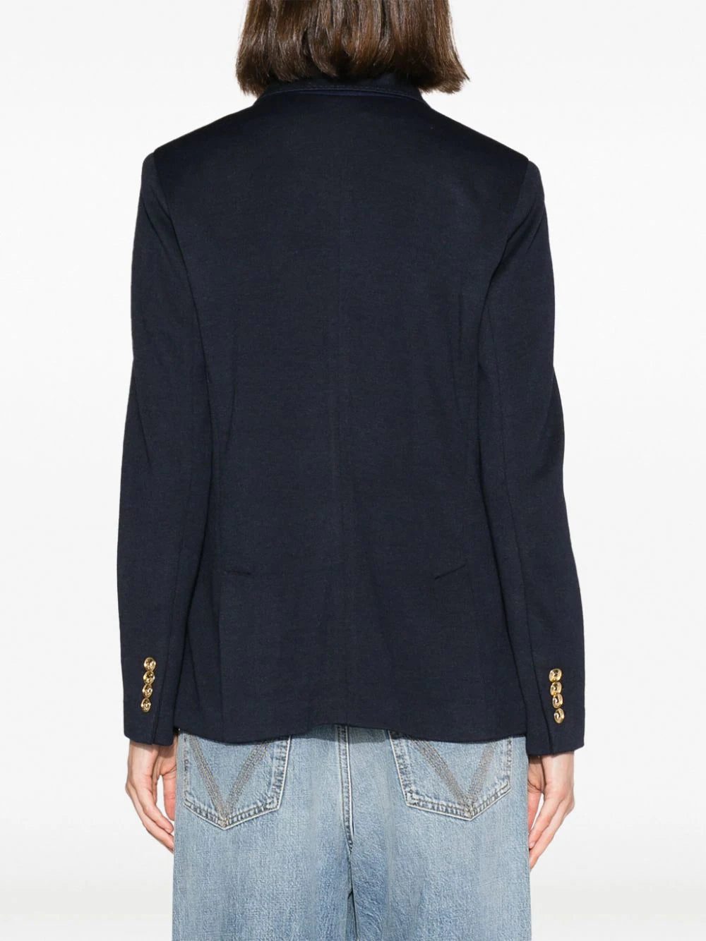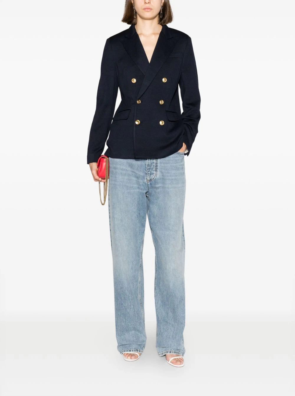 Polo Ralph Lauren’s blazer is a softly structured take on classic double-breasted styles. The knitted construction is punctuated with gold-tone buttons embossed with equestrian motifs, referencing the brand’s heritage.