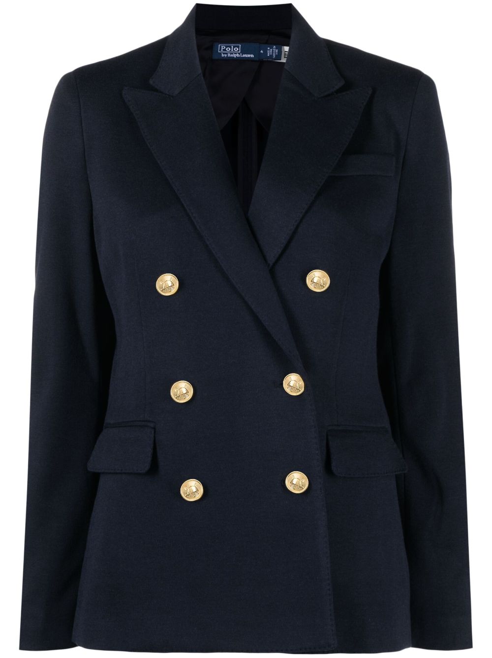 Polo Ralph Lauren’s blazer is a softly structured take on classic double-breasted styles. The knitted construction is punctuated with gold-tone buttons embossed with equestrian motifs, referencing the brand’s heritage.
