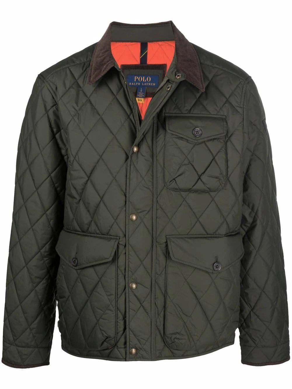 olive green diamond quilting pointed flat collar front button and zip fastening chest flap pocket front flap pockets long sleeves straight hem