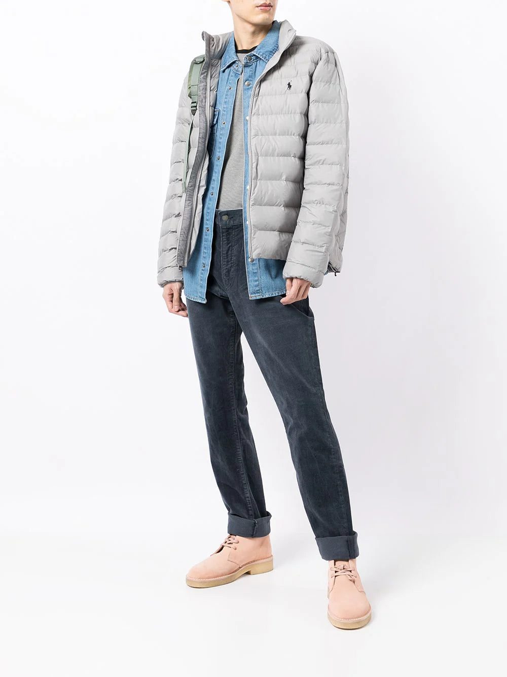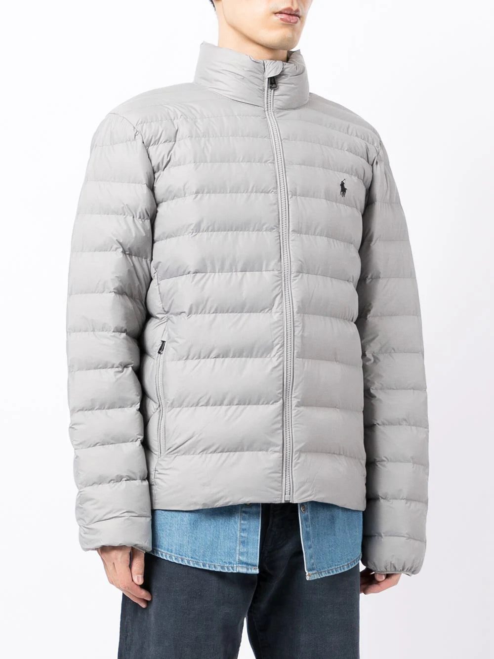 Heather grey terra padded jacket from POLO RALPH LAUREN featuring padded design, signature Polo Pony motif, front zip fastening, long sleeves and high neck. Conscious: This item is made from at least 50% recycled or upcycled materials. For recycled synthetic clothing products we highly recommend using a microfibre-catching washing bag to ensure that no microplastics that can pollute water are released in the process..