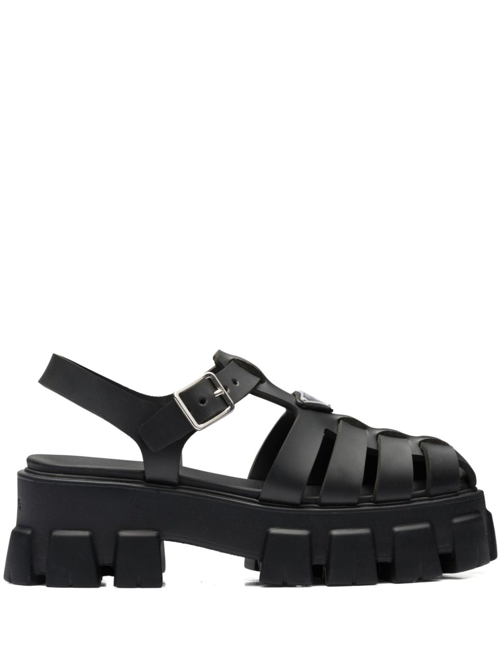Prada reimagines its dual soul with a modernist twist in the voluminous construction of these black rubber sandals. They're set on a deeply ridged platform sole that's reminiscent of hiking styles and are finished with an enameled metal triangle logo that nods to archival codes.