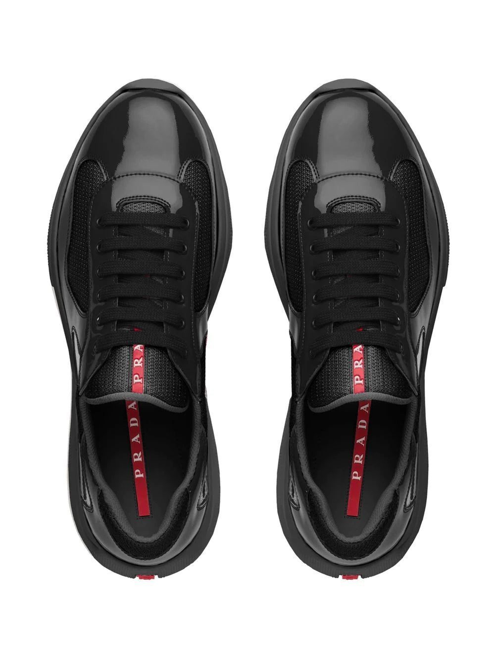 With a black calf leather and mesh construction, Prada's America's Cup low-top sneakers boast a panelled design punctuated with the brand's signature Linea Rossa logo patch at the tongue.
