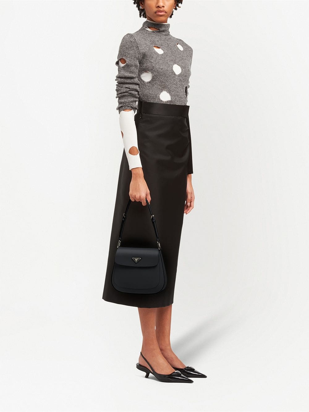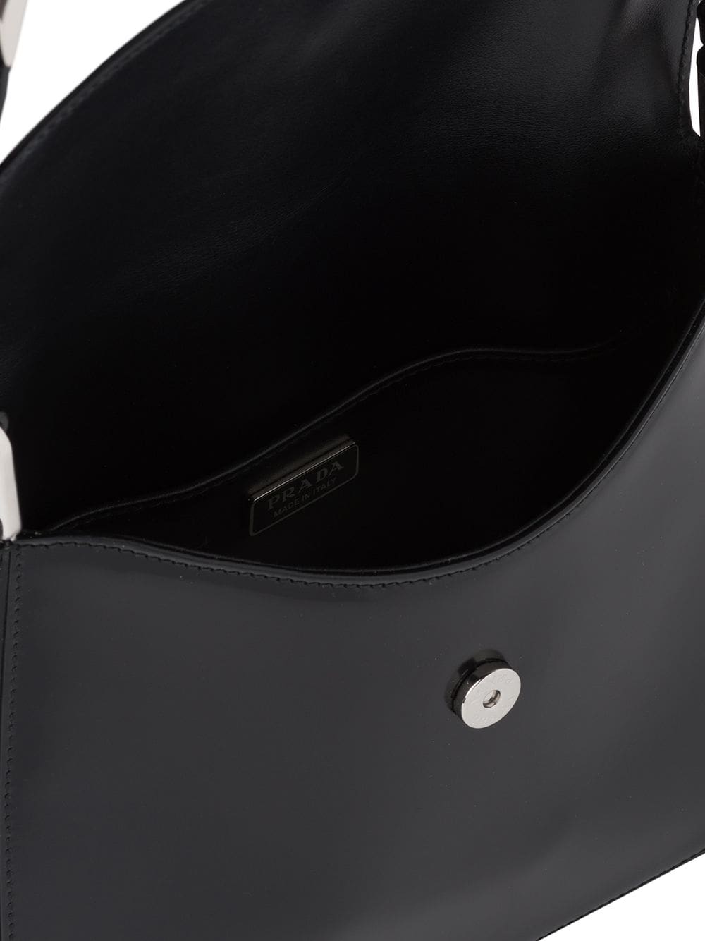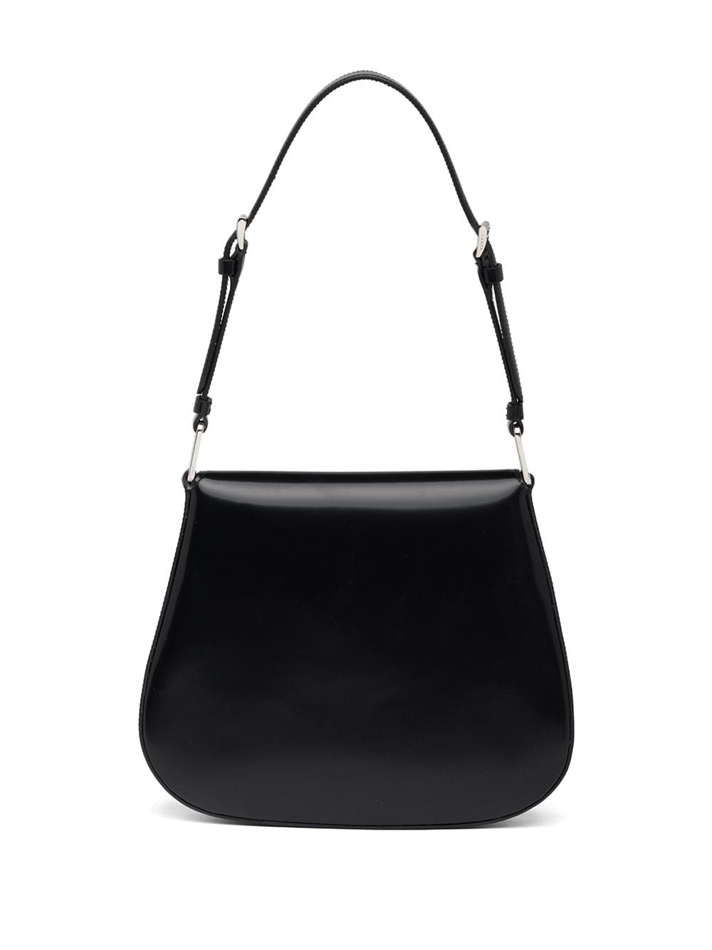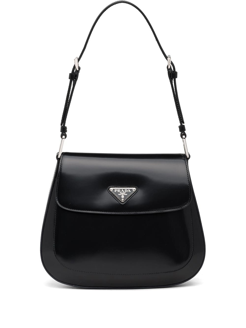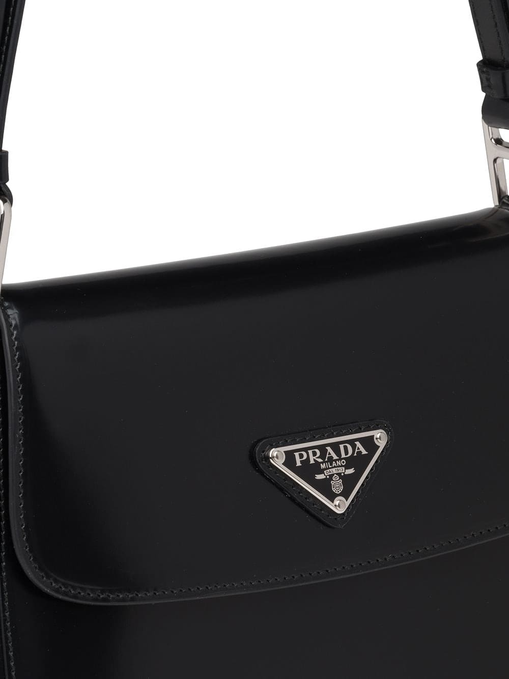 Black leather Cleo shoulder bag from PRADA featuring logo plaque, adjustable shoulder strap, foldover top, magnetic fastening and main compartment.
