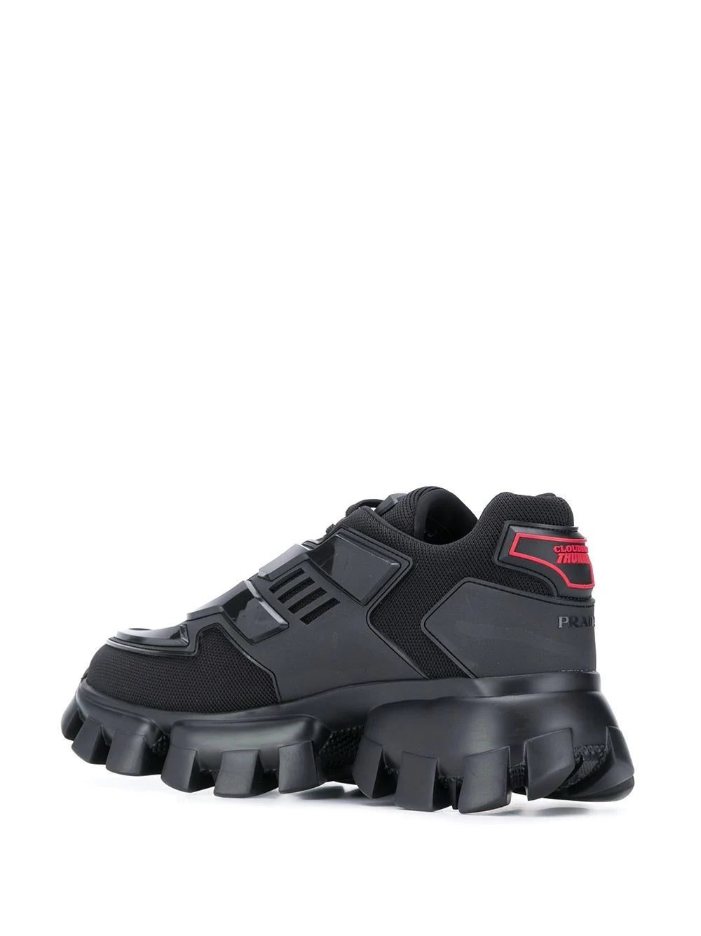 Prada infuses technical materials with futuristic rubberised logo tabs and graphic prints to produce innovative and utopian inspired collections season after season. Crafted from a black technical fabric upper and three-dimensional injected rubber eyestay elements, these Cloudbust Thunder sneakers feature a round toe, a lace-up front fastening, a logo patch at the tongue, branded heel counter and a Sawtooth rubber sole.