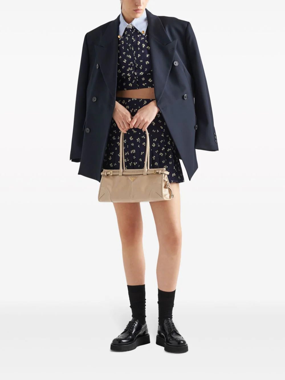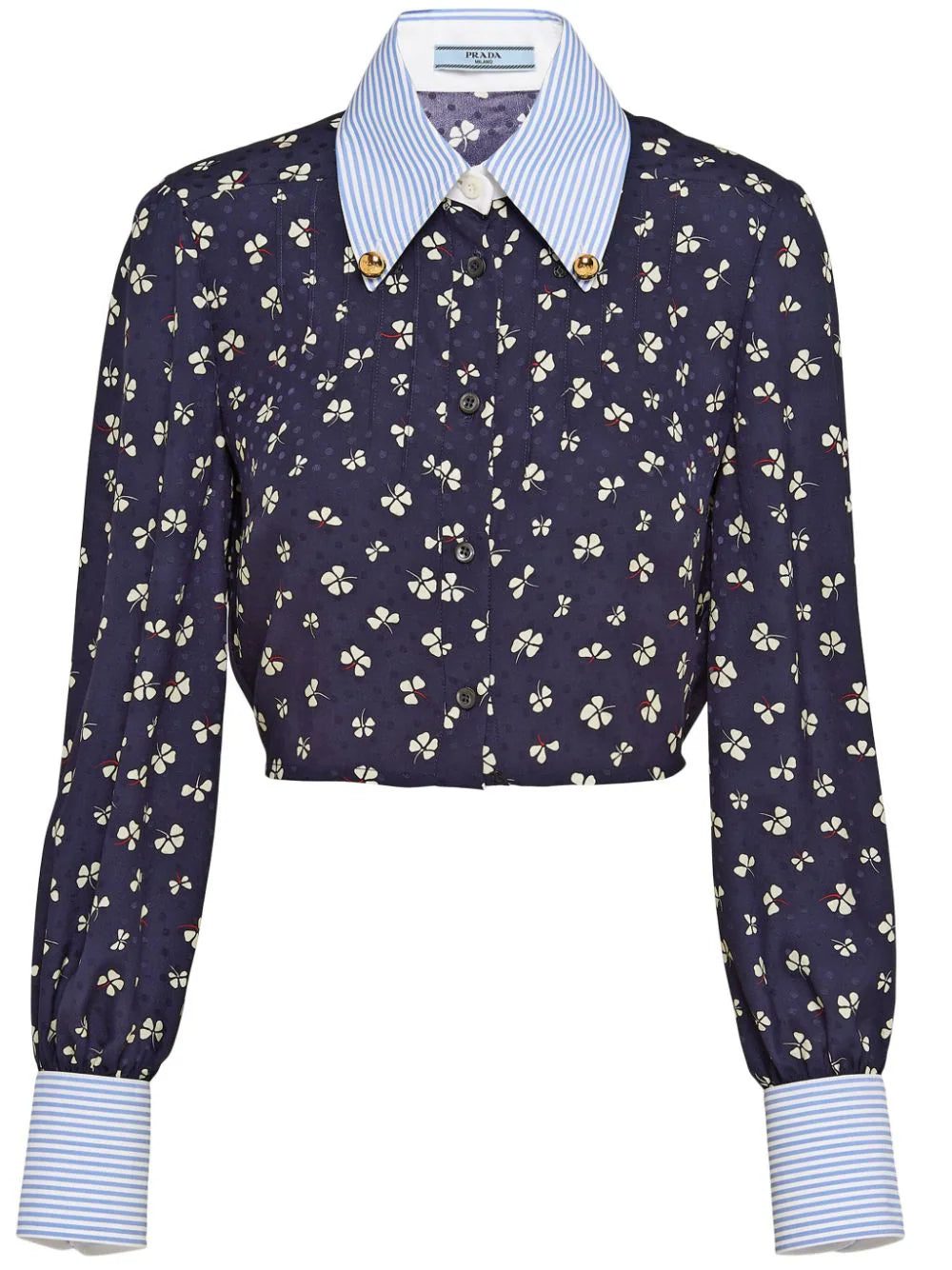 Prada presents this navy-blue silk shirt with a cropped silhouette, striped collar and cuffs. It's awash with a polka dot and clover print for a bold note.