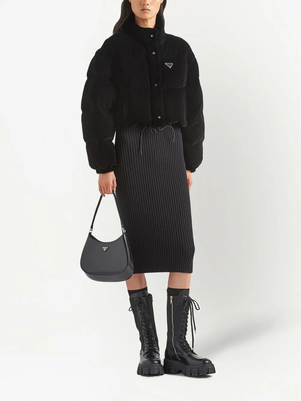 detachable-sleeve cropped puffer jacket from PRADA featuring black, recycled nylon, velvet, down-feather filling, padded design, detachable sleeves, silver-tone hardware, enamel triangle logo, high neck, front press-stud and zip fastening, long sleeves, elasticated cuffs, drawstring hem, cropped and two front welt pockets. Conscious: This item is made from at least 50% recycled or upcycled materials. For recycled synthetic clothing products we highly recommend using a microfibre-catching washing bag to ensure that no microplastics that can pollute water are released in the process..
