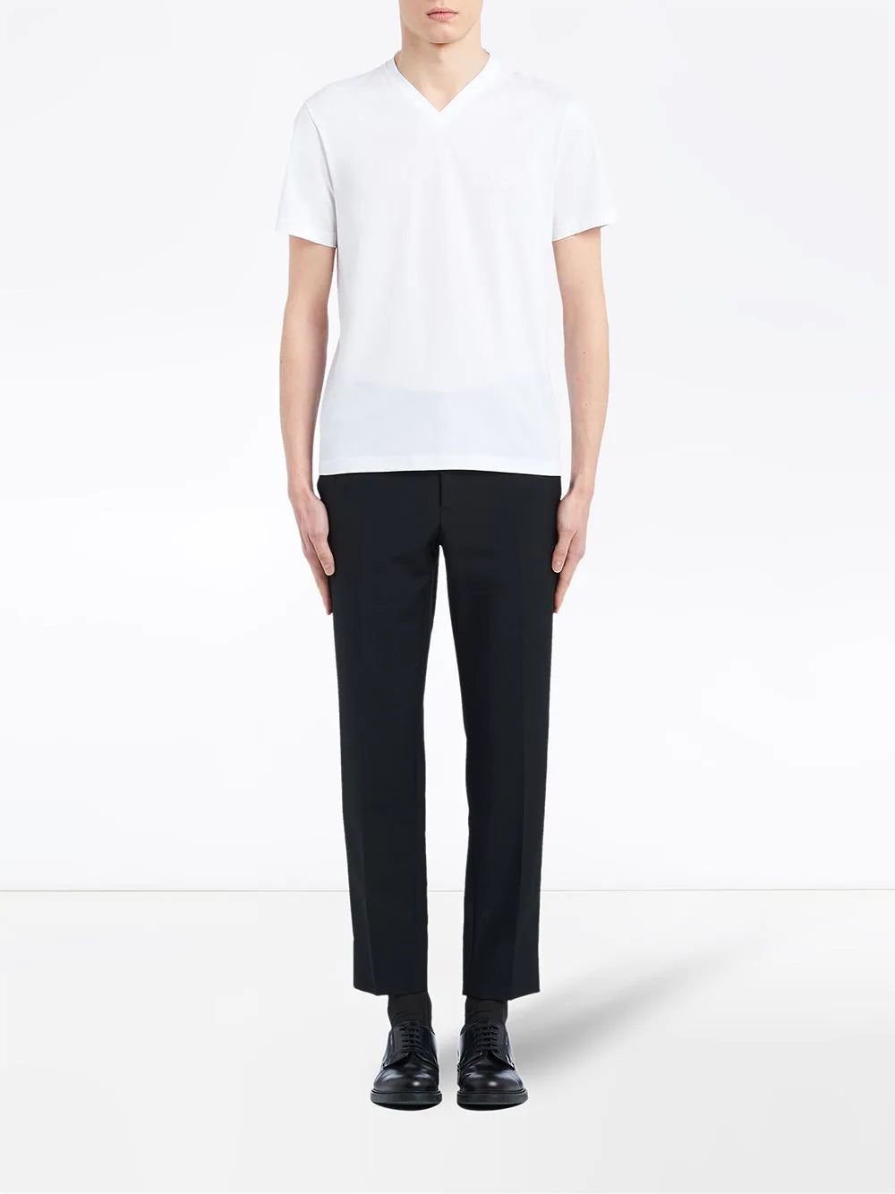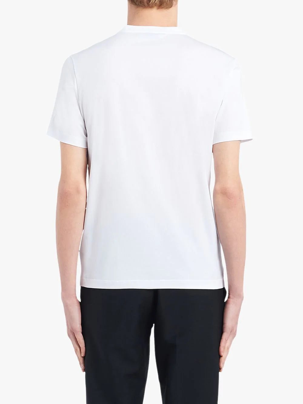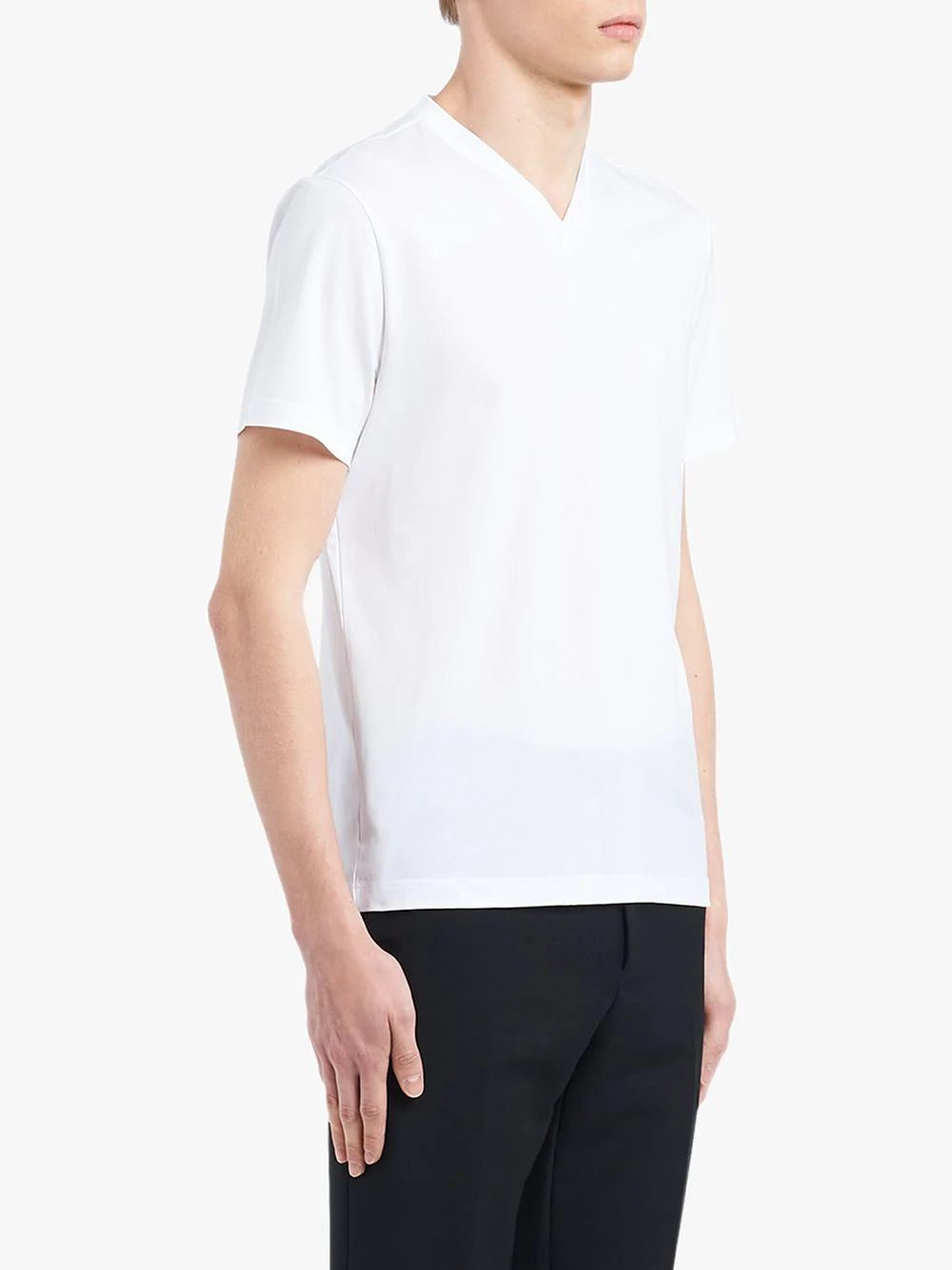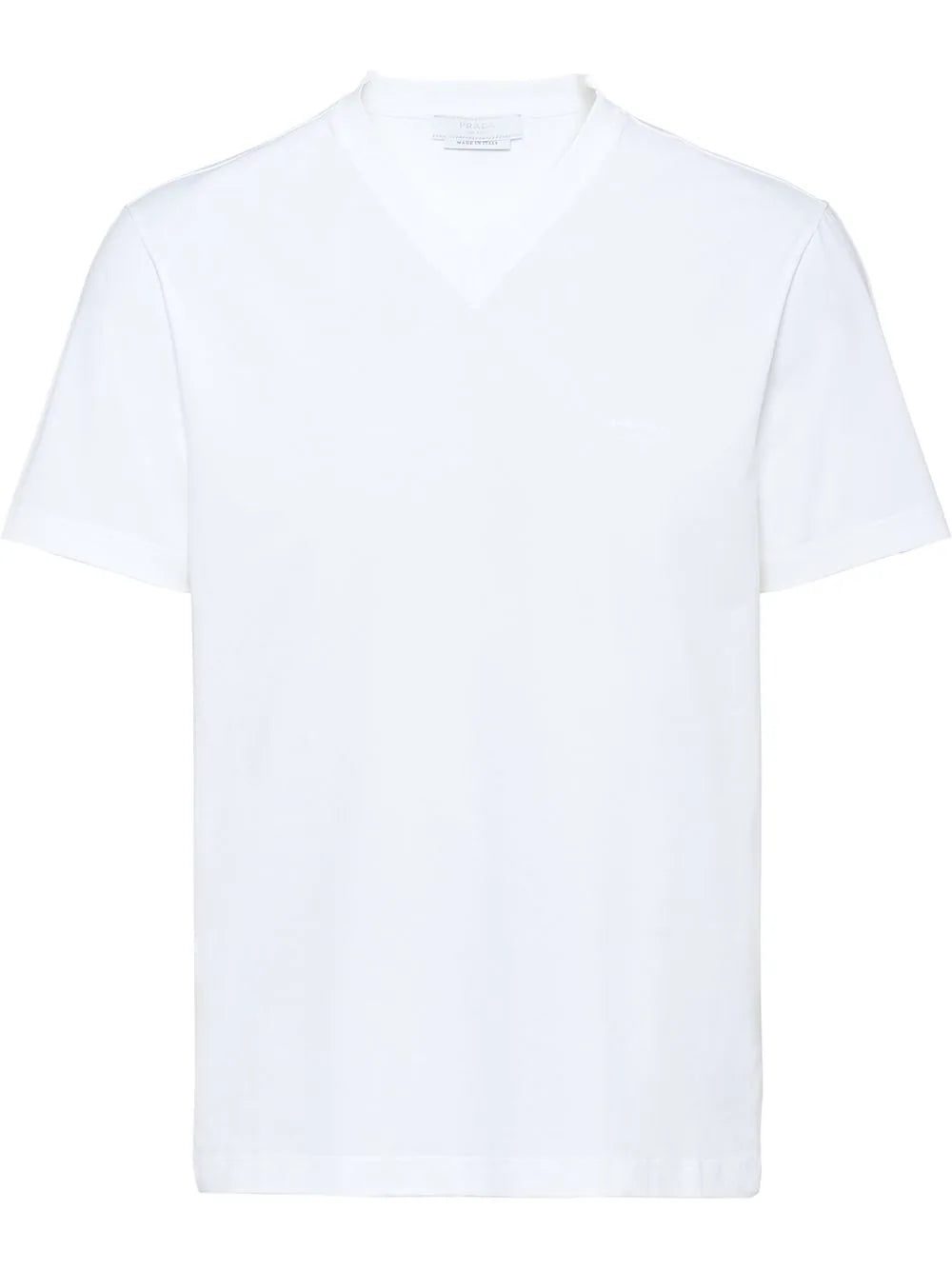 White cotton blend cotton T-shirt from Prada featuring a v-neck, short sleeves, a relaxed fit and a ribbed hem and cuffs.