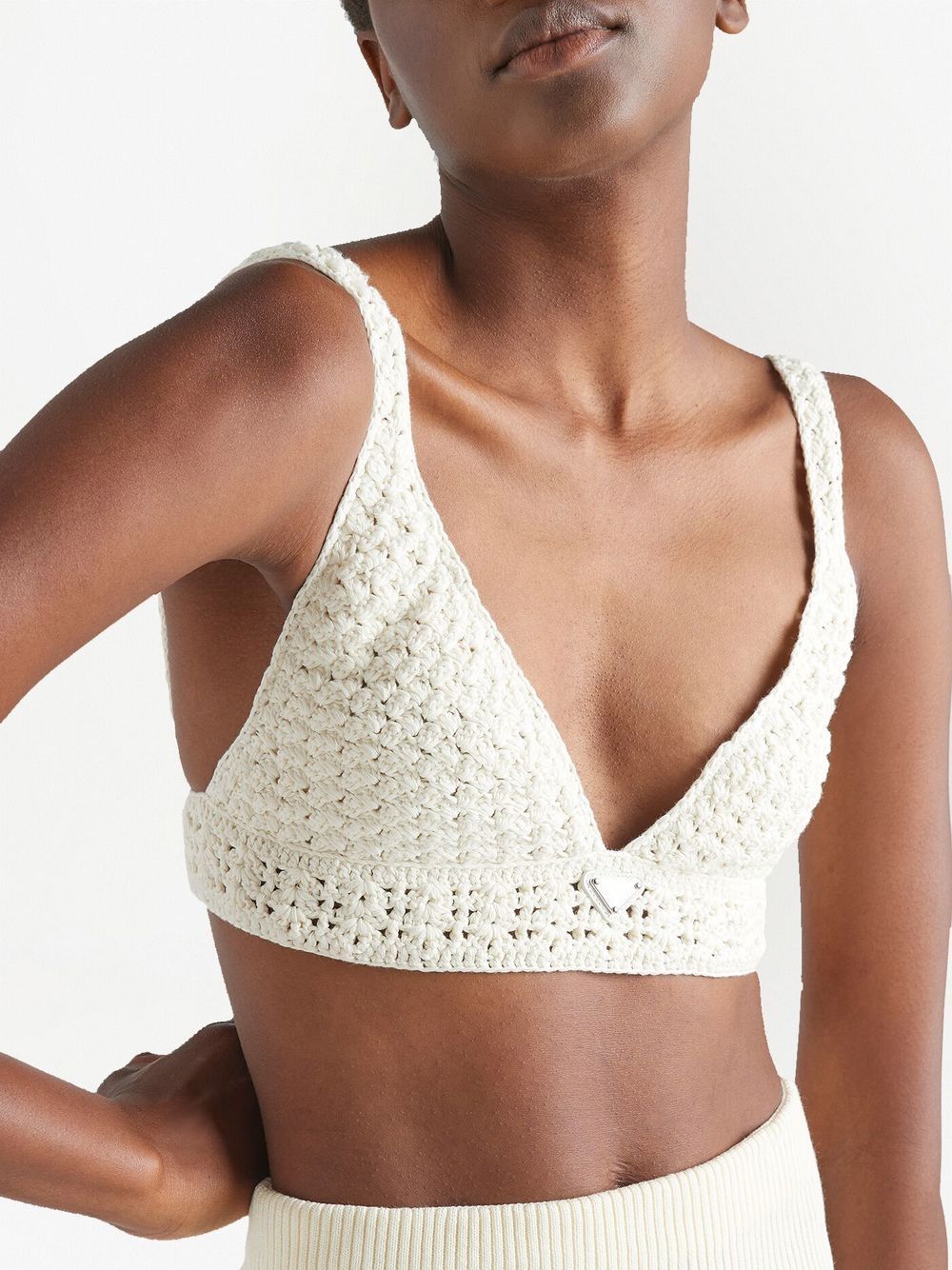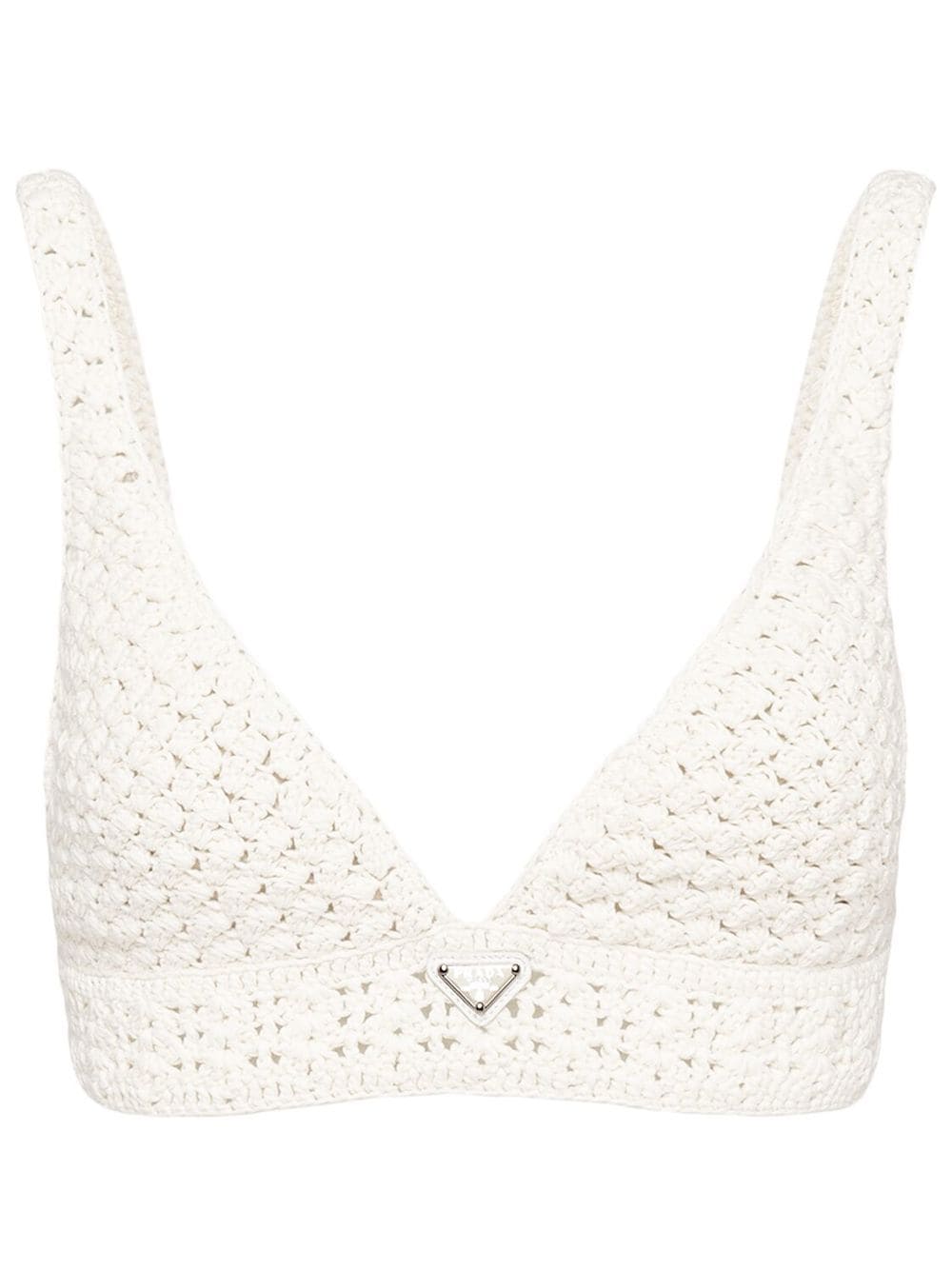 crochet cropped top from PRADA featuring ivory white, cotton, crochet design, triangle logo, triangle cup and rear hook and eye fastening.