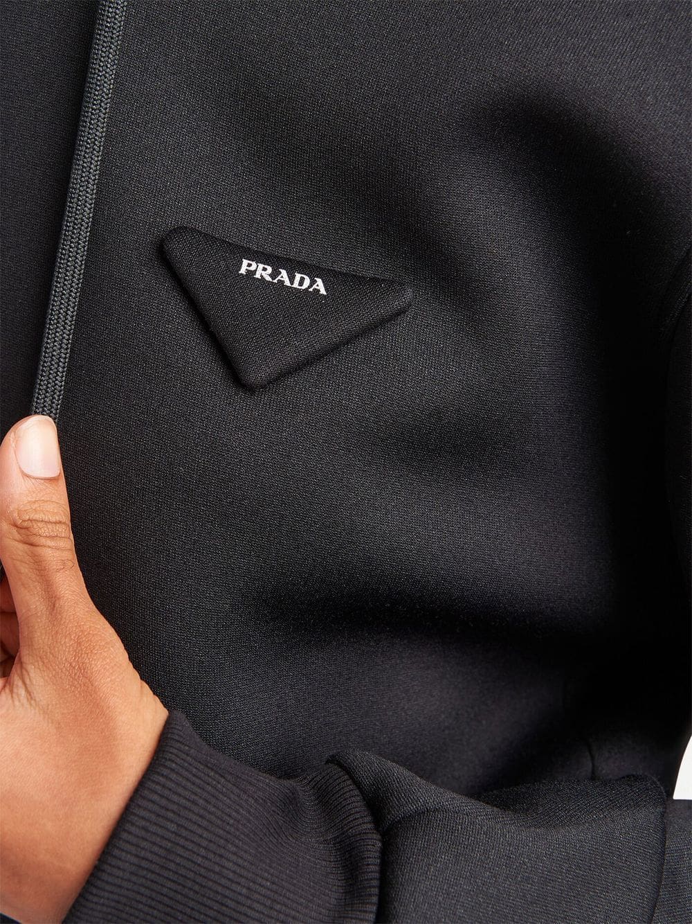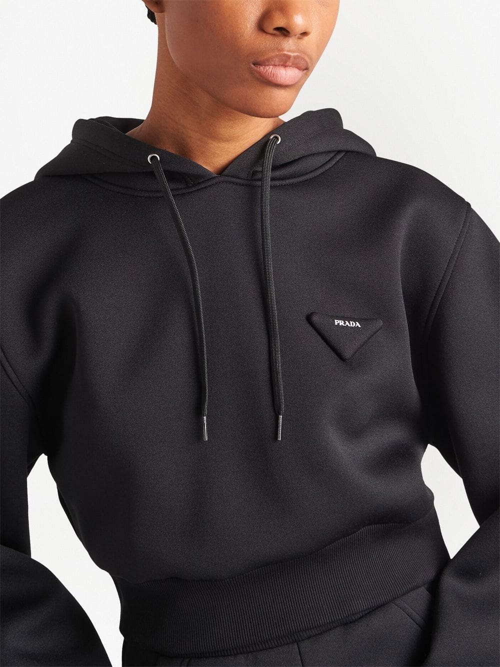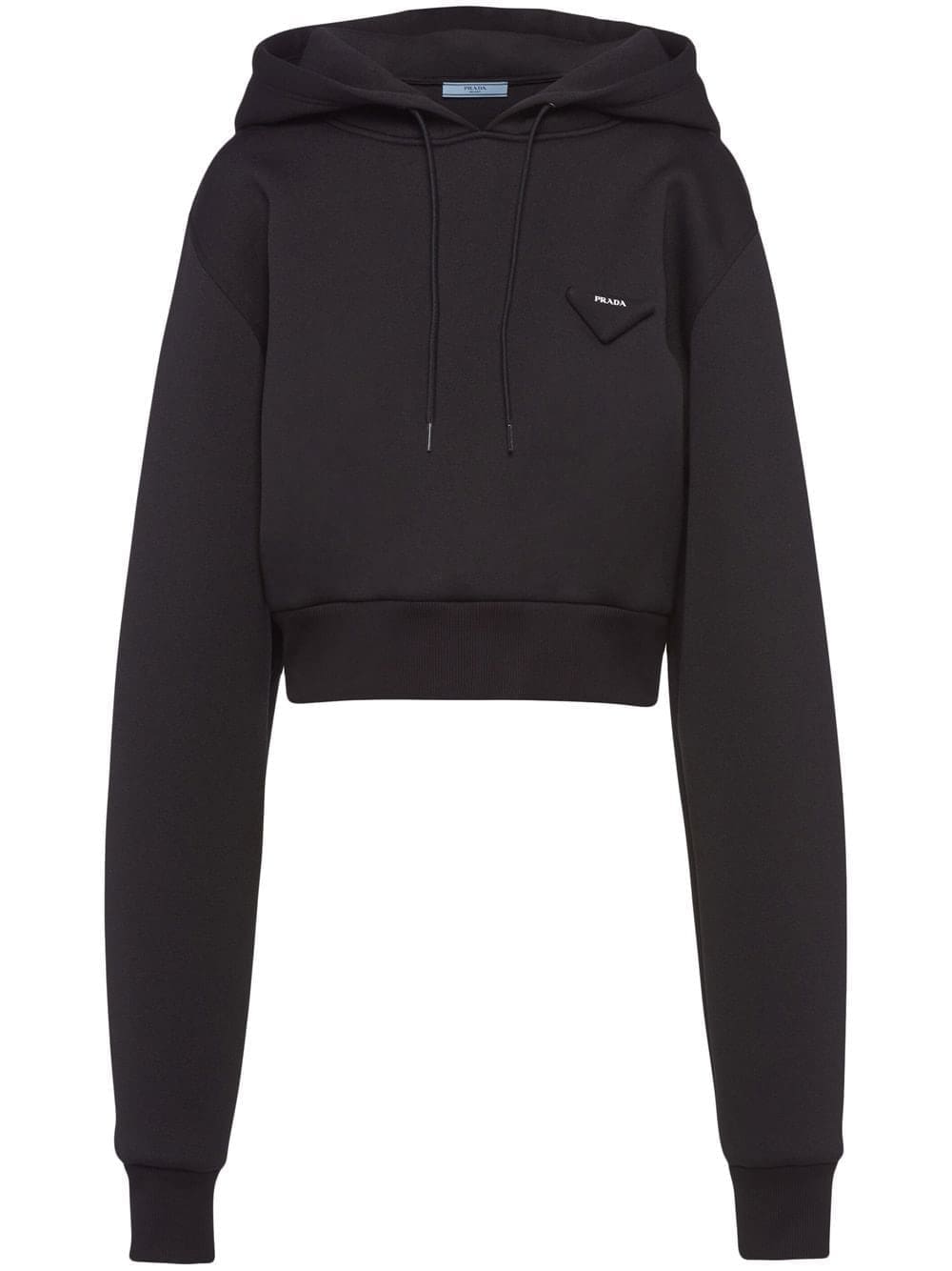 black jersey fleece triangle logo patch at the chest drawstring hood drop shoulder long sleeves ribbed cuffs ribbed hem cropped