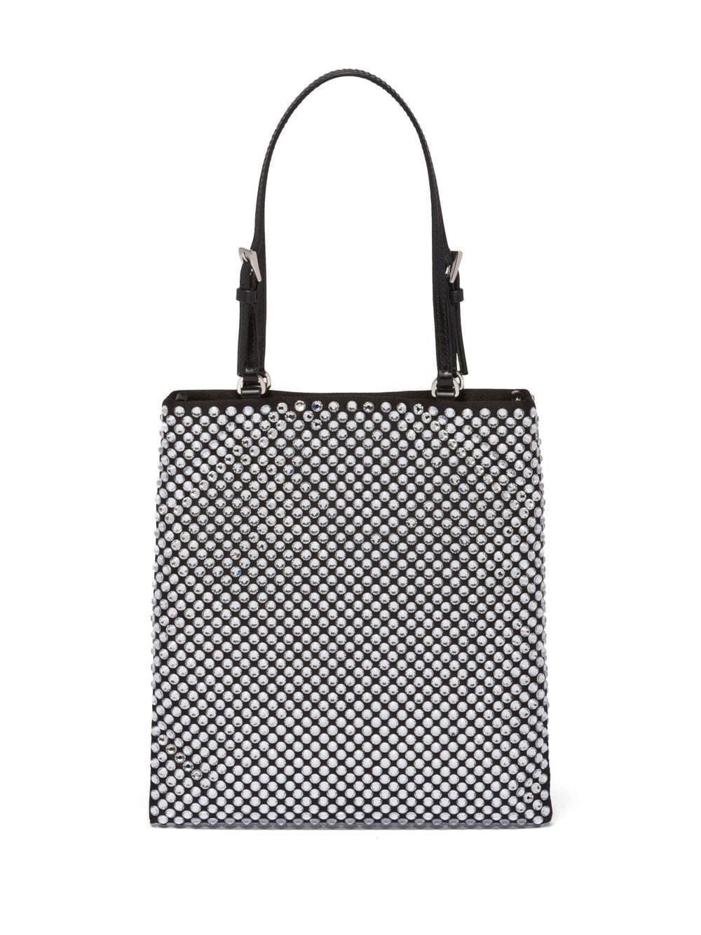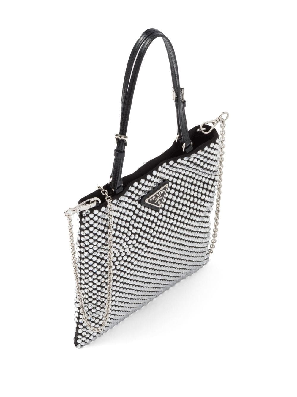 black satin weave crystal embellishment enamel triangle logo chain-link shoulder strap two top handles concealed magnetic fastening main compartment internal logo plaque