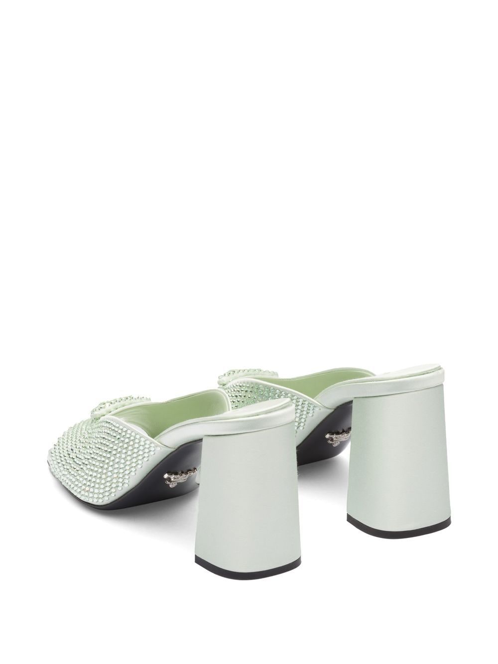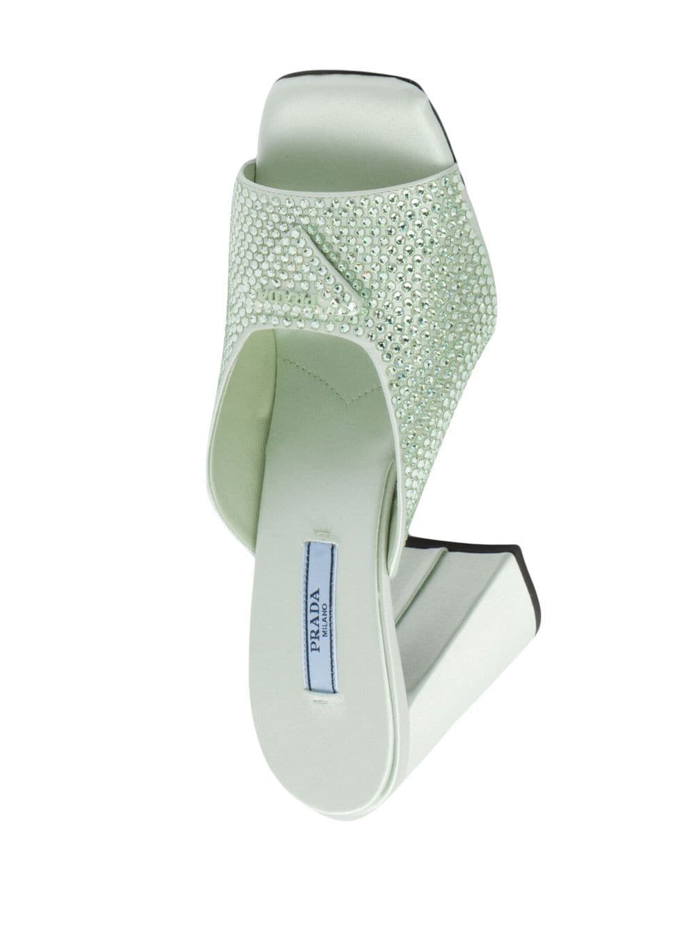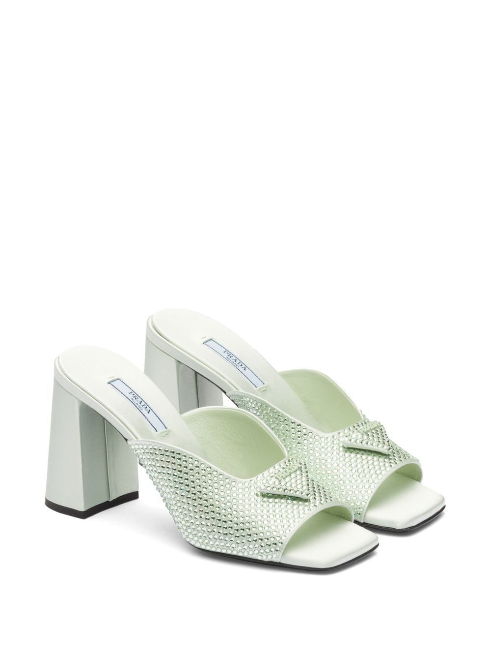 Prada showcases new variations of the iconic triangle with a glamorous update for AW22. These sandals project the refreshing concept, iridescent crystals adorn the mid-heel silhouette whilst they feature the triangle logo in a slightly padded, sparkling form to the front.