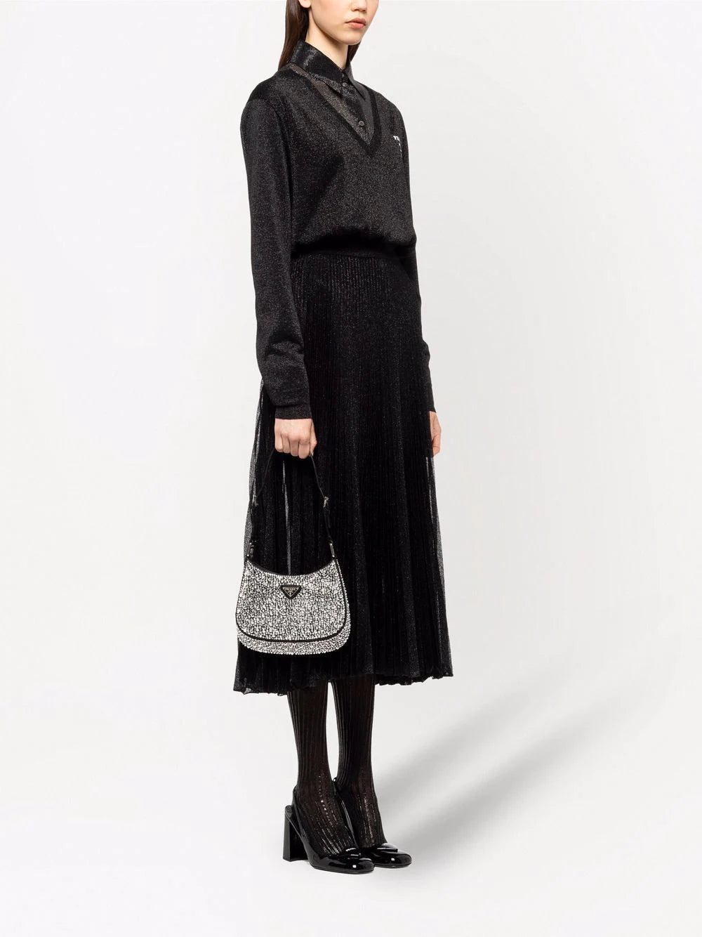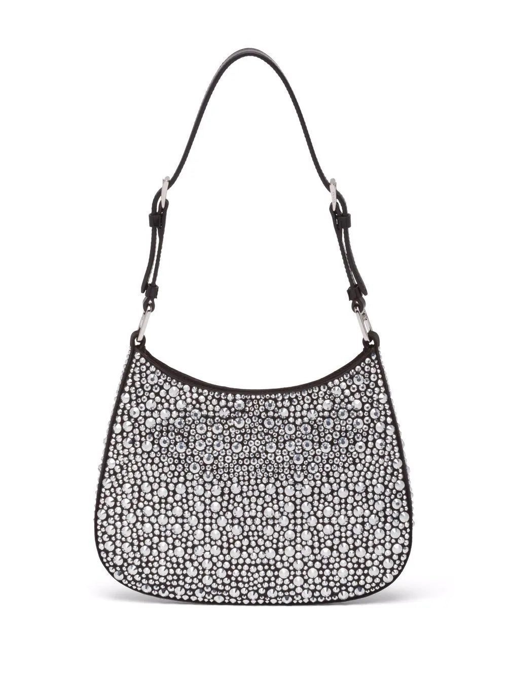 Prada embraces maximalist embellishment with this satin iteration of the Cleo bag. Decorated with the brand's signature triangle logo plaque, this design is adorned with synthetic crystals for a lustrous completion.Â