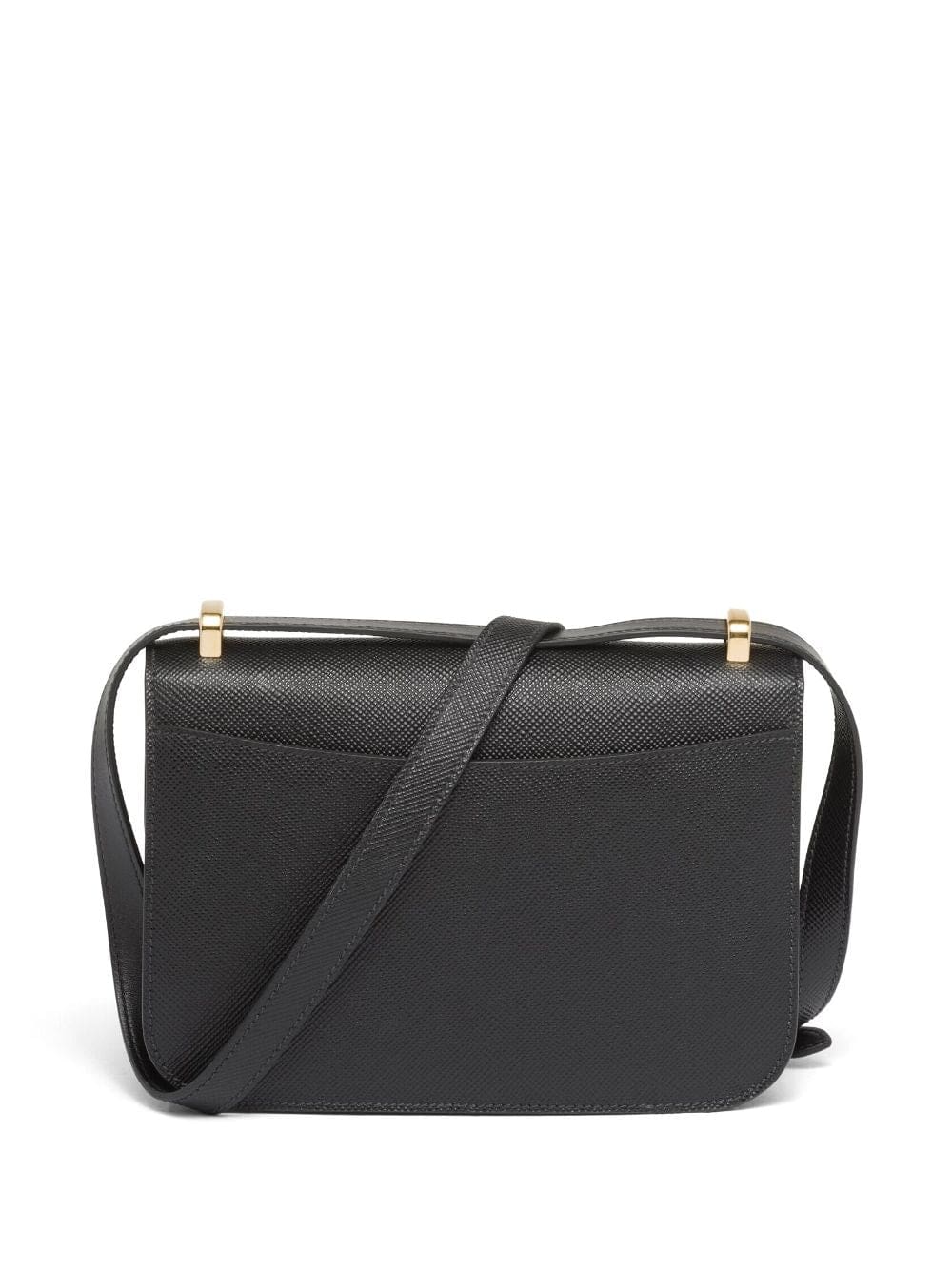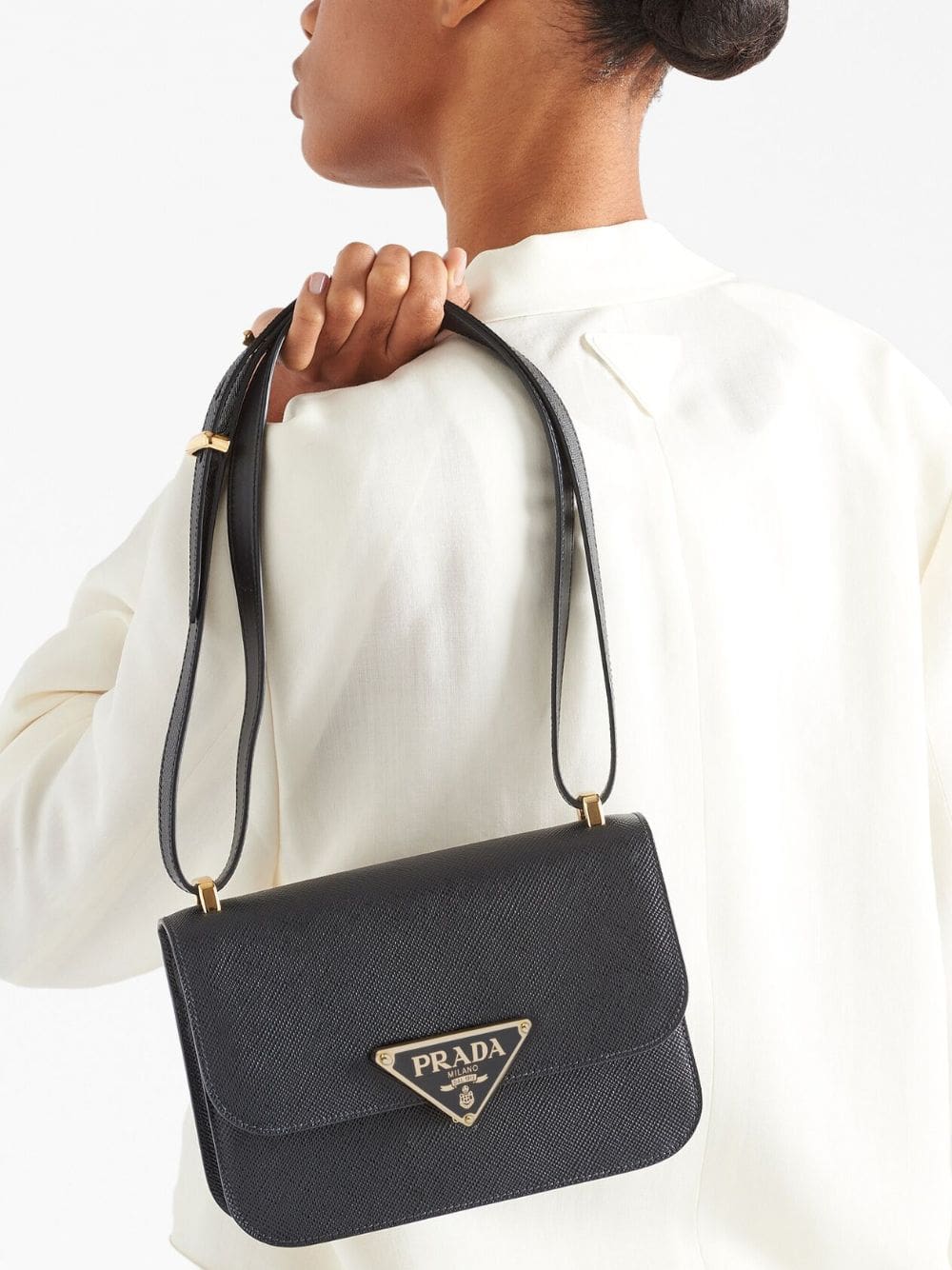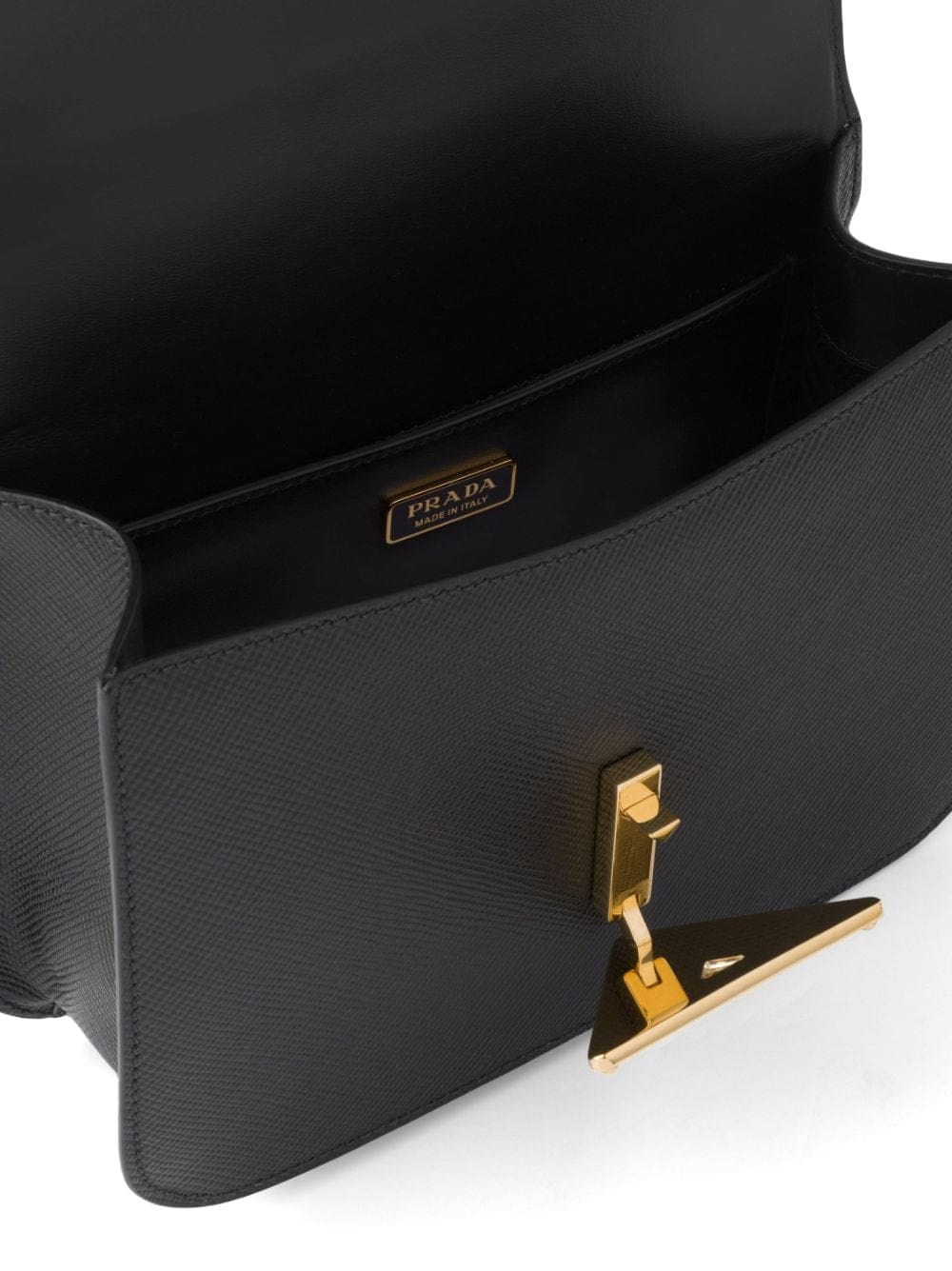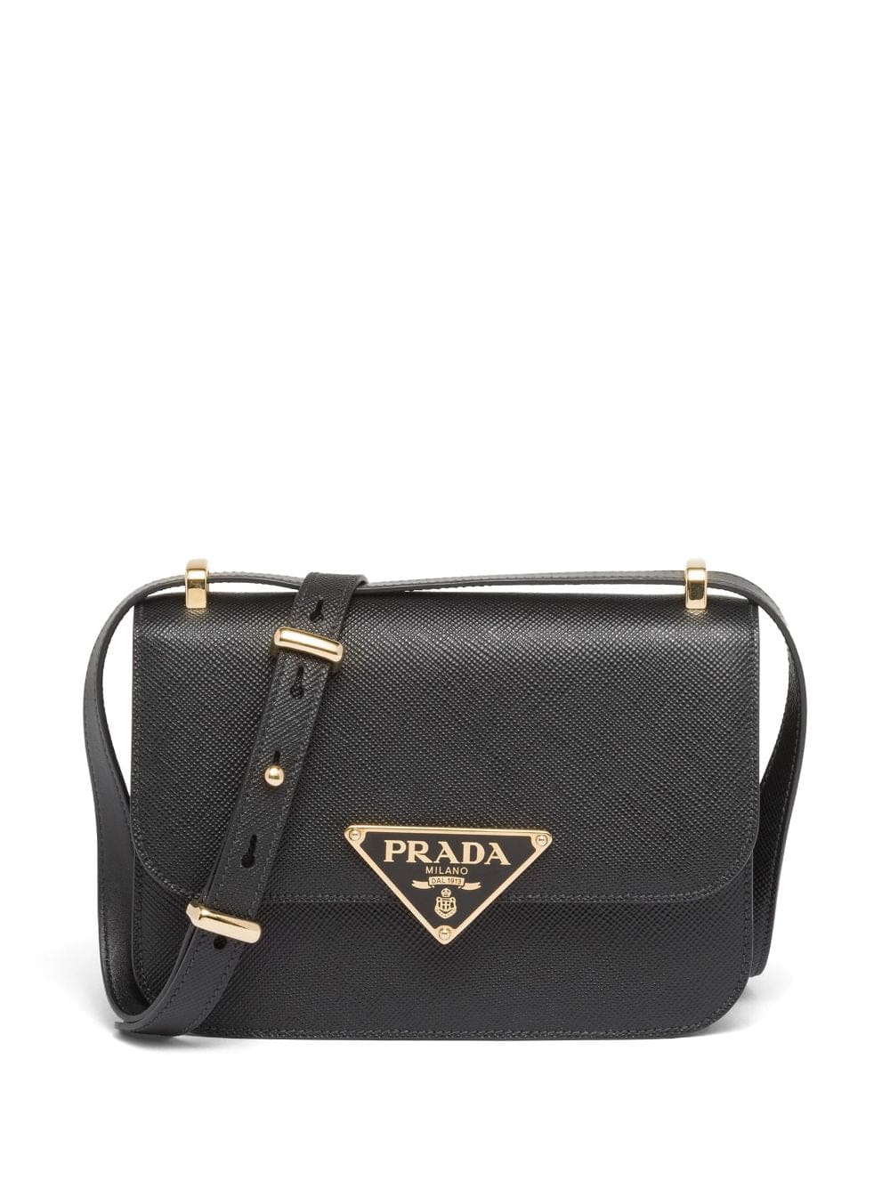 Being the brand's emblem since it was first used by Mario Prada in 1913, the signature enamel triangle logo takes centre stage in this Emblème design. With a smooth calf leather construction in a black colourway, the piece shows the iconic motif in polished gold-tone hardware.