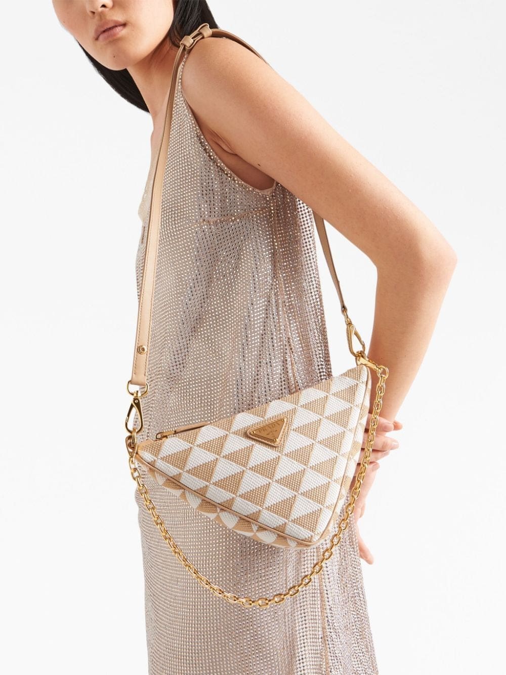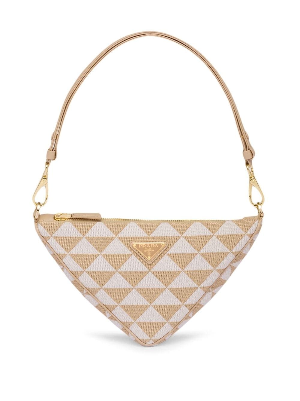 Prada's iconic triangle symbol is embodied by this embroidered shoulder bag. Its recognisable geometric silhouette is adorned with the brand's iconic Symbole jacquard and triangle logo plaque to the front. A detachable chain-link strap allows for versatile styling.