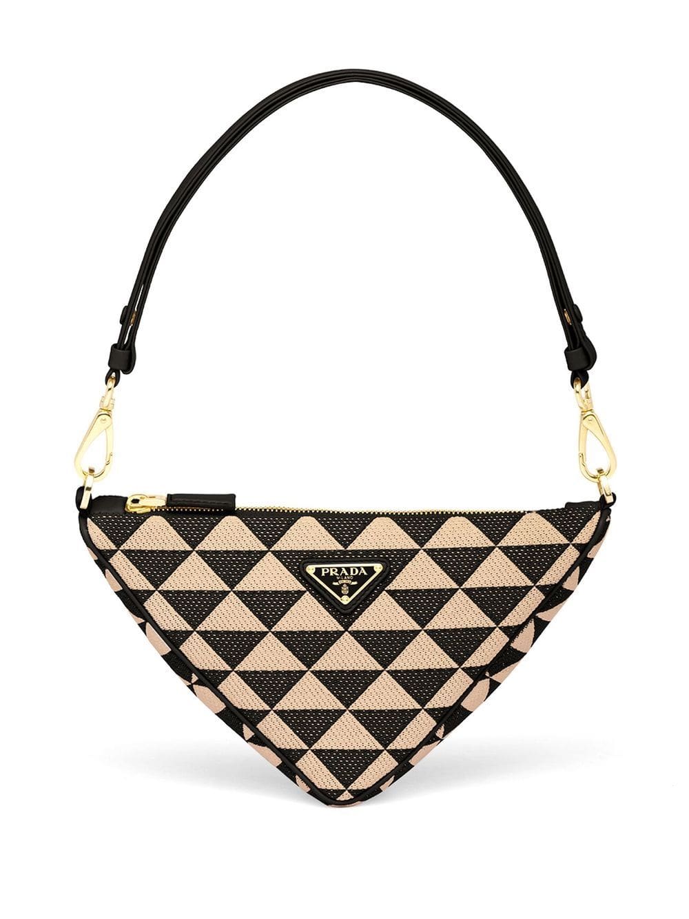 This mini bag is defined by its triangular silhouette, reminiscent of Prada's celebrated geometric shape. Meanwhile, the enamel triangle logo arrives at the front of the design, offering a contrasting textural element.