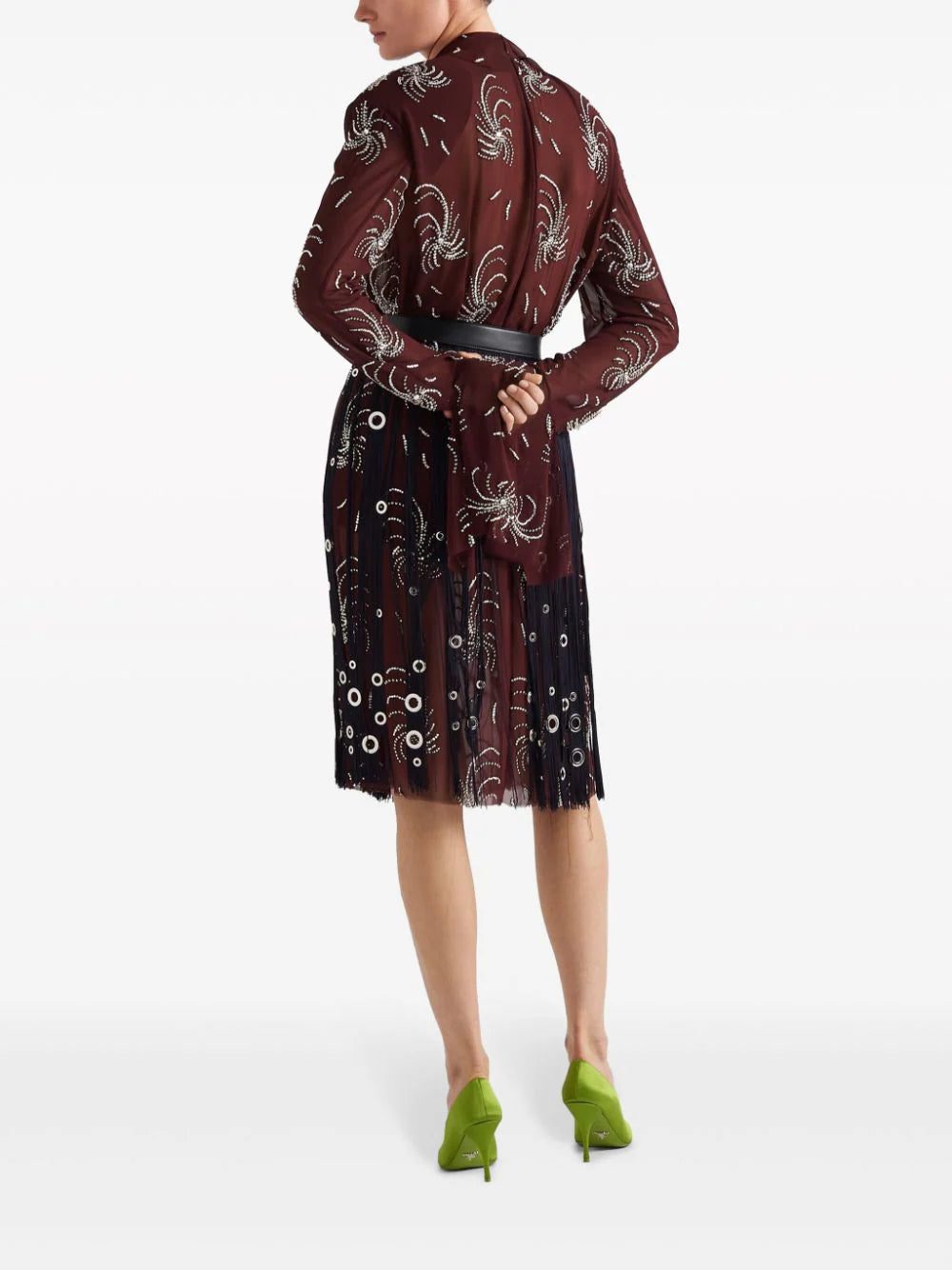 Prada showcases a bold design with this midnight blue skirt, defined by the flowing fringe construction. Scattered eyelets provide an edgy finishing touch.