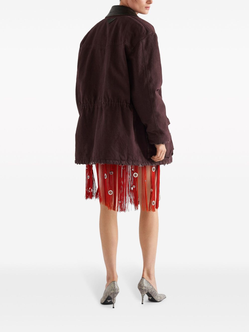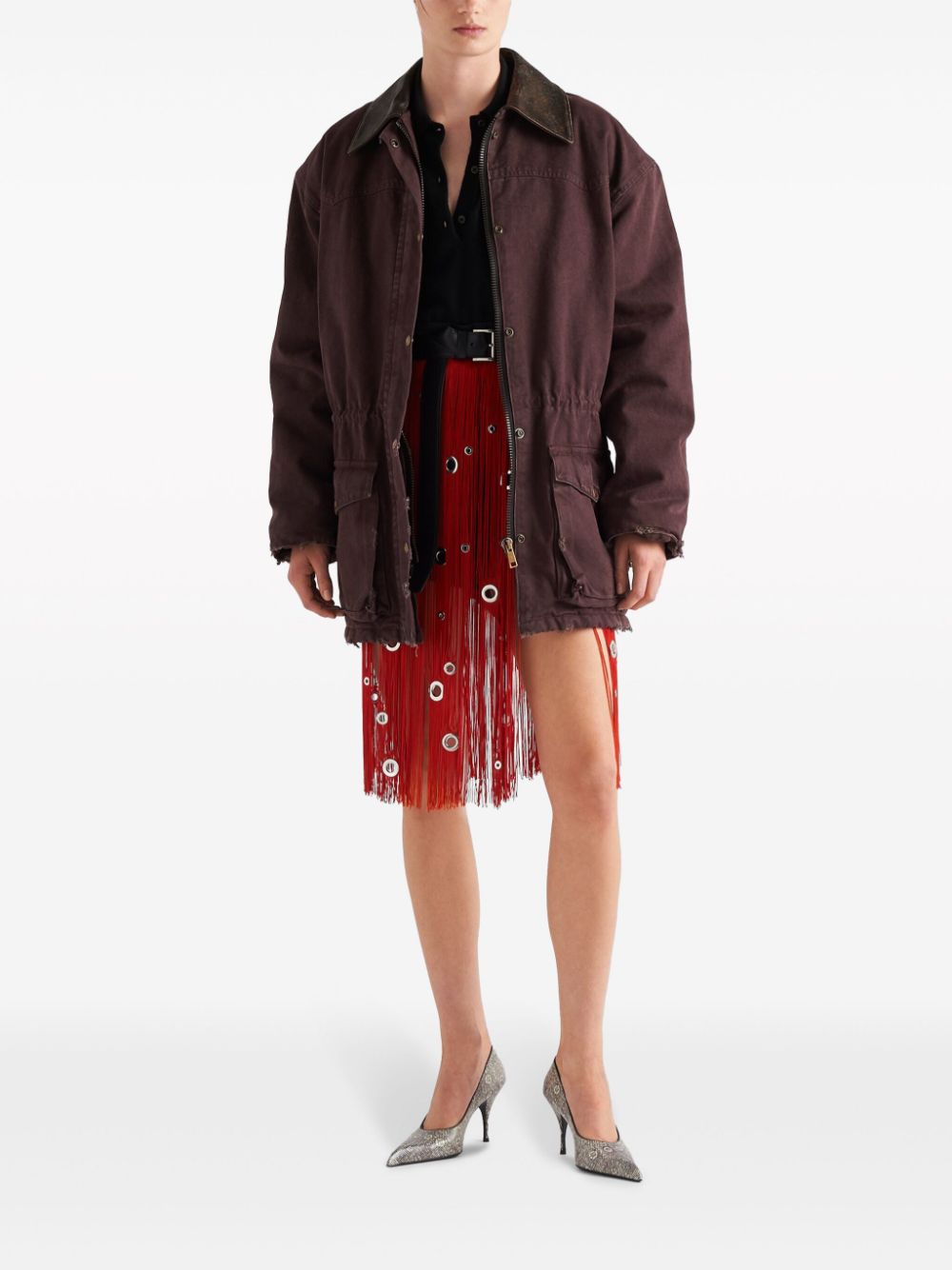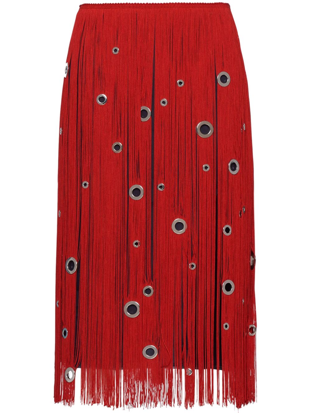 Prada showcases a bold design with this red skirt, defined by the flowing fringe construction. Scattered eyelets provide an edgy finishing touch.