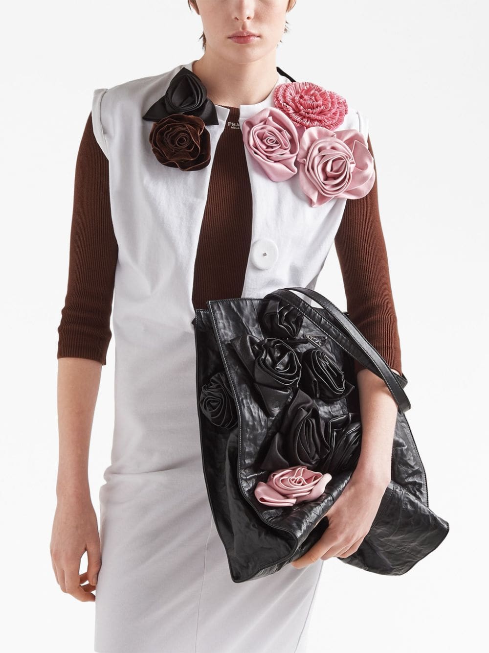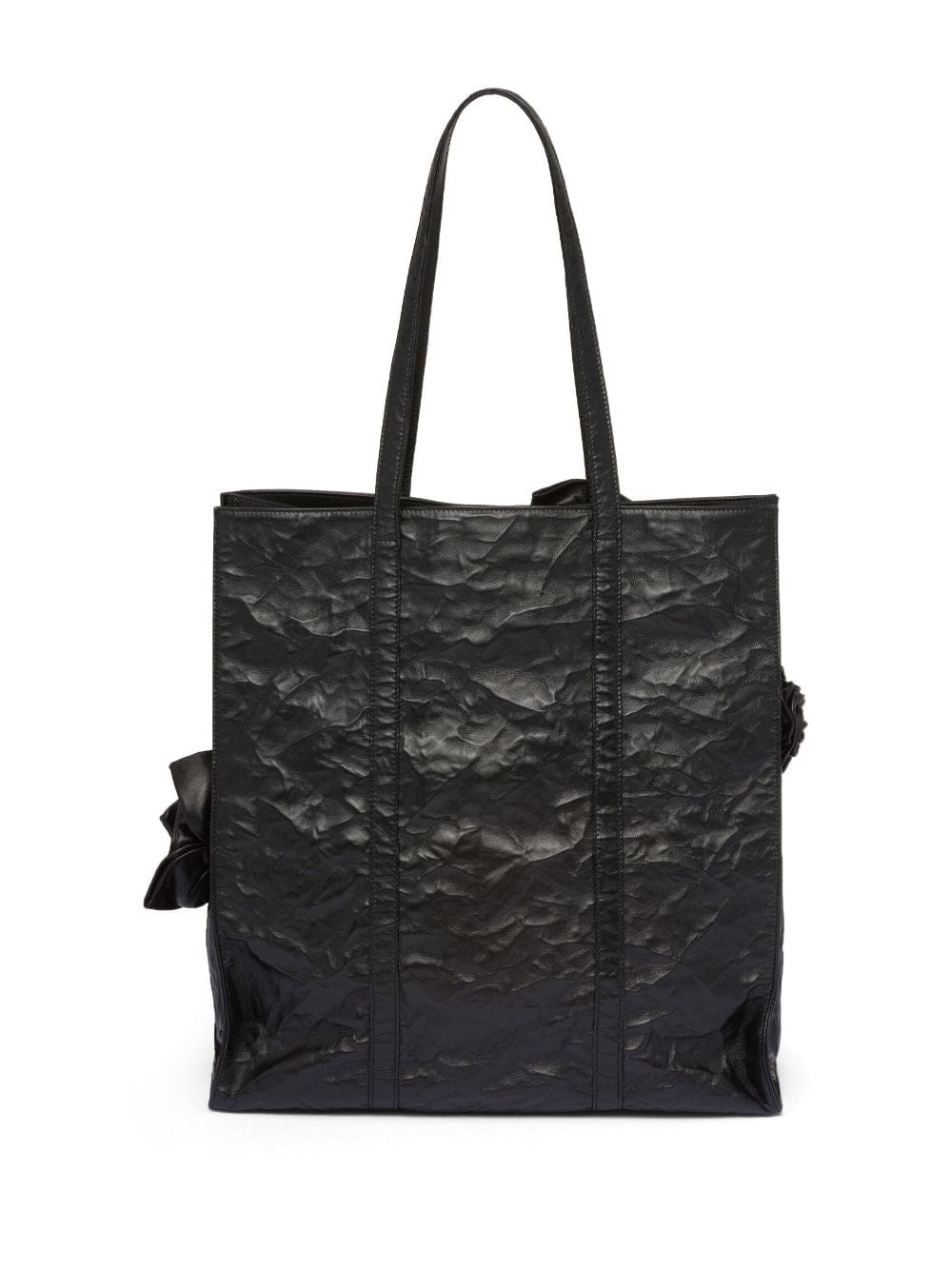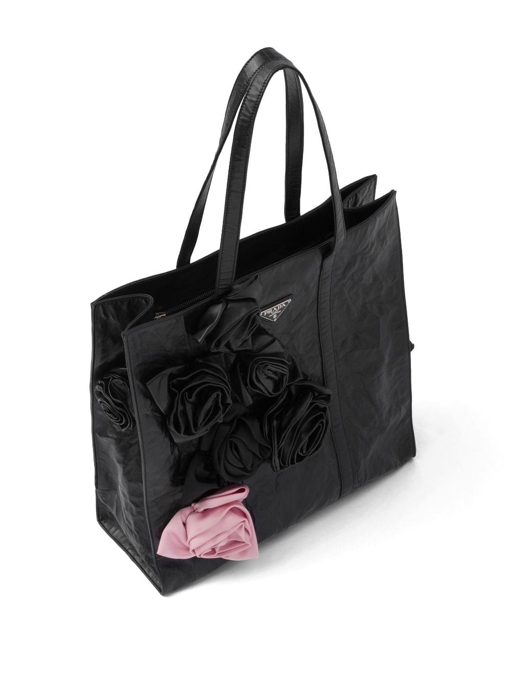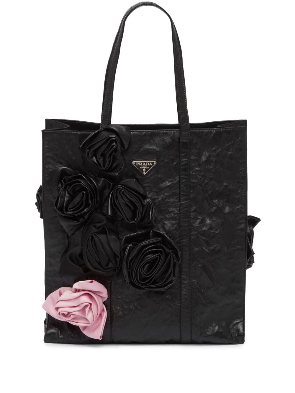 Crafted from glossy wrinkled leather, this tote bag by Prada stands out thanks to the large floral appliqués made and applied by hand. Presented for the SS23 collection, the accessory is finished with the iconic enameled metal triangle logo.