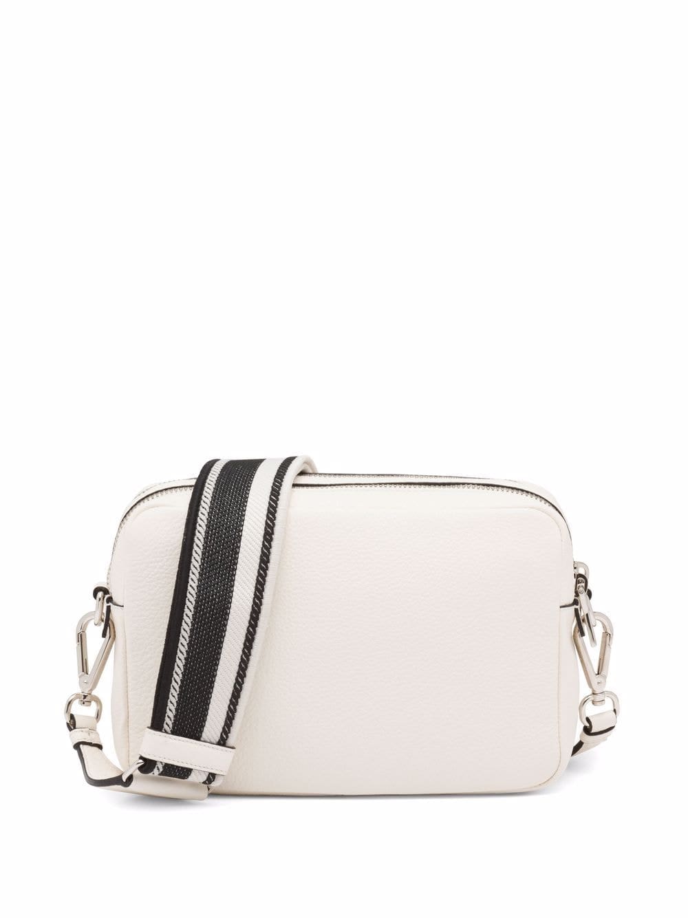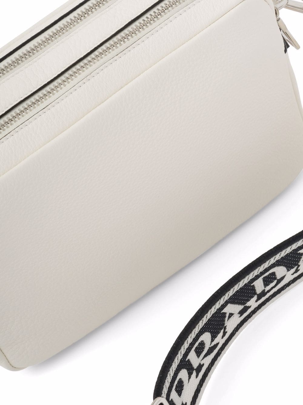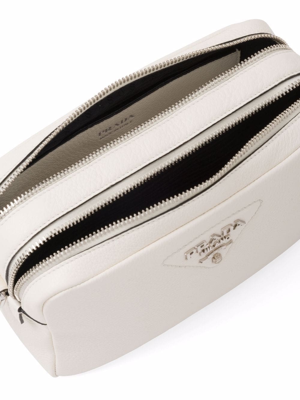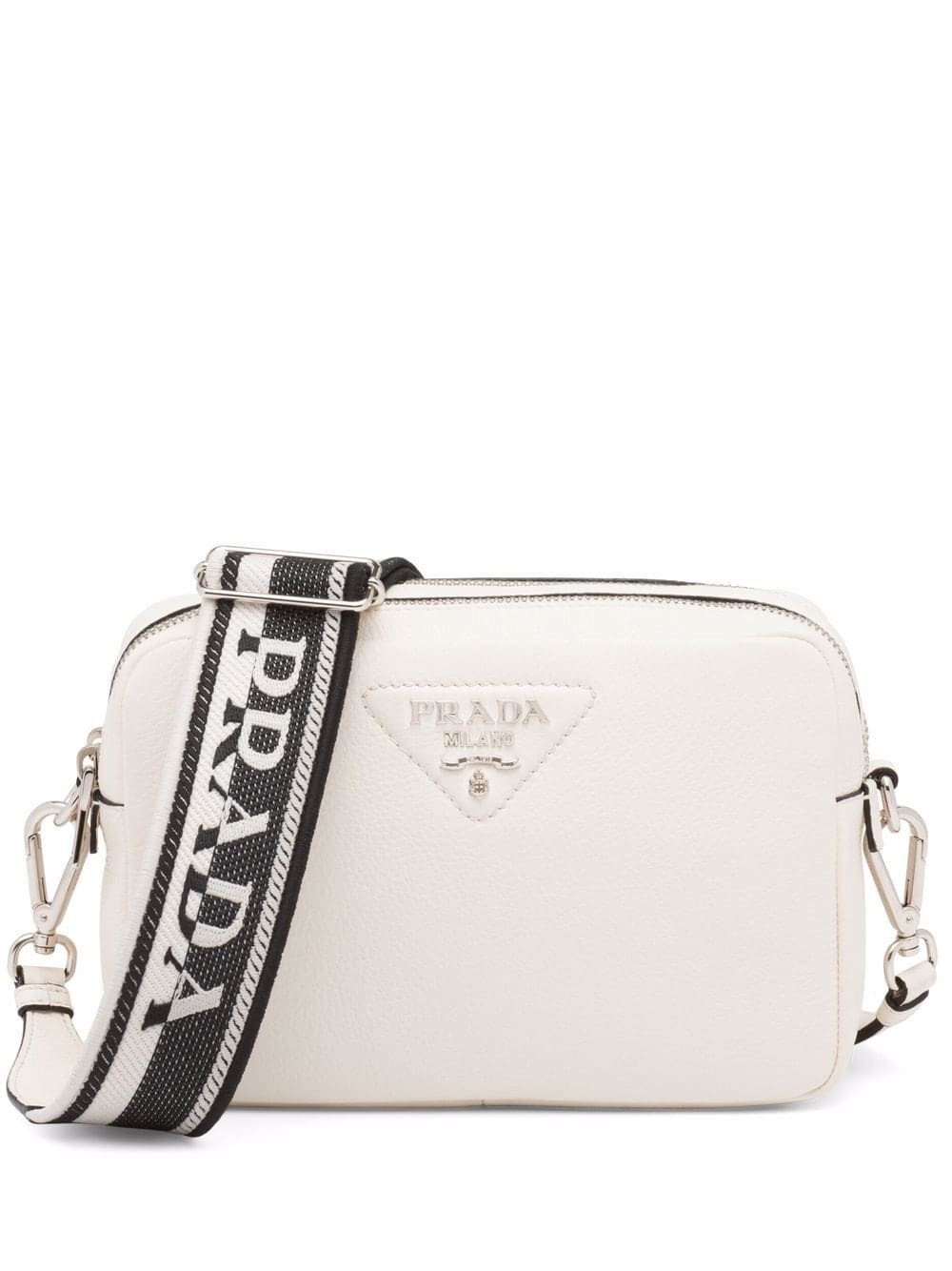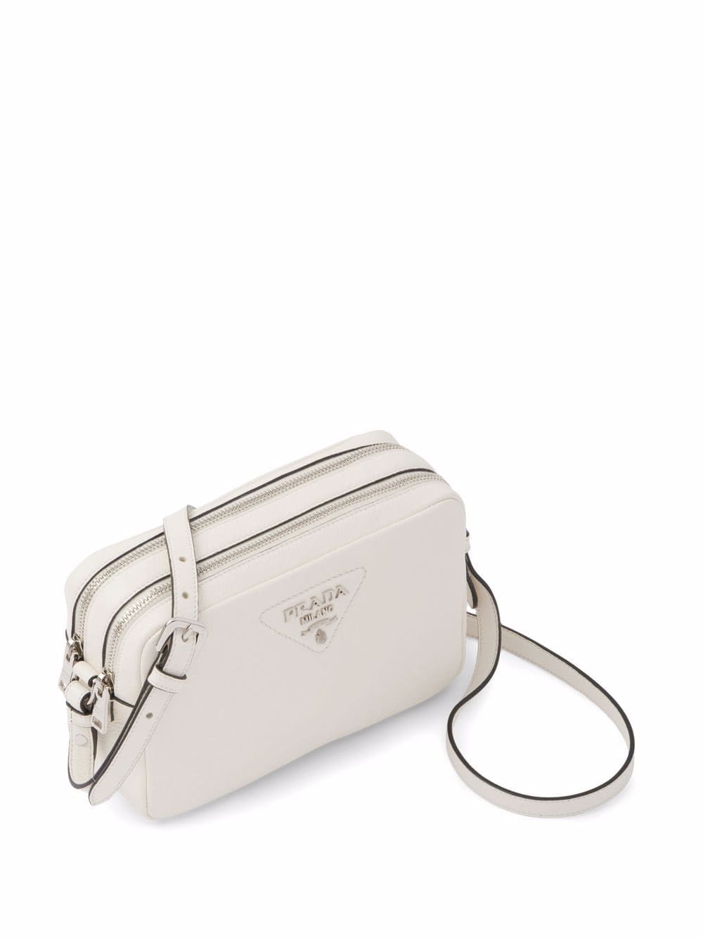 Prada's triangular logo plaque is an iconic motif for the brand that transcends seasons thanks to its traditional shape and refined lettering. Crafted from leather in a timeless white hue, this modern silhouette is decorated with the silver-tone lettering logo on the front and finished with two detachable and adjustable straps that allow the wearer to use it as a shoulder or crossbody bag.