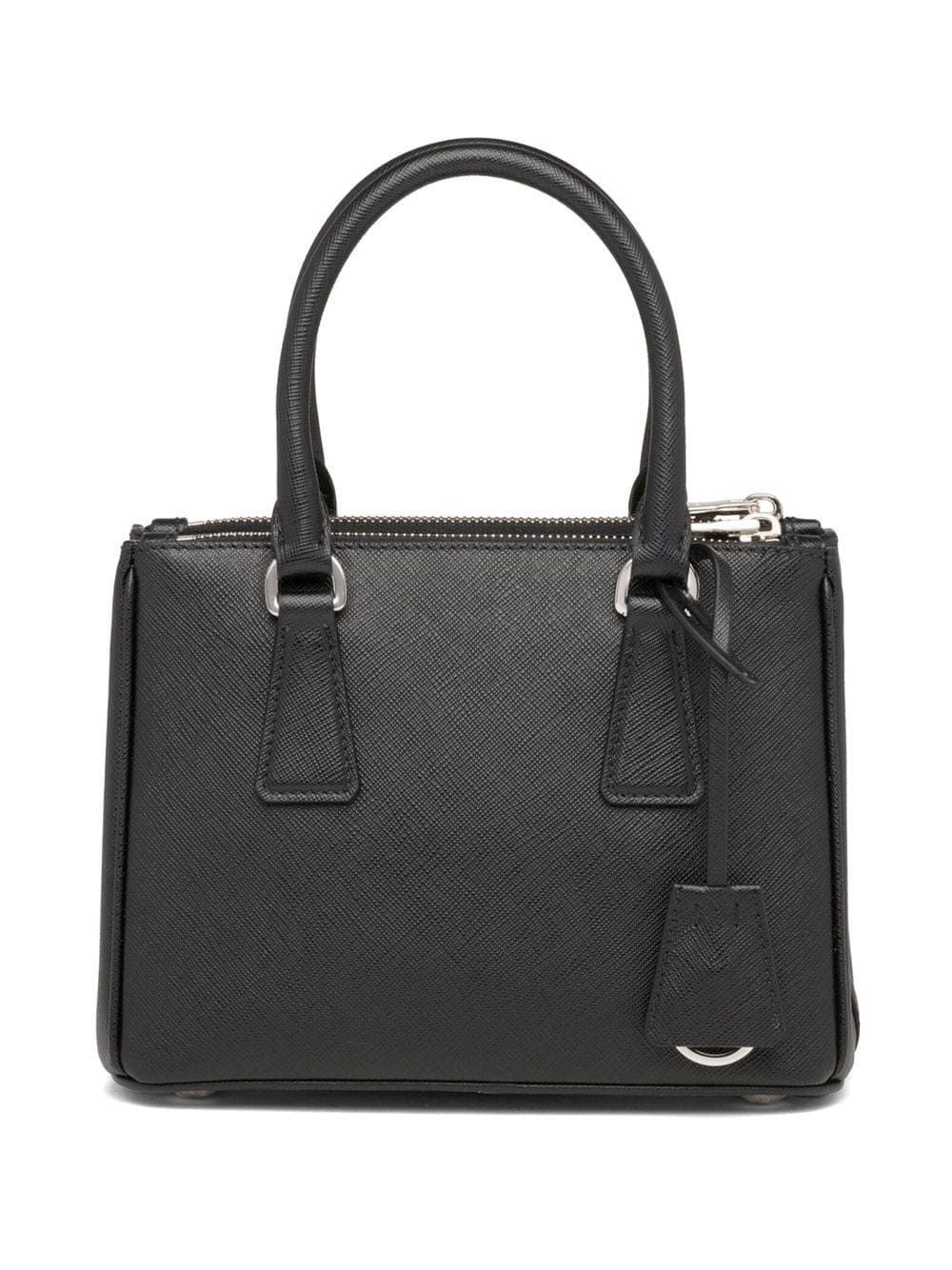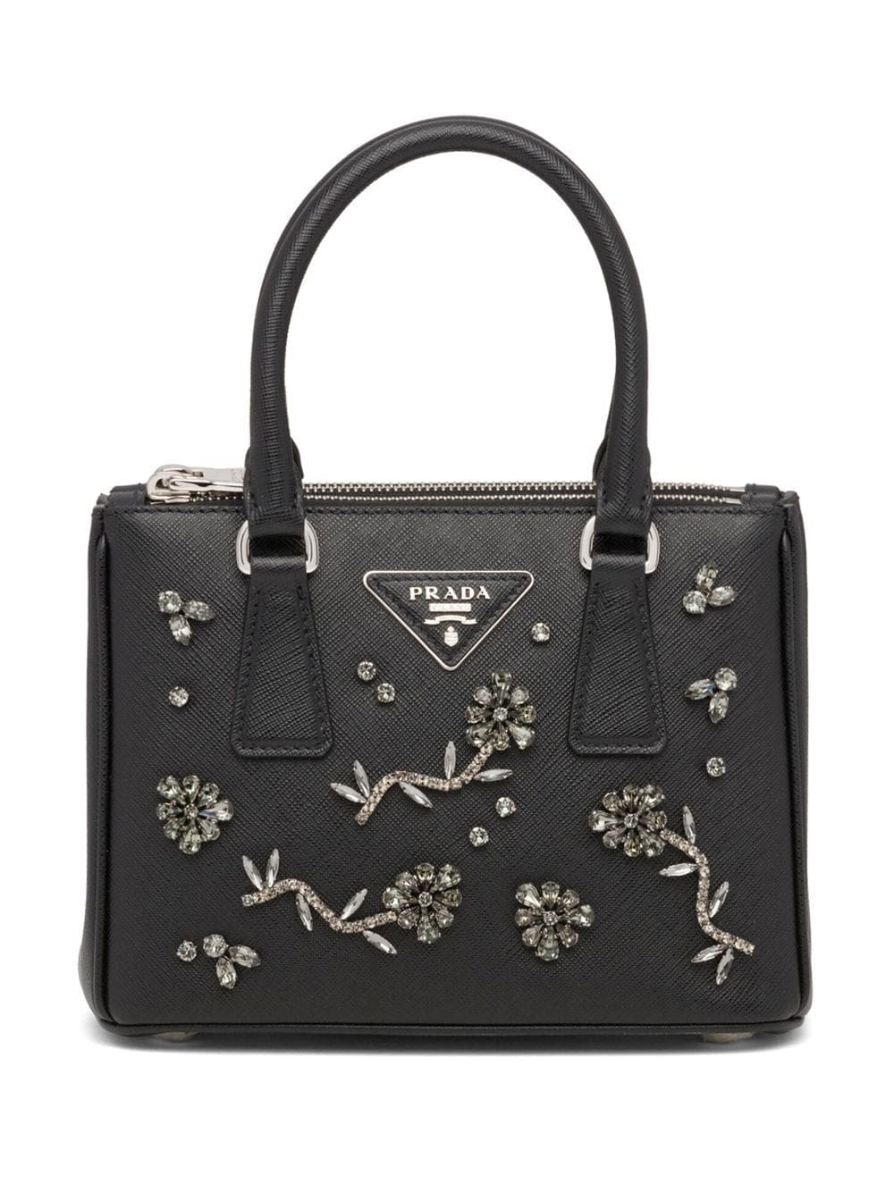 mini Galleria appliqué tote bag from PRADA featuring black, calf leather, crystal embellishment, floral appliqué, triangle logo, silver-tone hardware, leather tag, two rounded top handles, adjustable detachable shoulder strap and internal zip-fastening pocket.