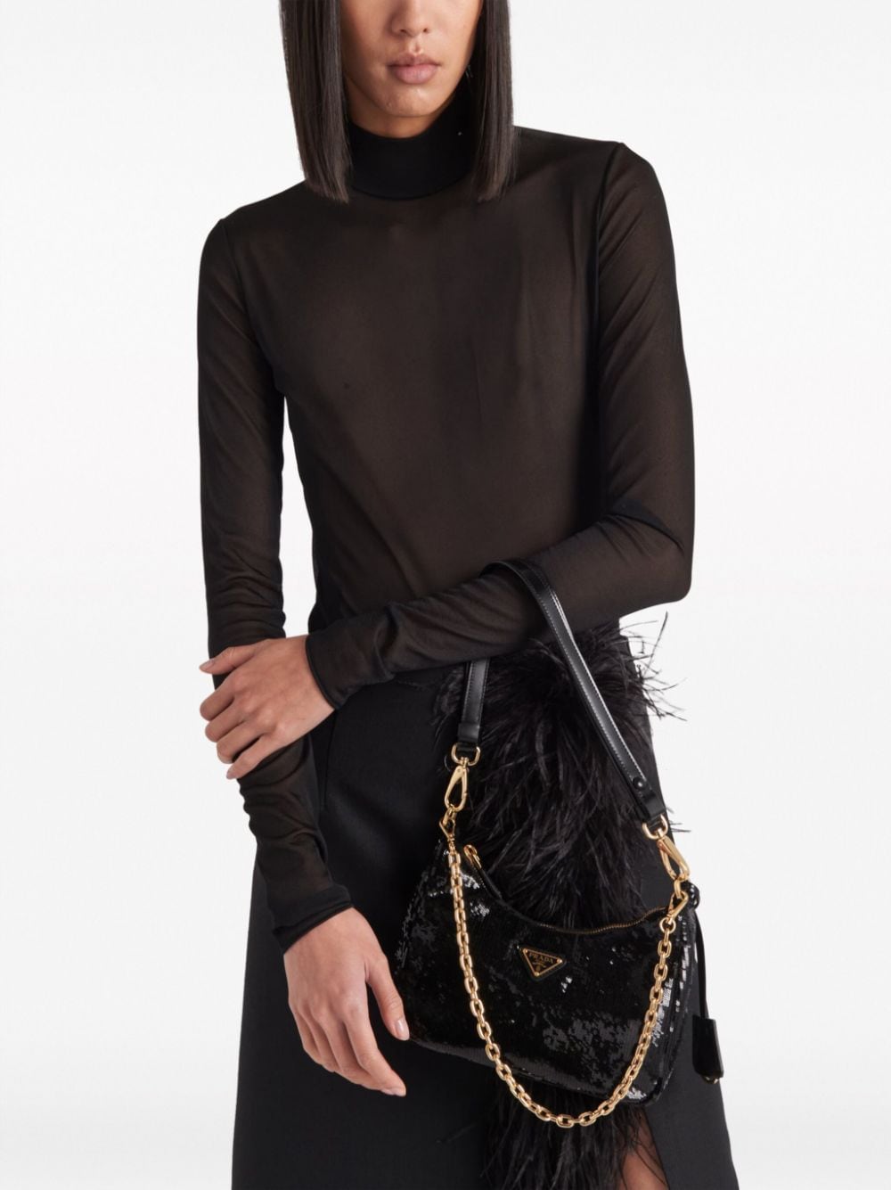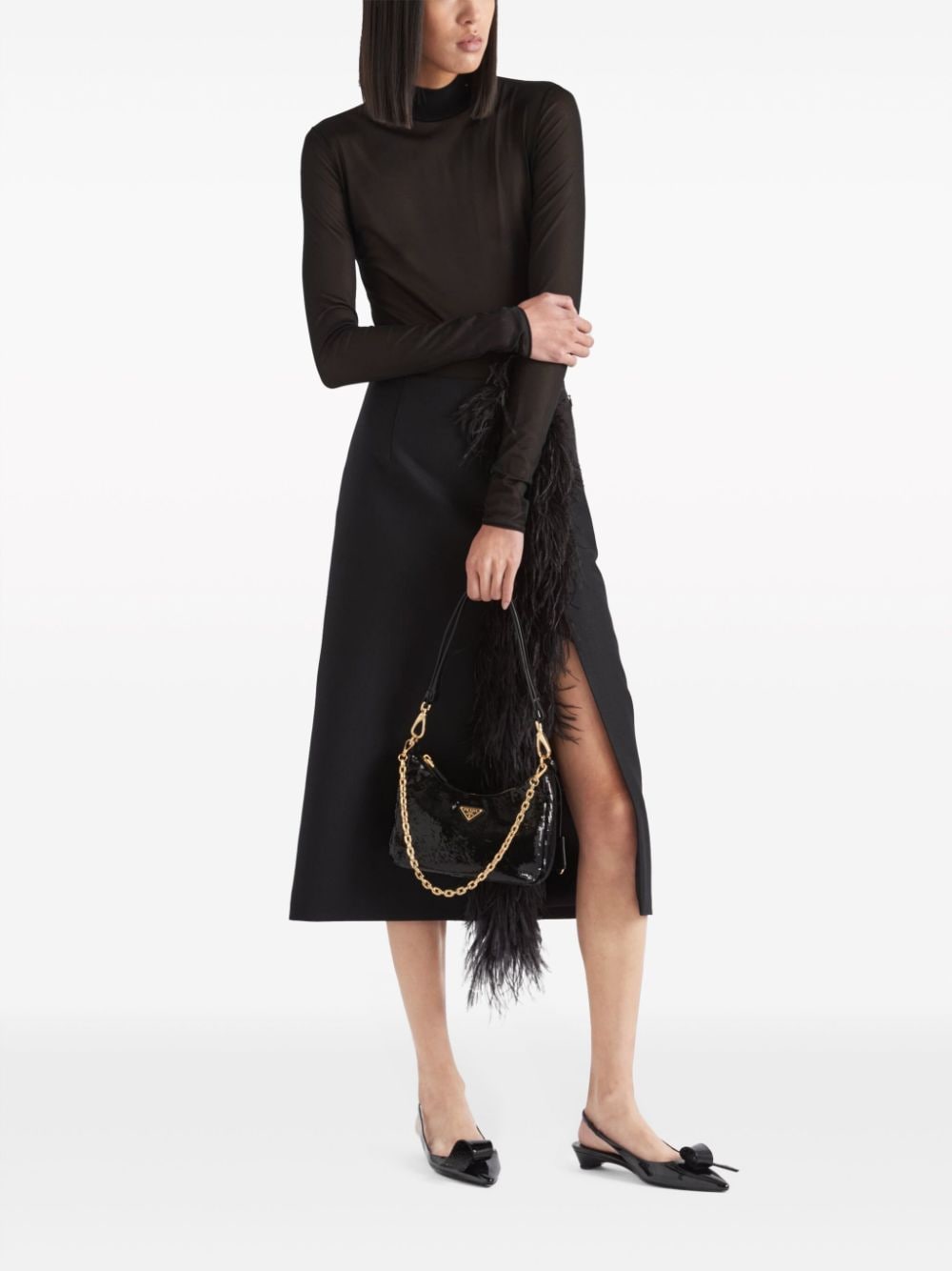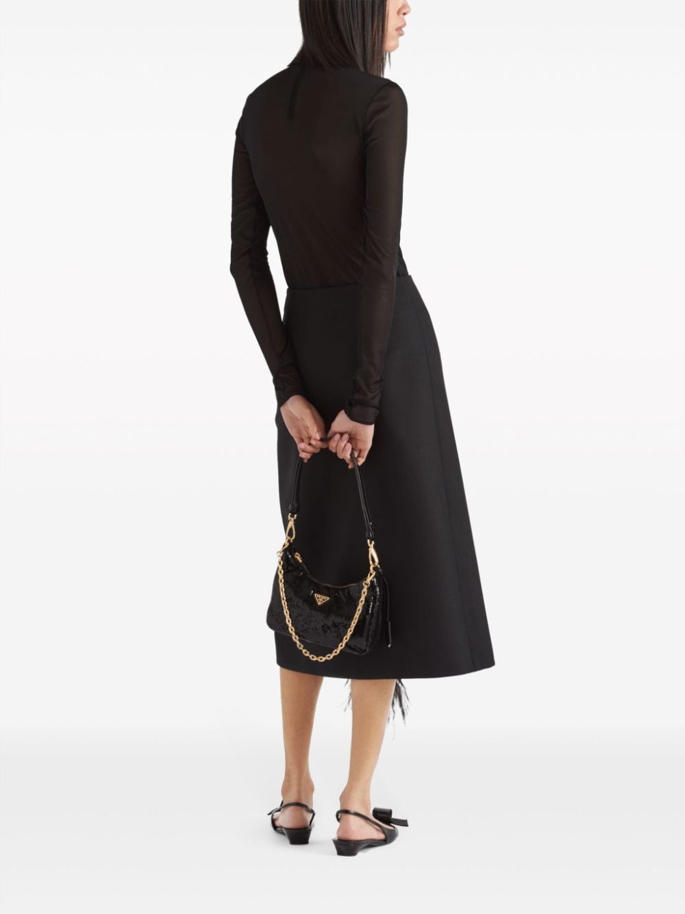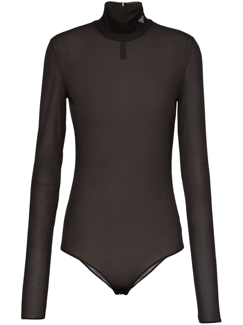 Prada's bodysuit showcases the brand's minimalist aesthetic. It's cut from lightweight black jersey and simply decorated with the signature triangle logo plaque at the neck.