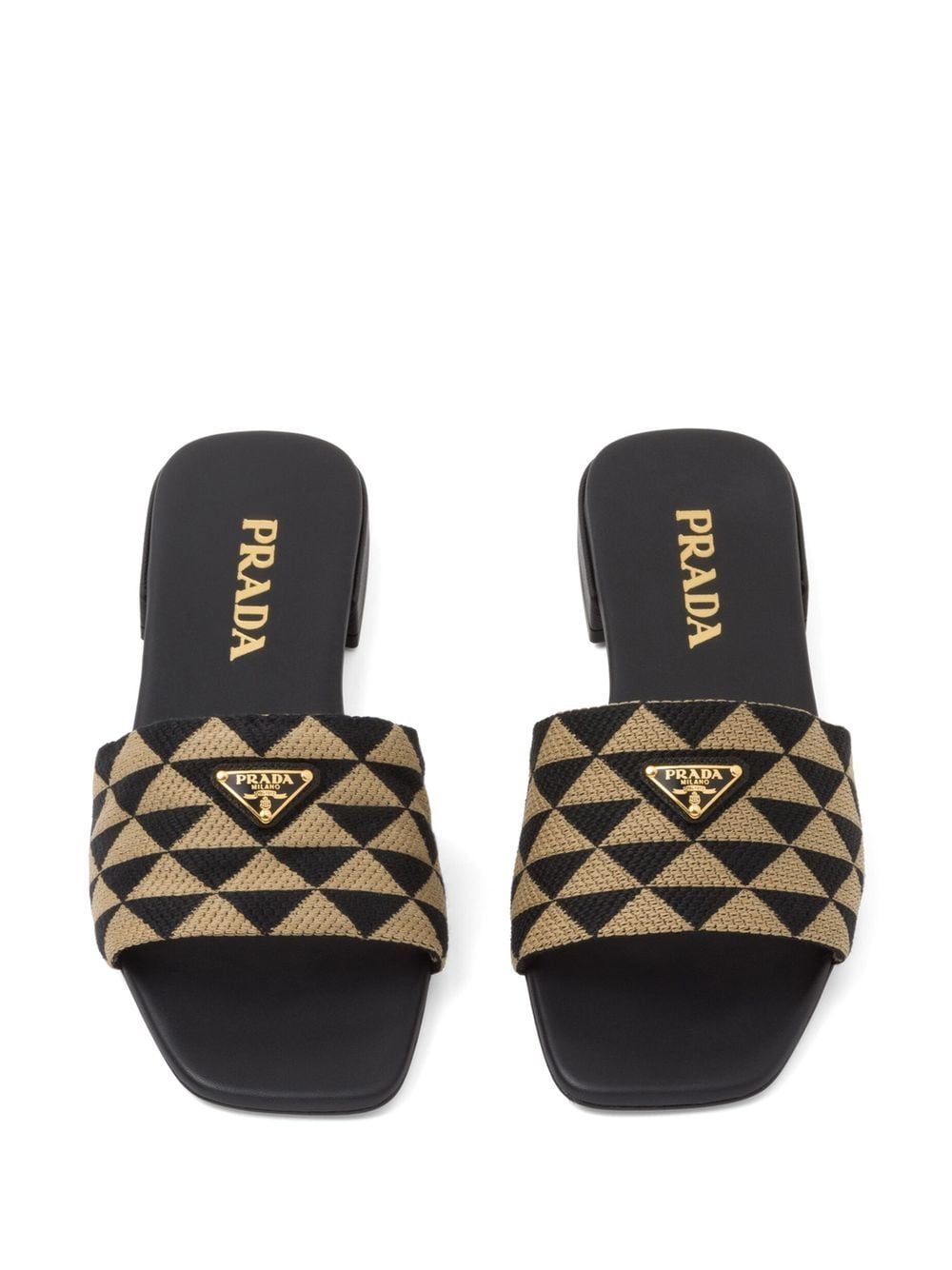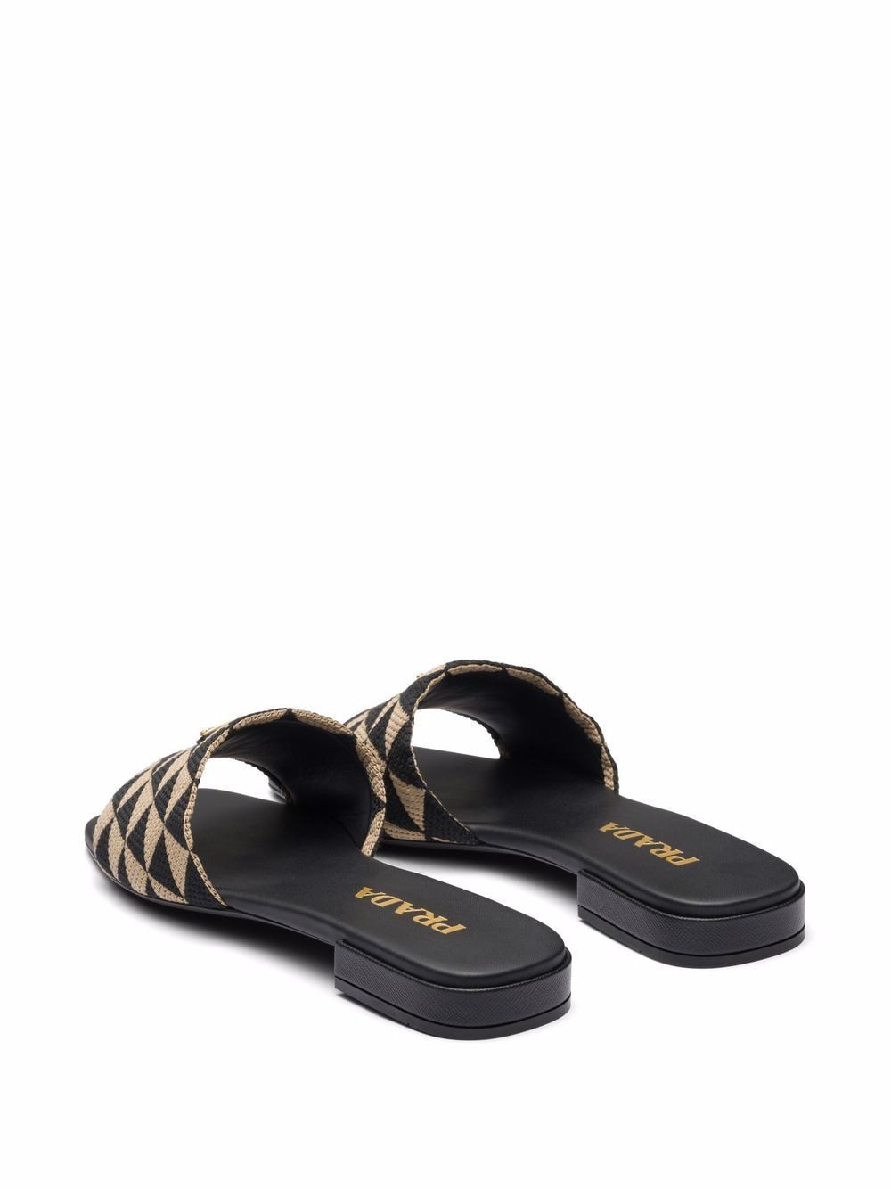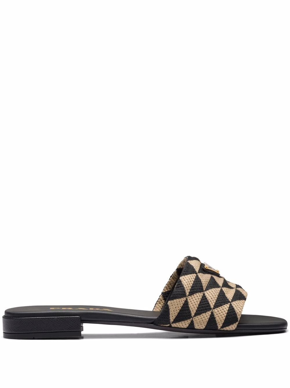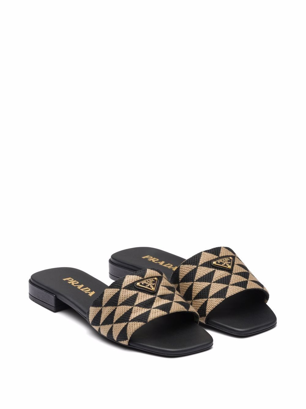 Transforming their favoured triangular shape into a two-tone geometric design, Prada presents these slides made instantly recognisable through the famed enamel logo plaque to the front.