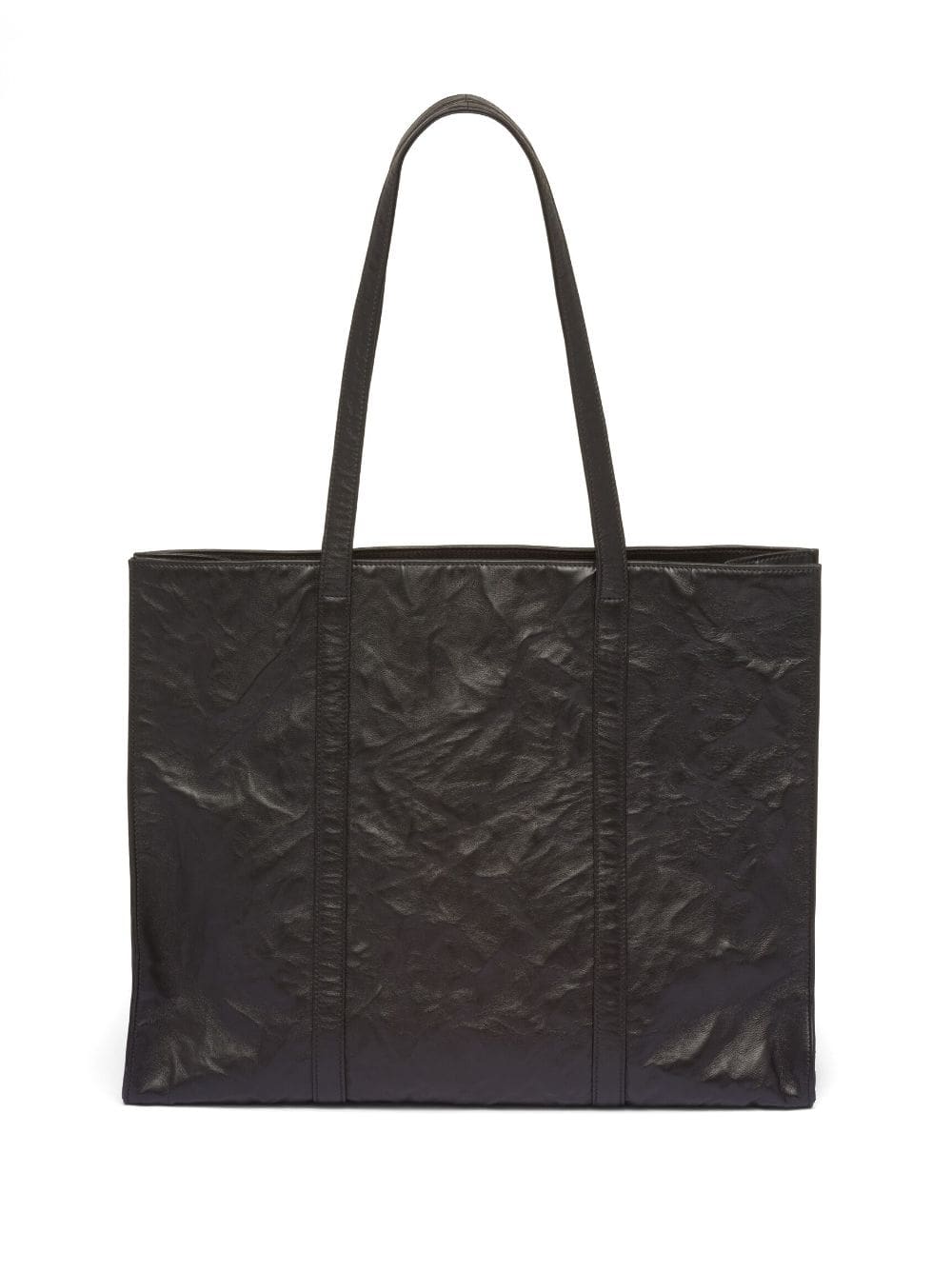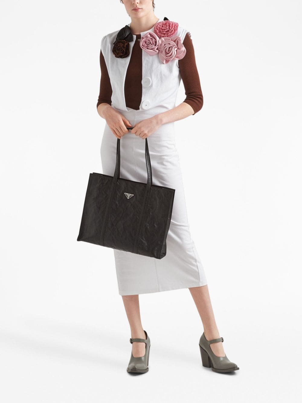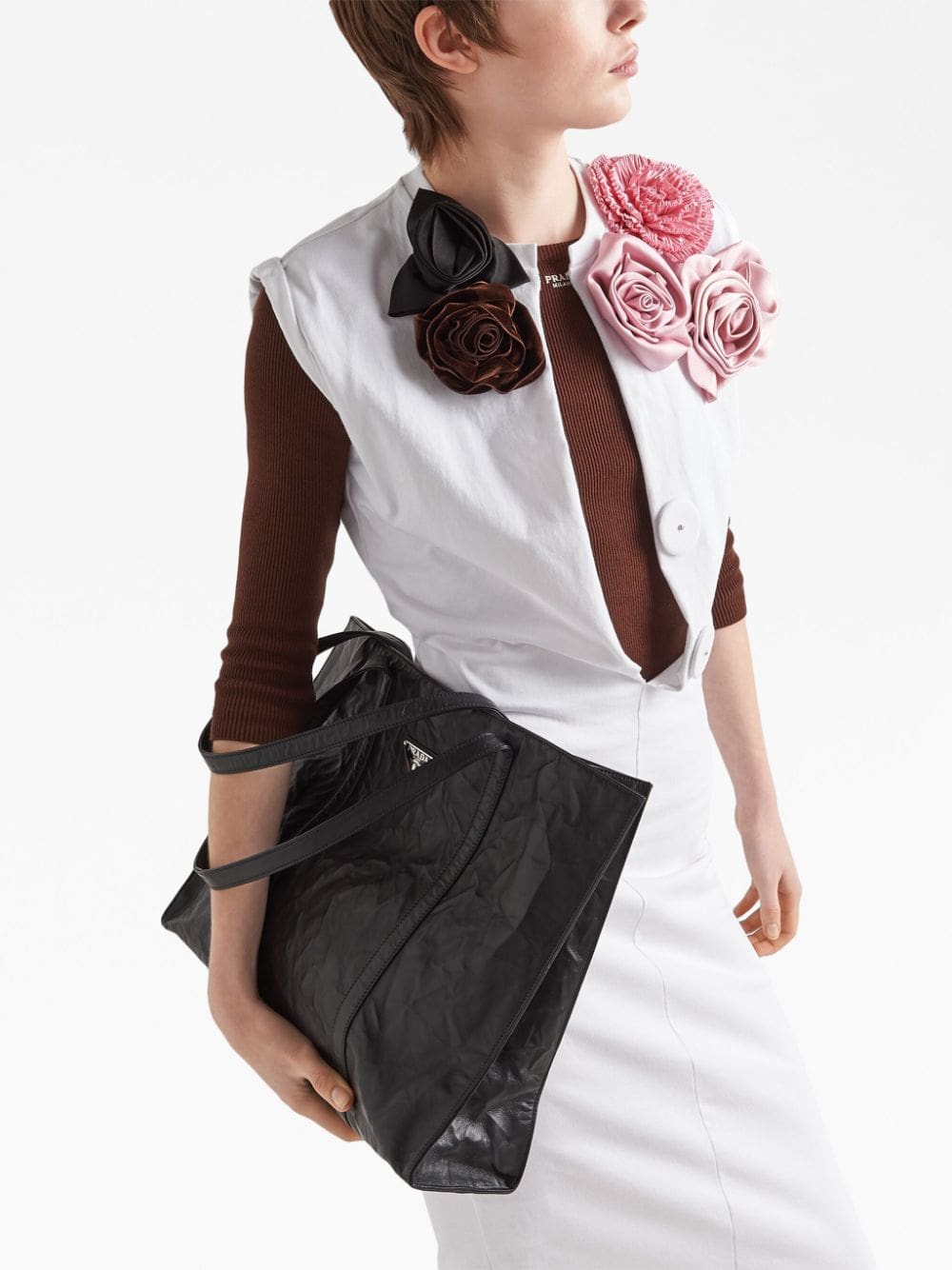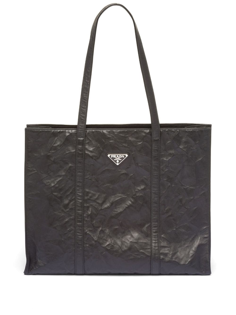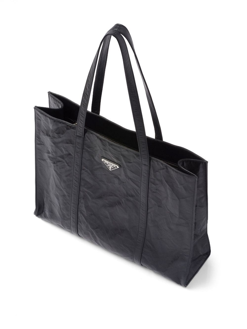 black lambskin enamel triangle logo open top two top handles main compartment internal zip-fastening pocket