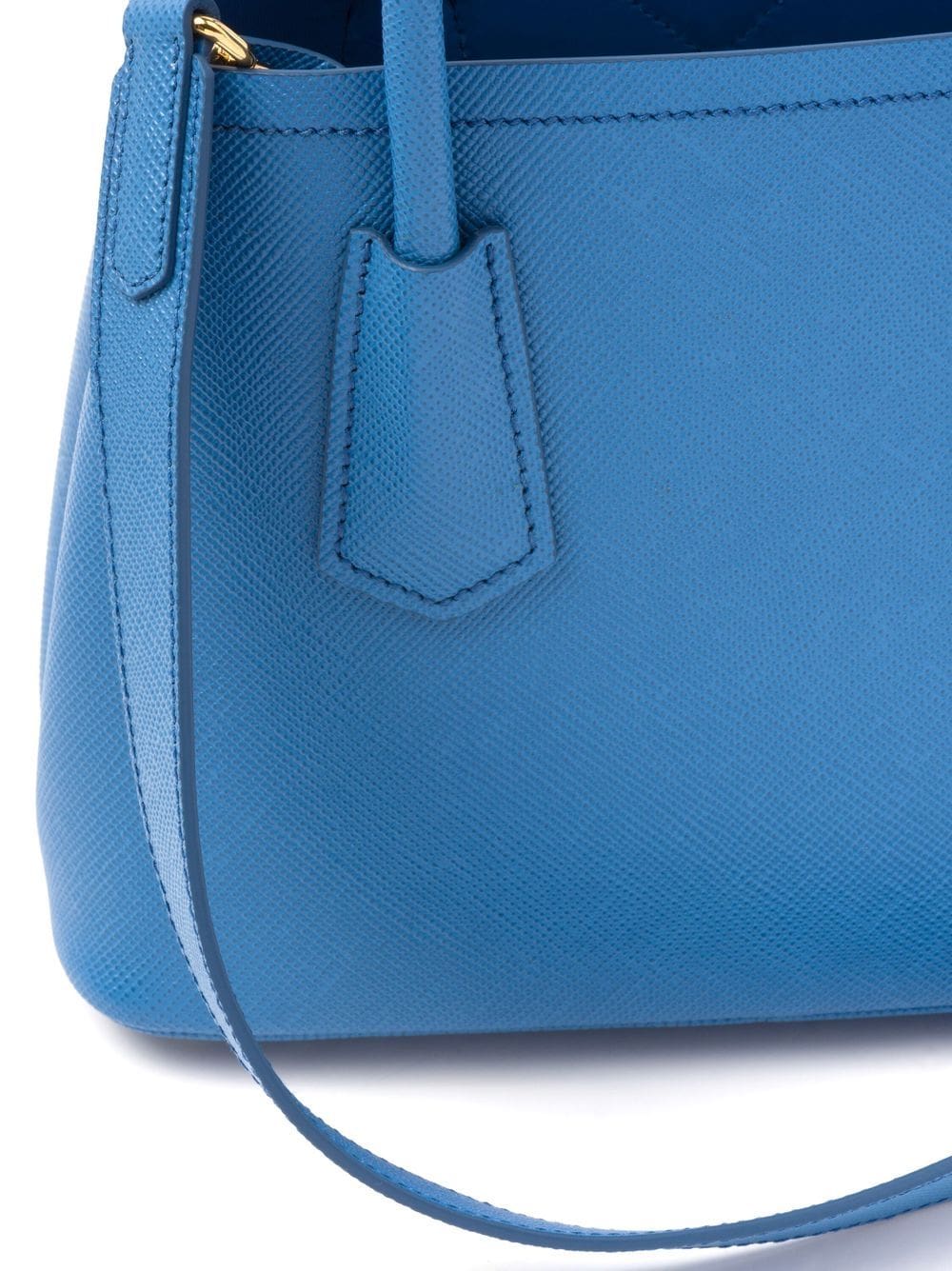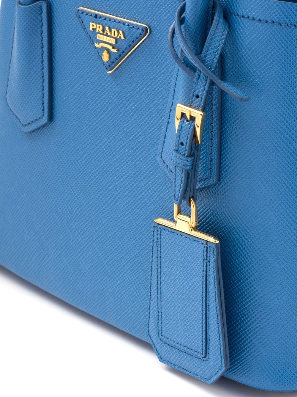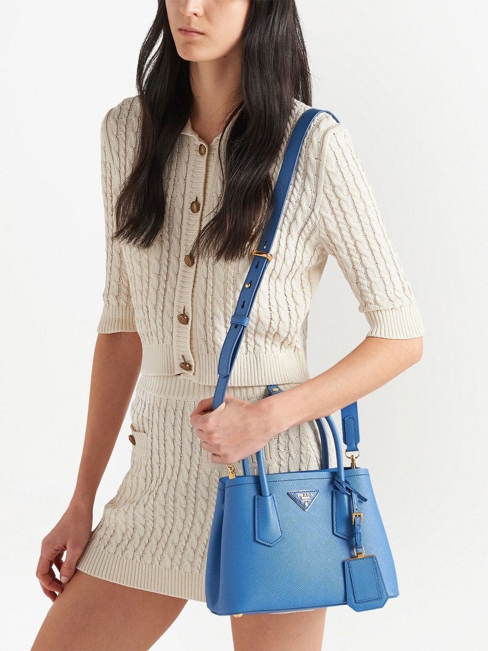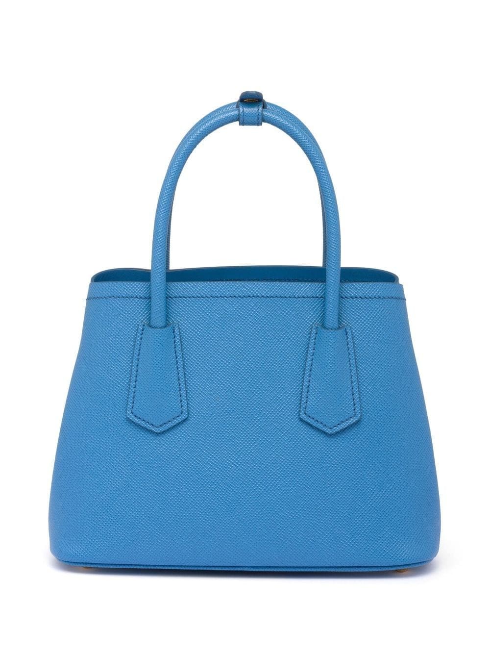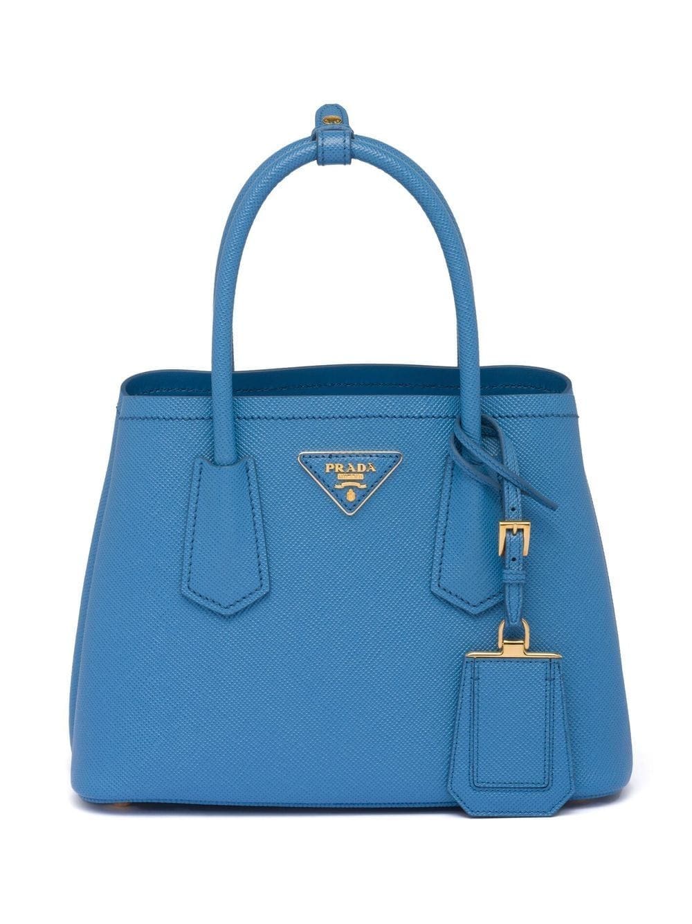 light blue leather logo patch to the front detachable shoulder strap two rounded handles to the sides partitioned compartment luggage tag