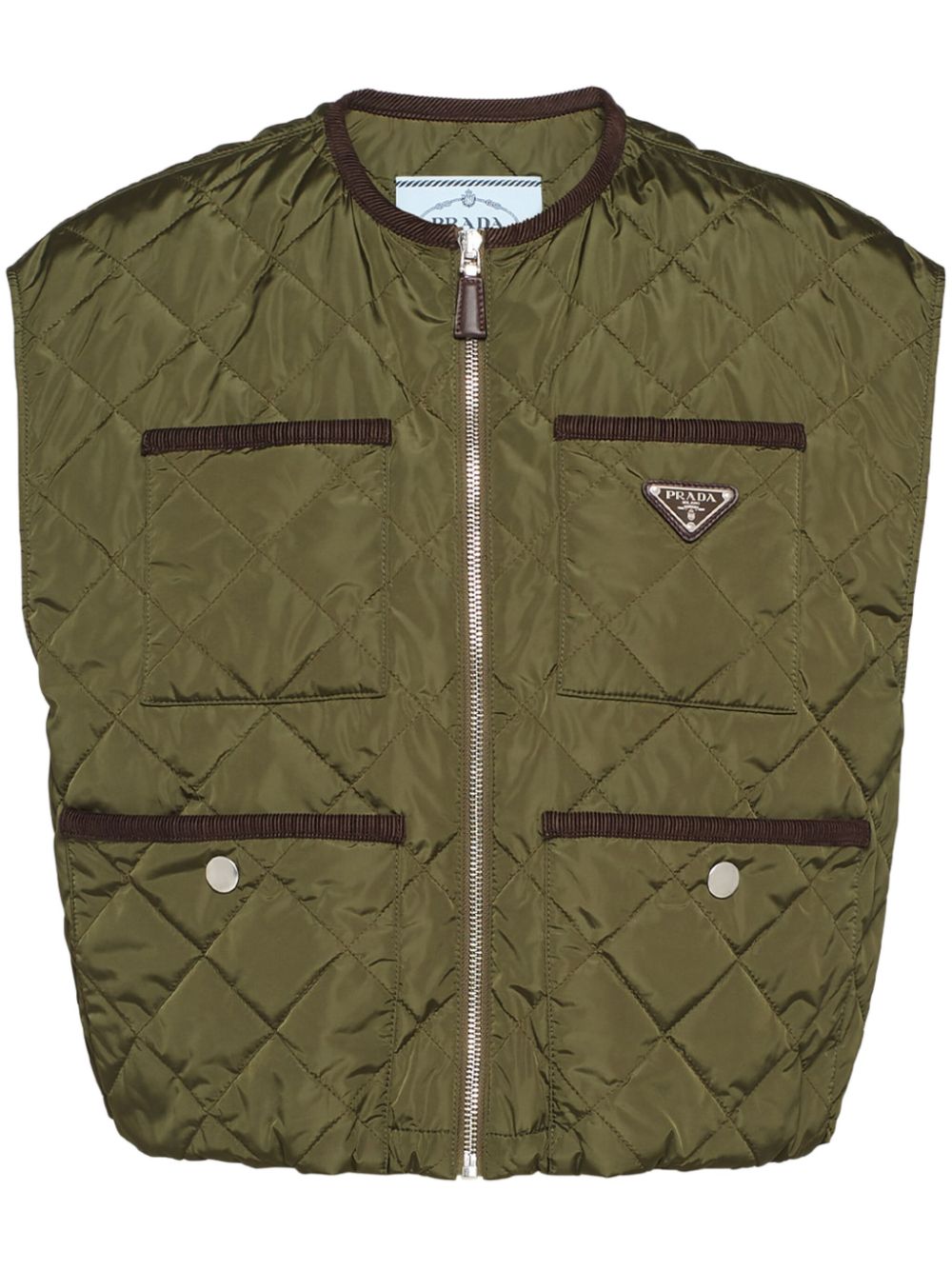 This khaki-green Prada gilet draws from utility: it's diamond-quilted, fitted with four patch pockets and threaded with a drawstring at the waist. The iconic triangle logo at the chest completes the design.