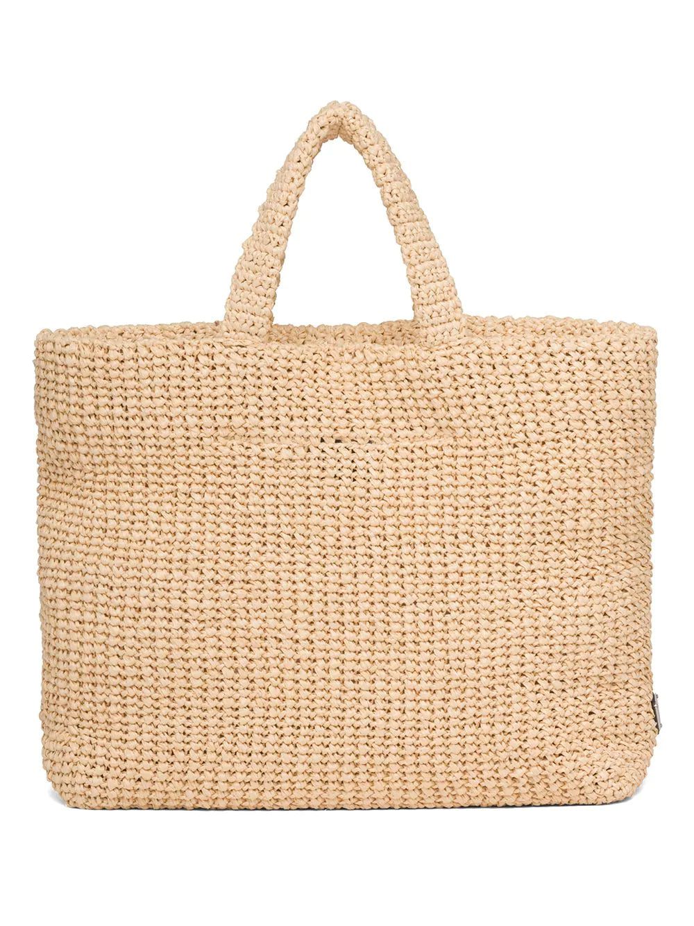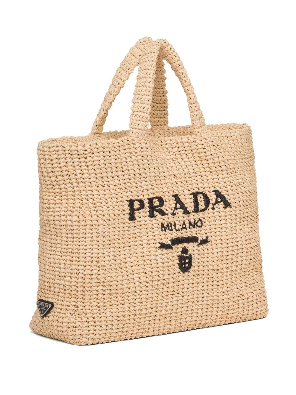 Prada's woven raffia tote bag celebrates sunnier weather. With a signature branded triangular logo plaque to one side, this practical piece shows off the label's expert Italian craftsmanship.